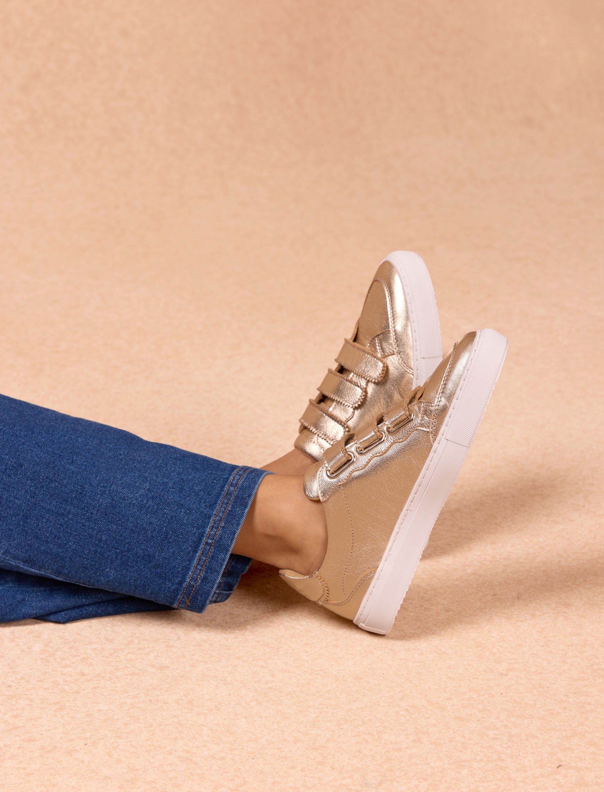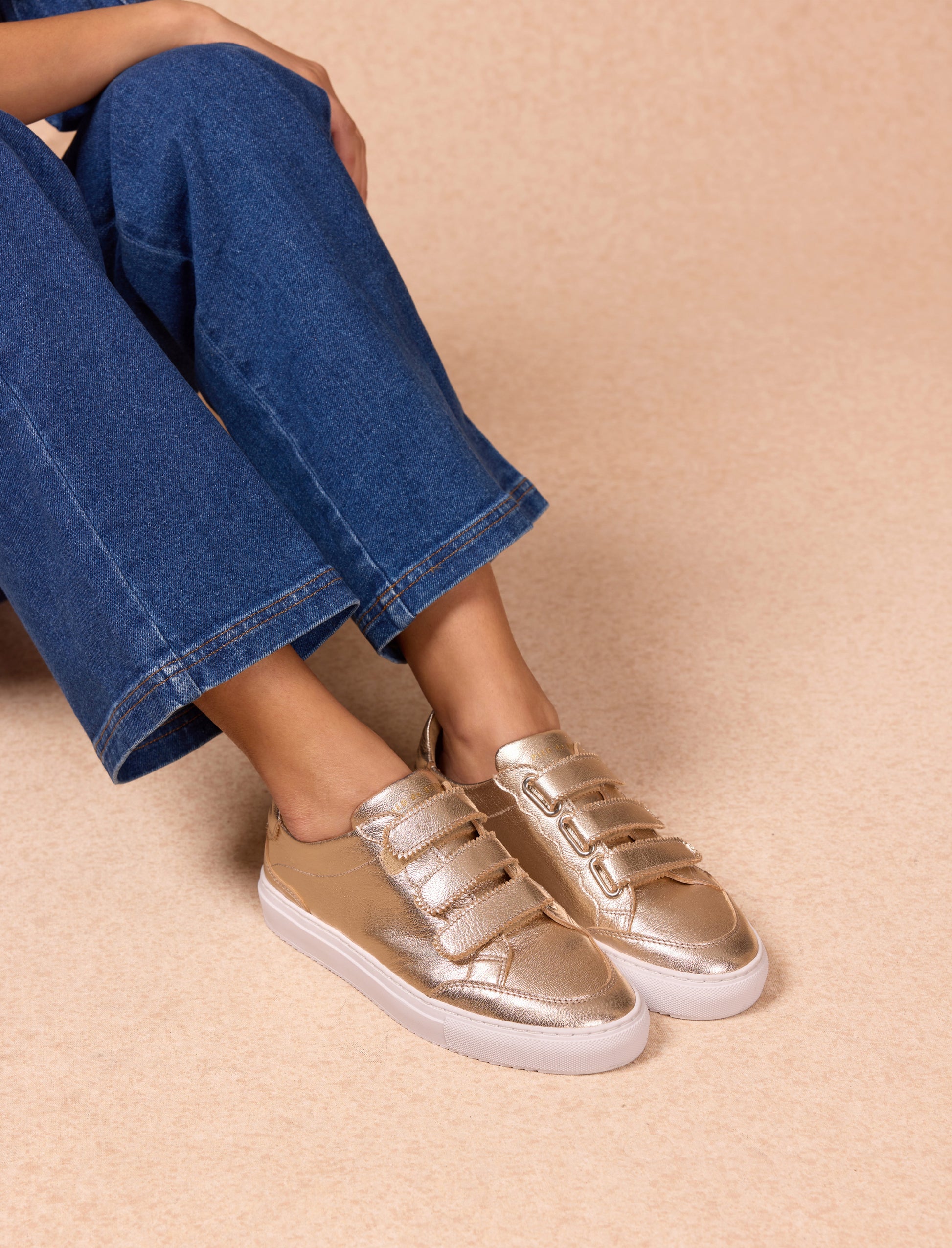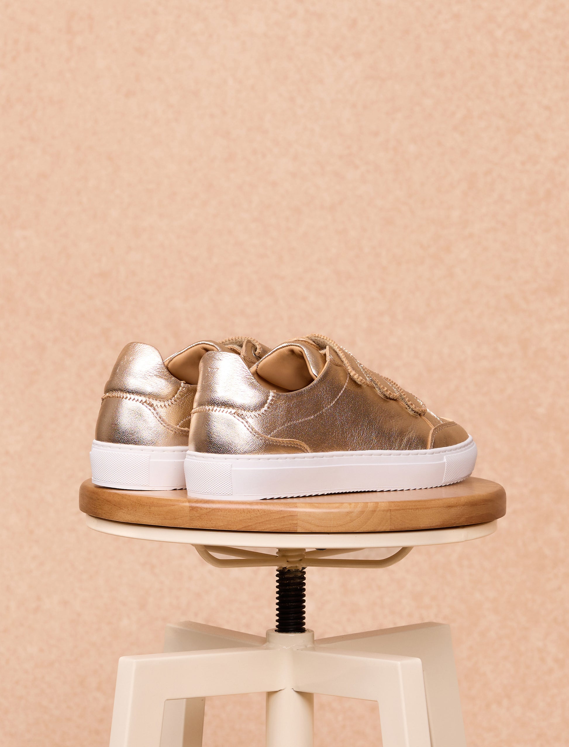 - Sneaker mit gezackten, goldglänzenden Rillen aus Rindsleder