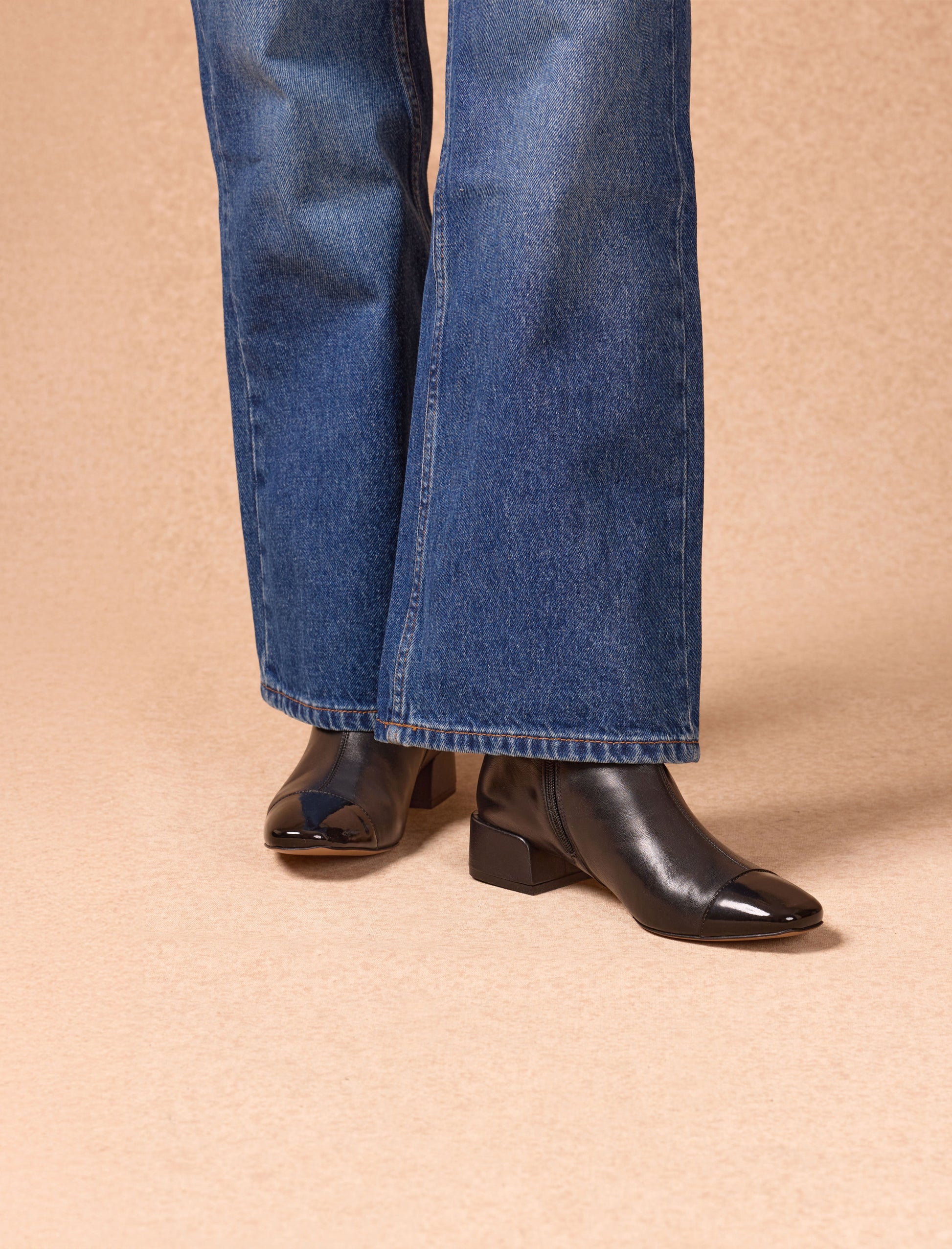 - Lackleder-Stiefeletten in glattem schwarzen Rindsleder mit zweifarbigem Design und lackiertem Lederkappen