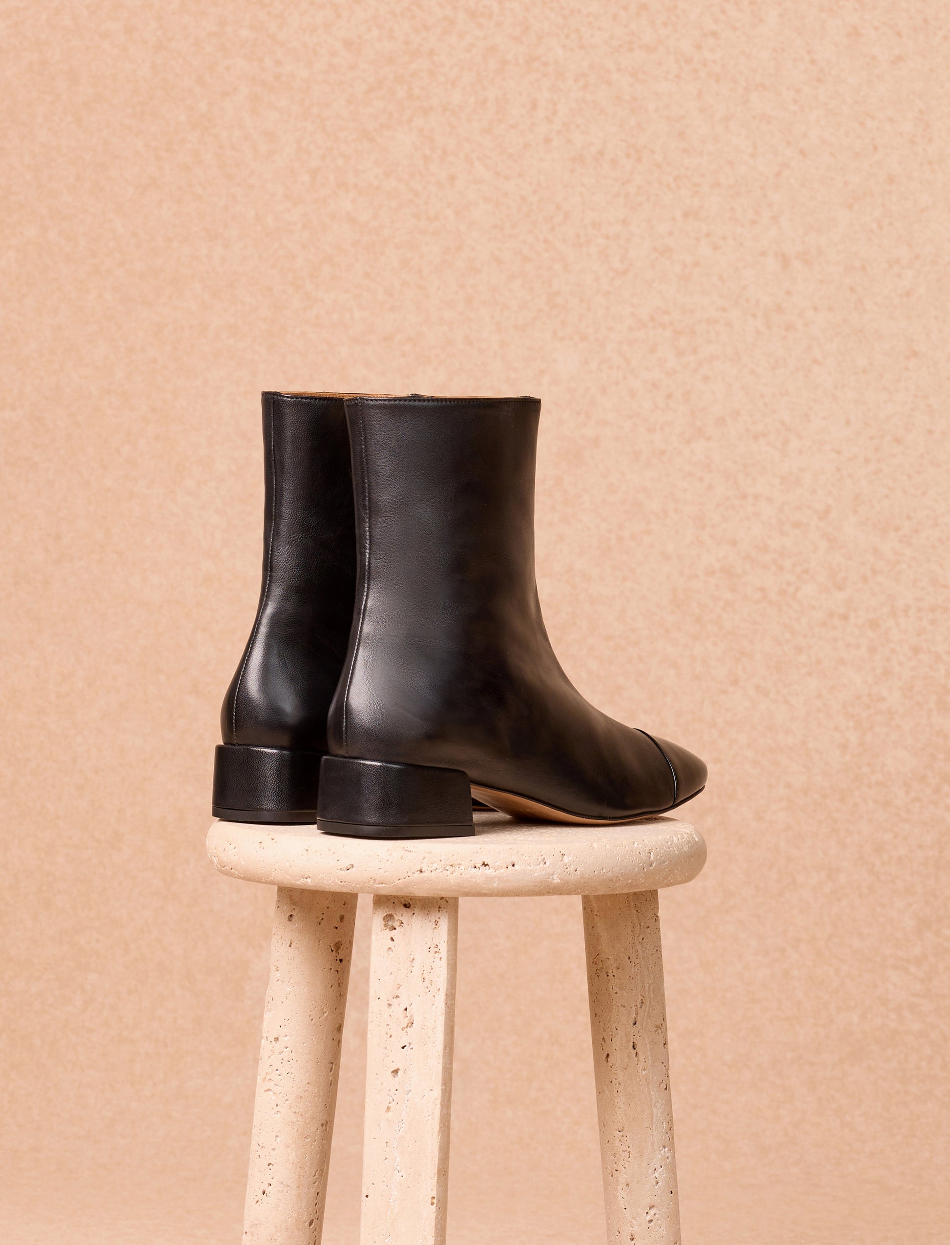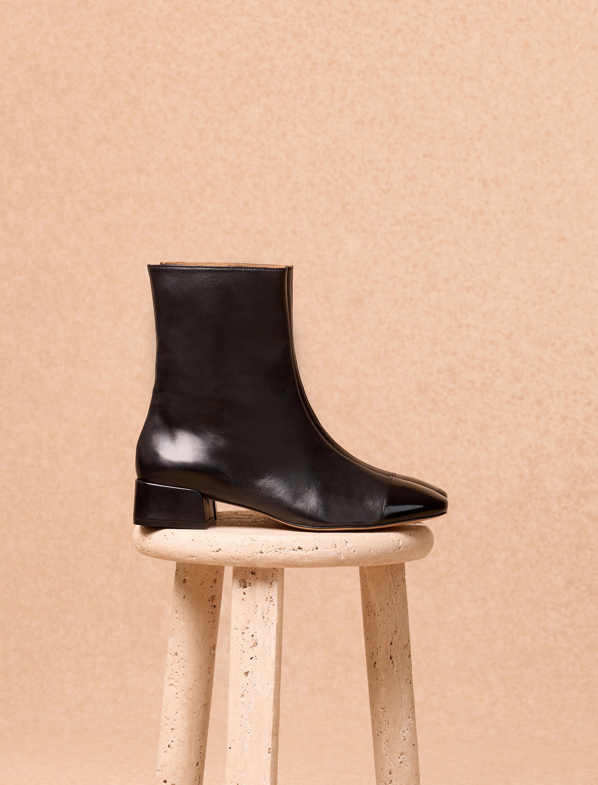 Die Alix-Stiefeletten interpretieren den Retro-Stil neu mit ihrer vorne aus Lackleder gefertigten Spitze. Ihr glattes schwarzes Leder und ihre klare Linienführung machen sie zu einem vielseitigen Begleiter im Alltag. Mit ihrem 4 cm hohen Absatz bieten diese Stiefeletten mit Schnellverschlüssen die perfekte Balance zwischen Eleganz und Tragekomfort.