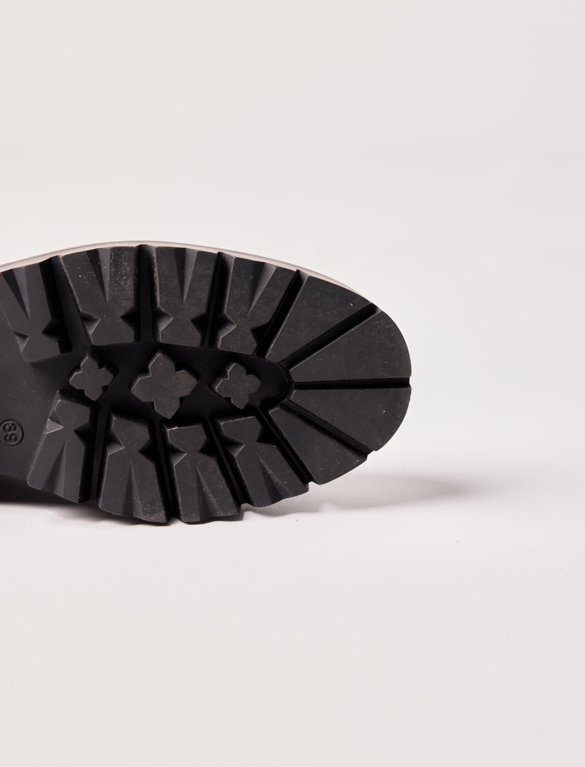 Das Hauptmaterial dieses Modells ist ein glattes, geschmeidiges und luxuriöses Rindsleder in Schwarz, sorgfältig ausgewählt bei spanischen Gerbereien. Die profilierte Sohle und das elastische Element, verziert mit aufgenähten Velourslederstreifen, verleihen diesem Boot eine markante Ausstrahlung. Verleihen Sie Ihrem Look mit Bianca einen modernen Touch.