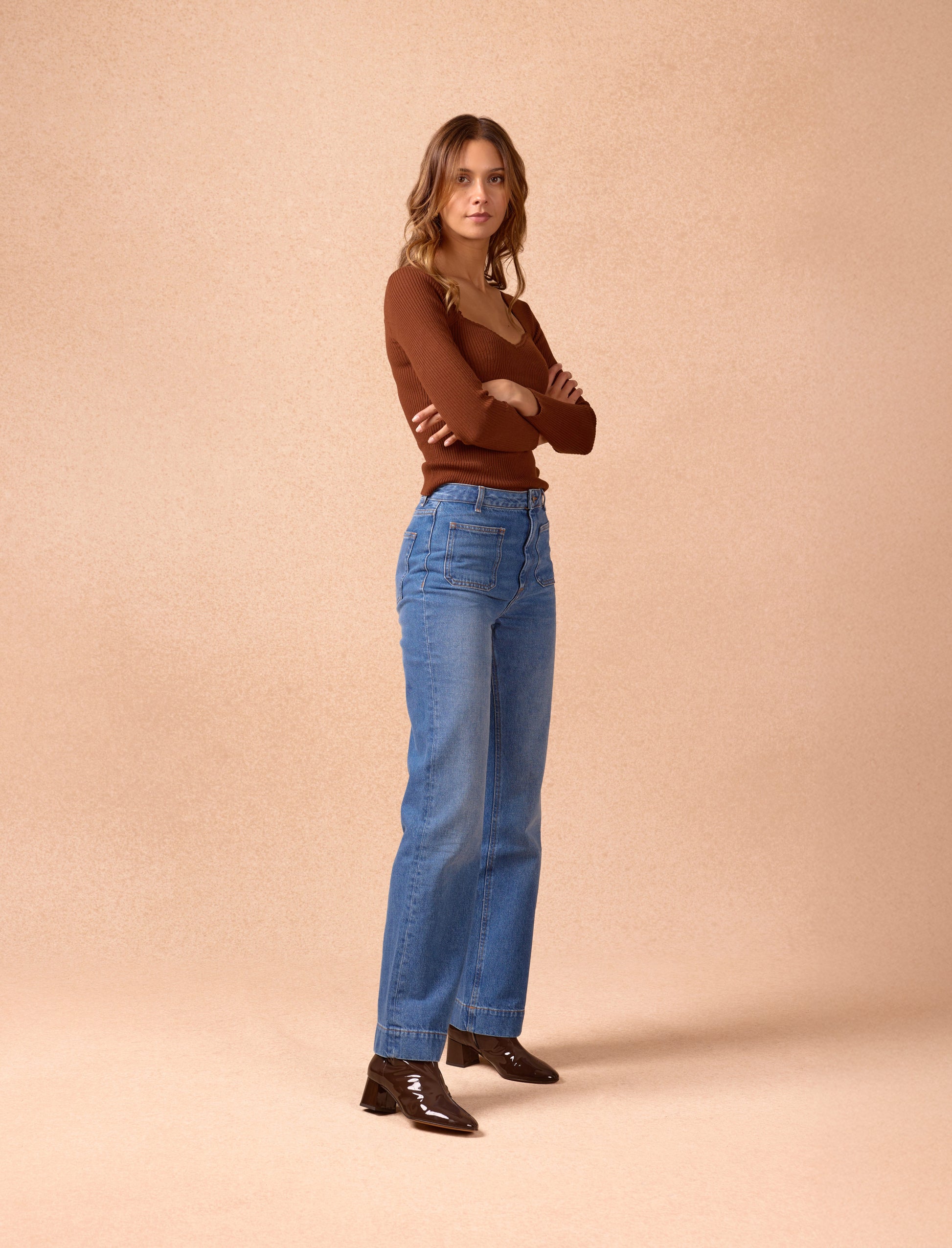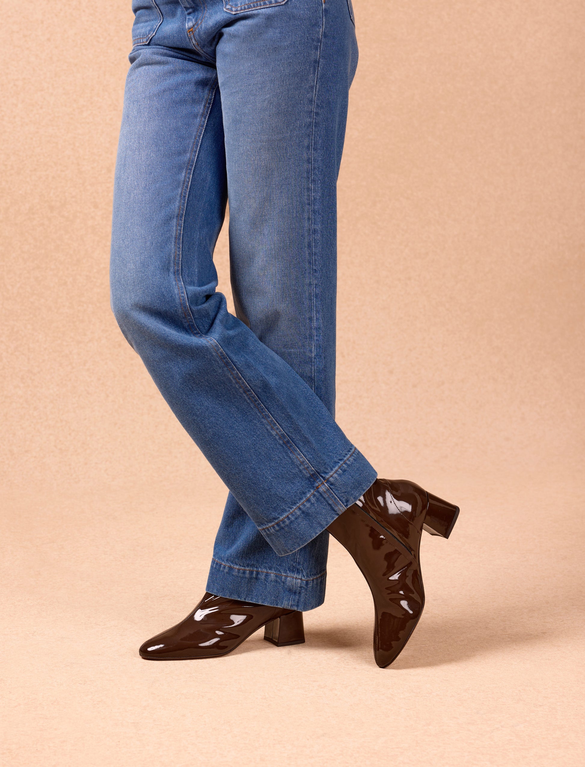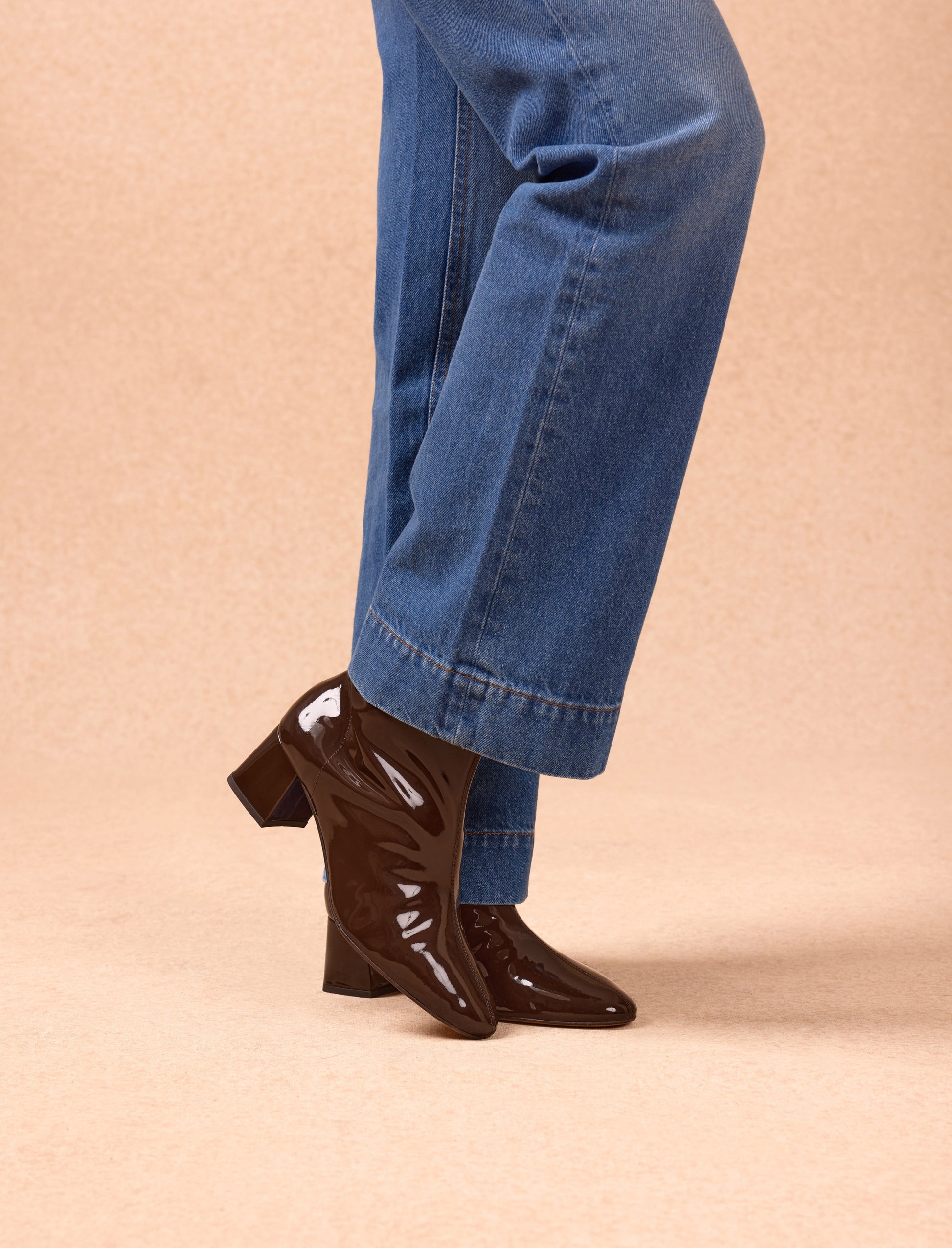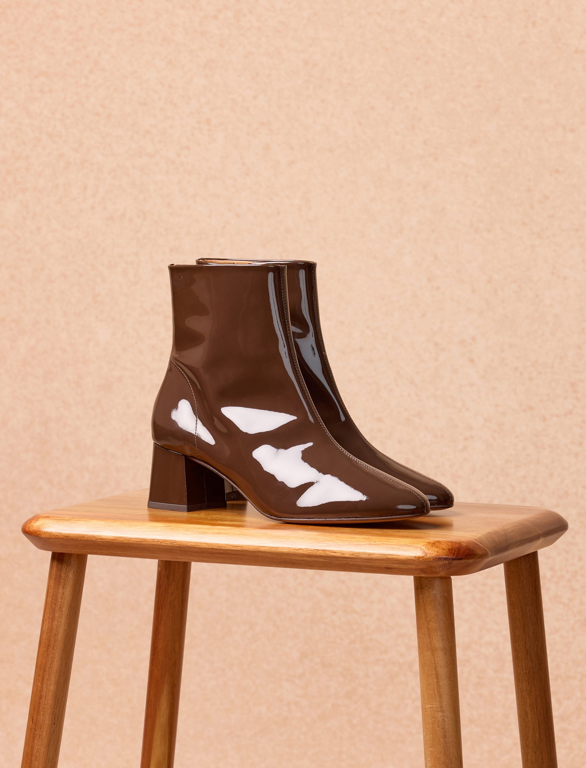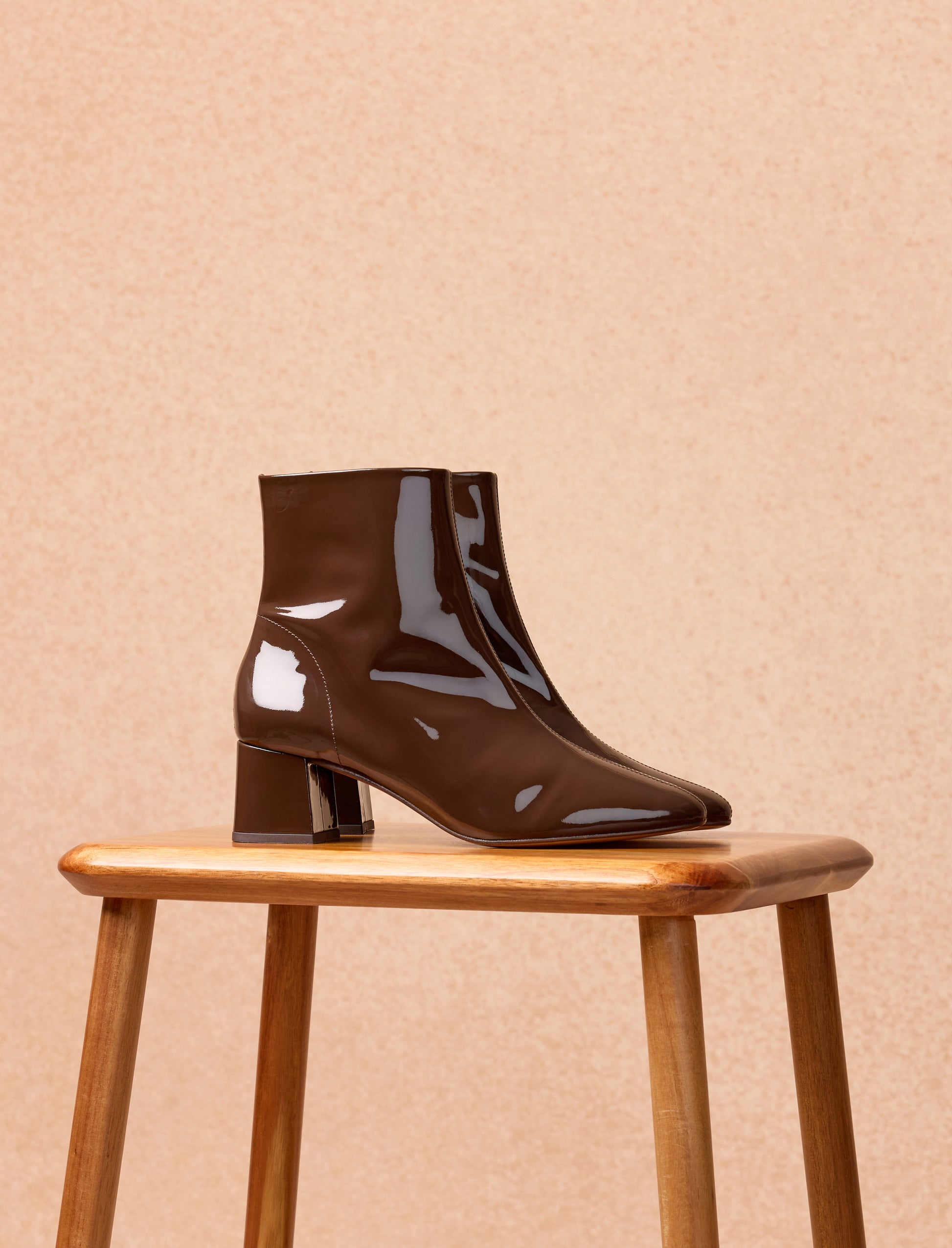 - Stiefeletten aus glänzend braunem Rindsleder mit Innenreißverschluss, verdeckt von Leder, und Lederlasche