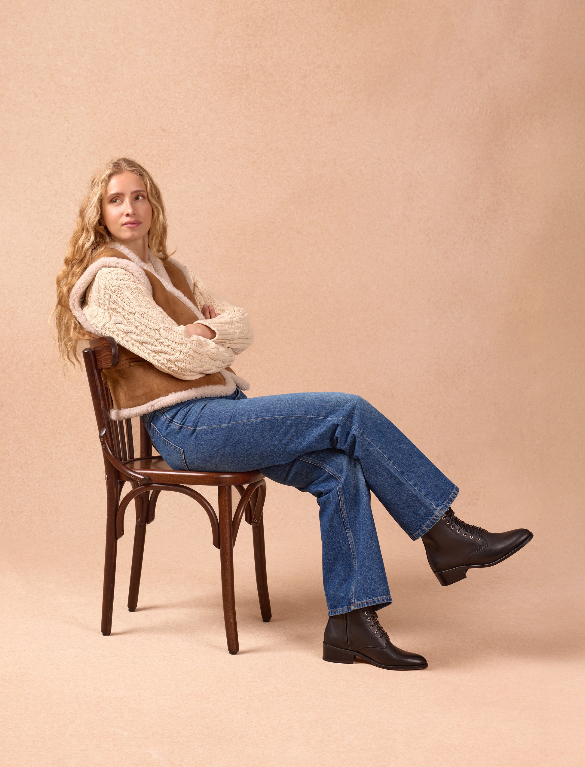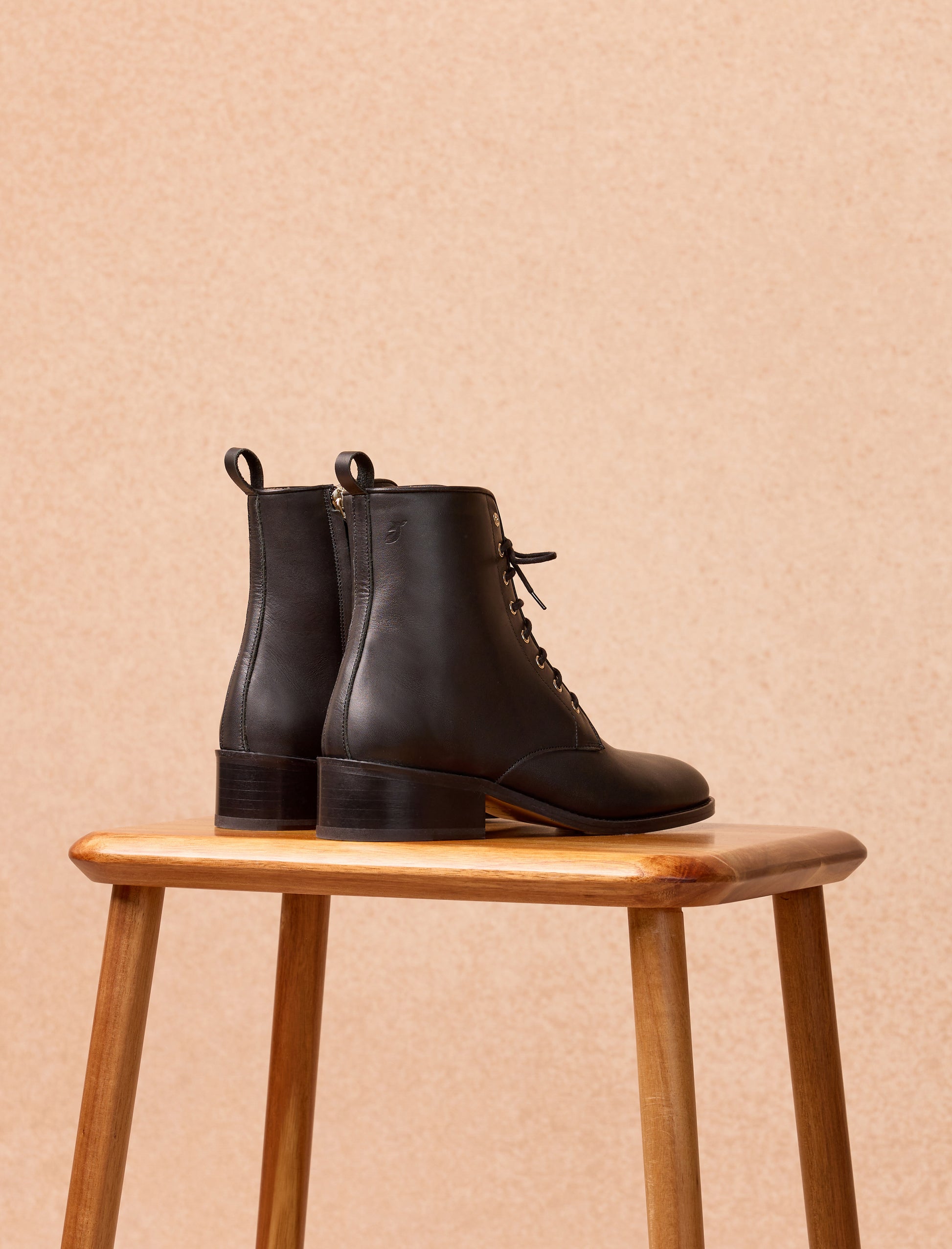 - Stiefel Solène aus glattem Rindsleder in Schwarz Volllederfutter aus Rindsleder Außensohle aus Leder mit schwarzem Rand Leder aus Portugal Seile aus gewachster Baumwolle mit 8 Ösen und metallischen Ösen Glatte Lederpaspel Reißverschluss mit Lederzugband, verdeckt Schwarze Spitze Absatz 4 cm Schafthöhe: 14 cm Hergestellt in Portugal Geliefert in einer FSC-zertifizierten Papierbox