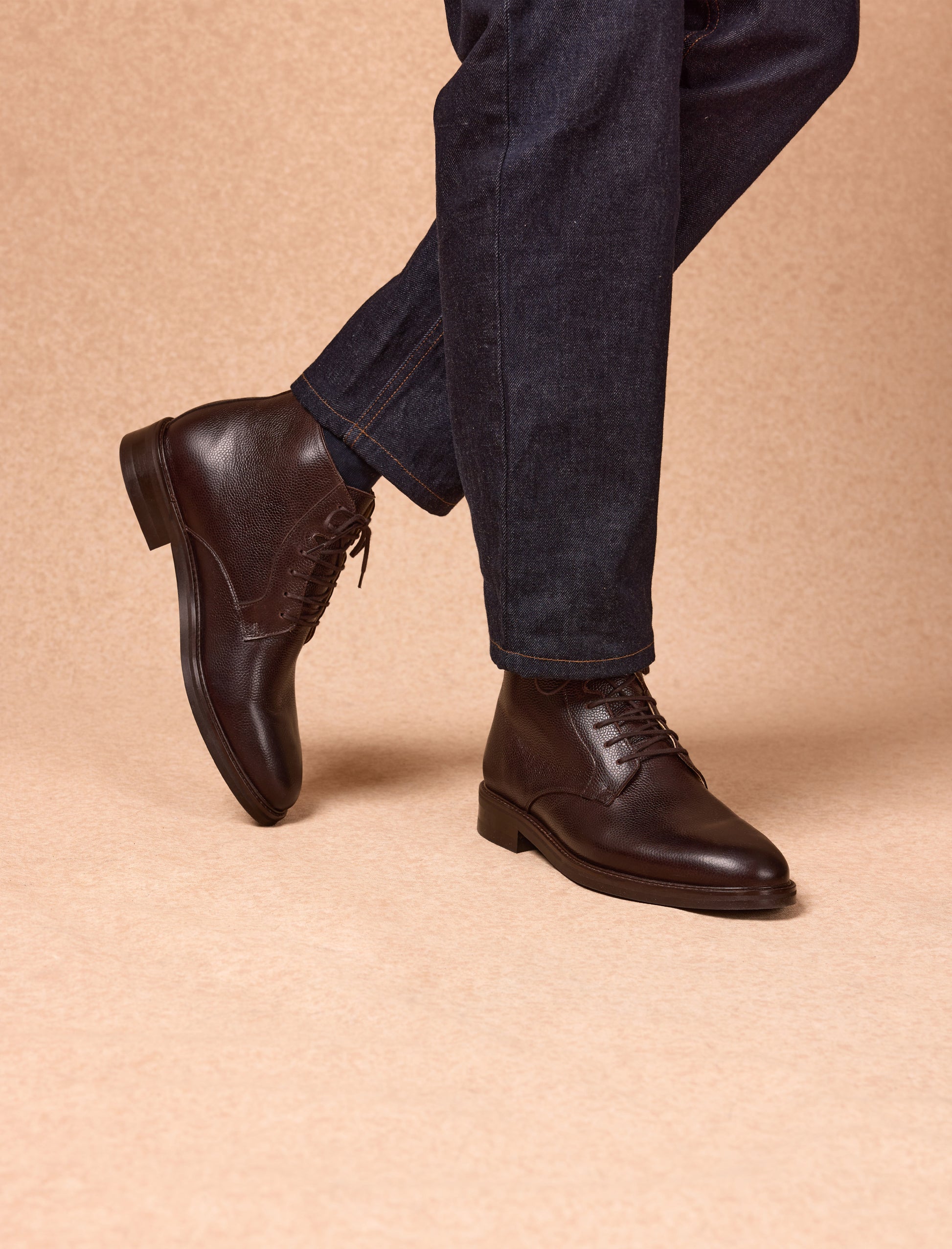 Die Gaspard Chukka-Stiefel aus braunem, geprägtem Rindsleder aus Spanien verbinden Robustheit mit Komfort. Das Lederfutter, kombiniert mit einer Gummiprofilsohle und einer Blake-Nahtkonstruktion, sorgt für sicheren Halt und Langlebigkeit im Alltag. Ein zuverlässiges Paar, das Sie in jeder Situation begleitet.