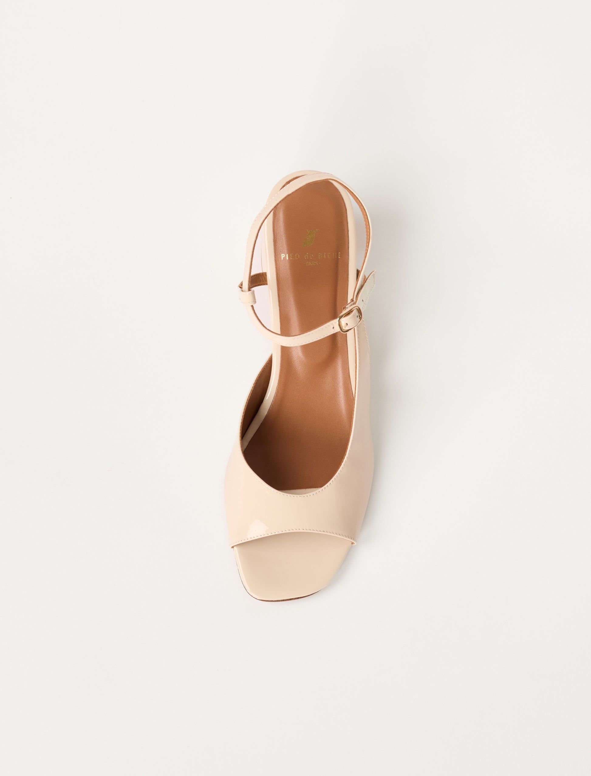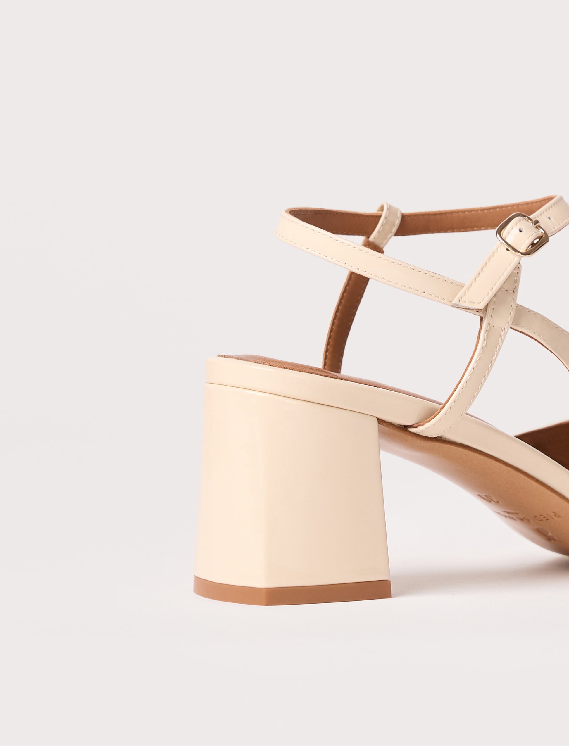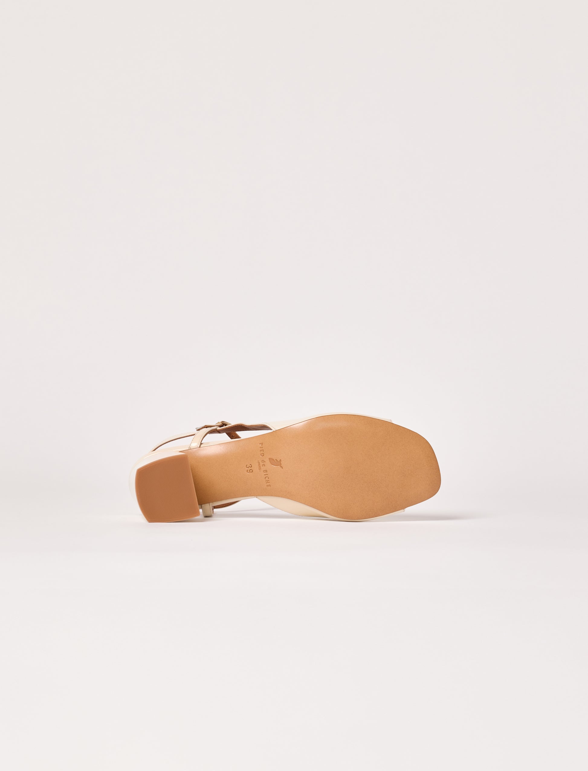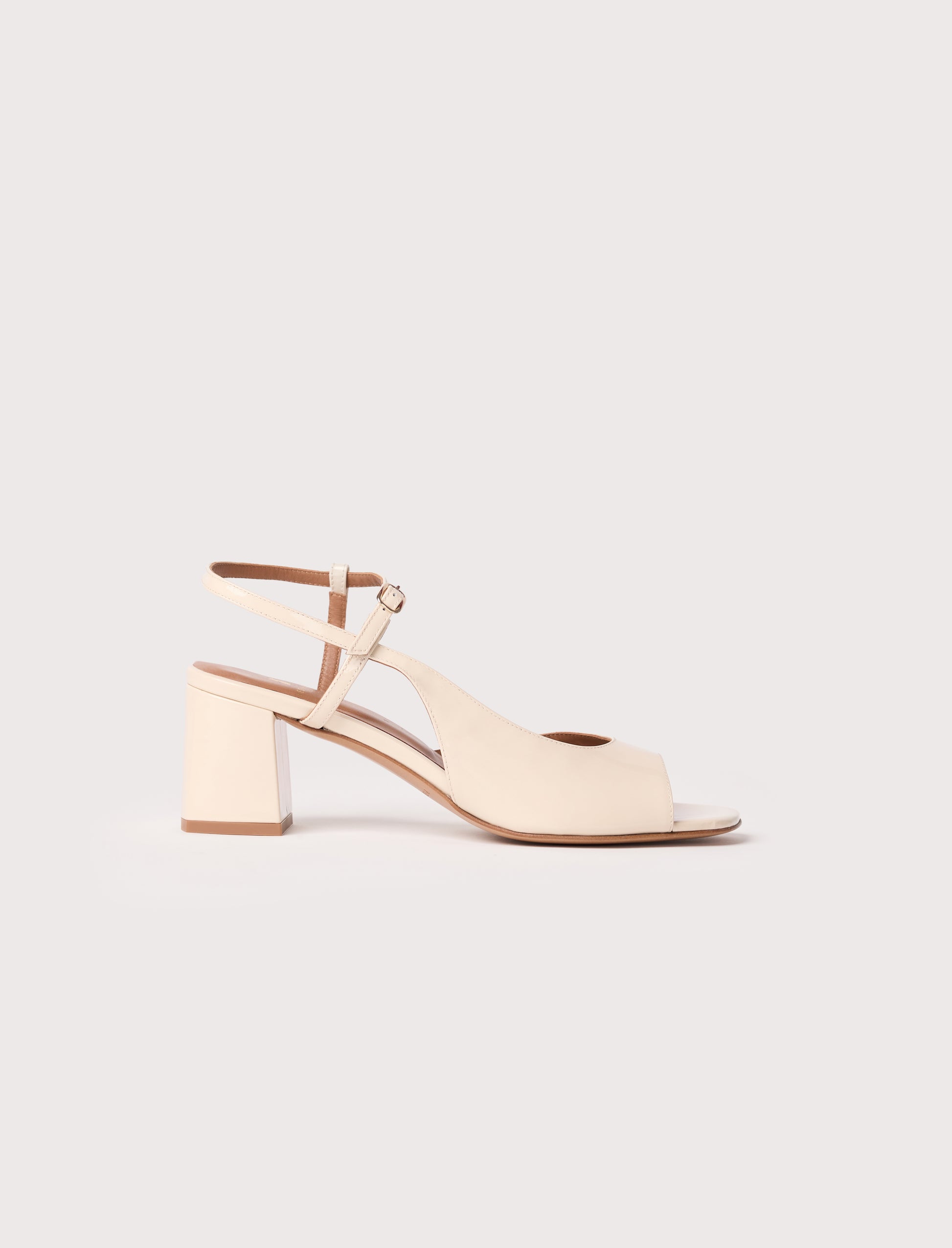 - Asymmetrische Sandale aus ivoirefarbenem, hochglänzendem Rindsleder