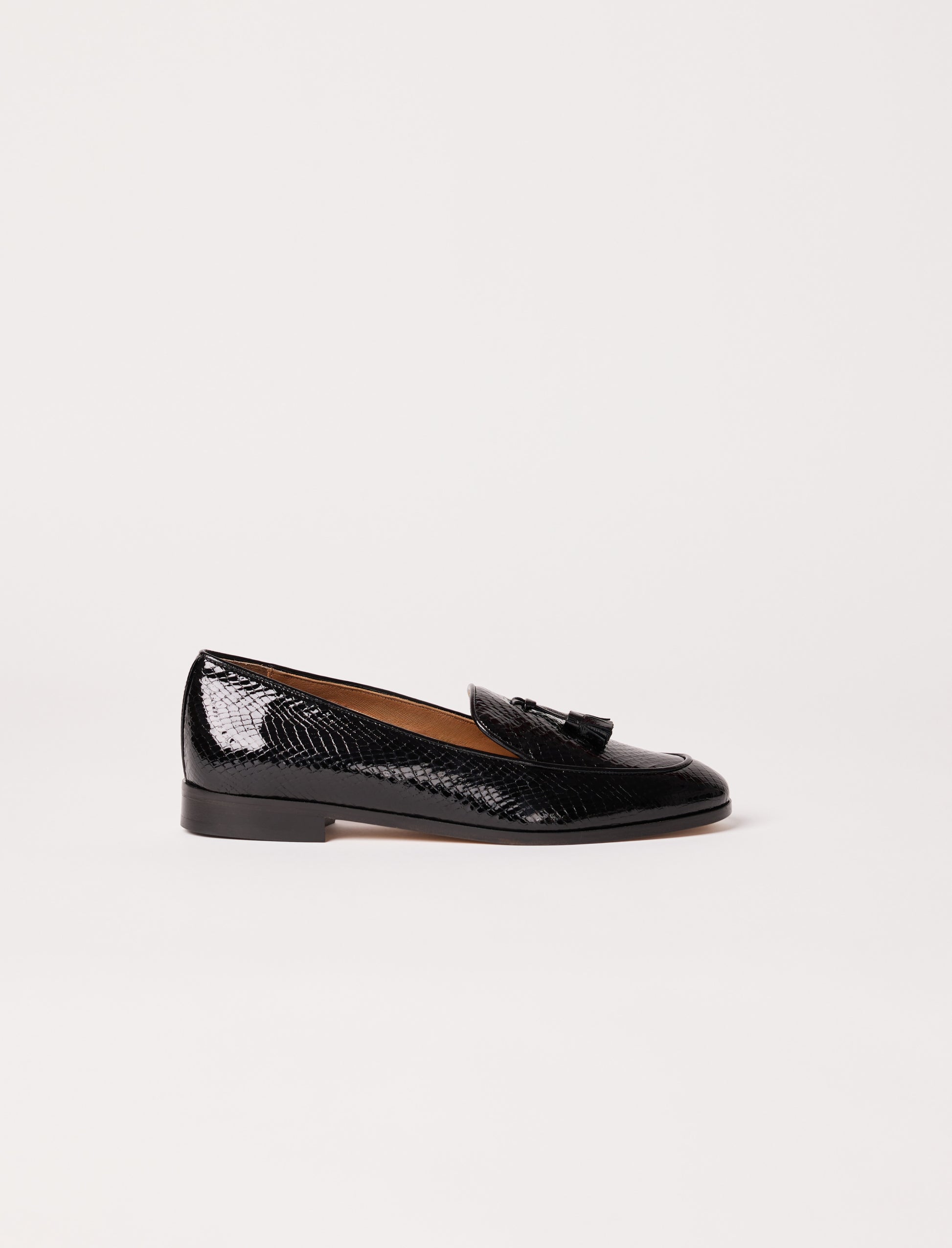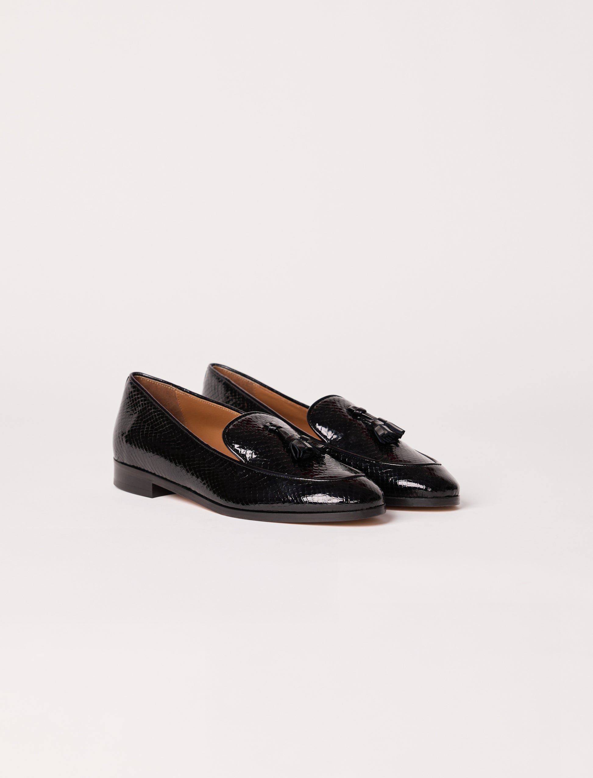 - Lederpumps aus Rindsleder mit verzierten Fransen aus lackiertem Schlangenmustermotiv
