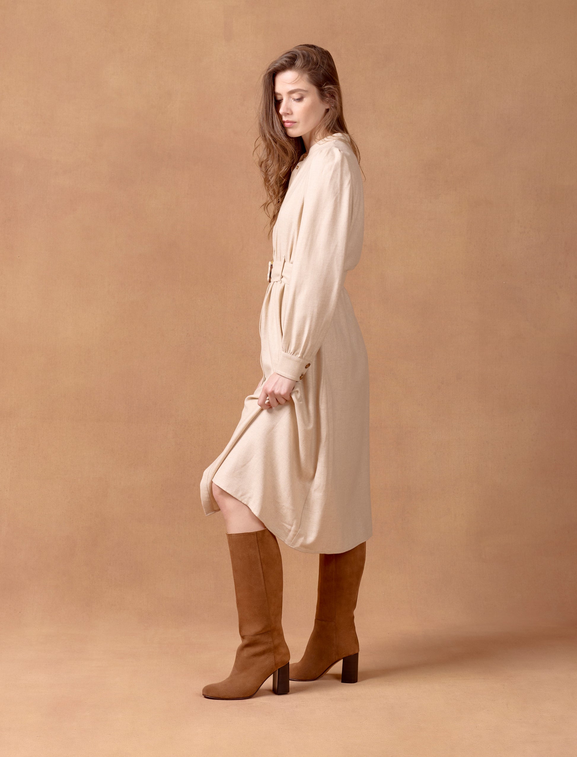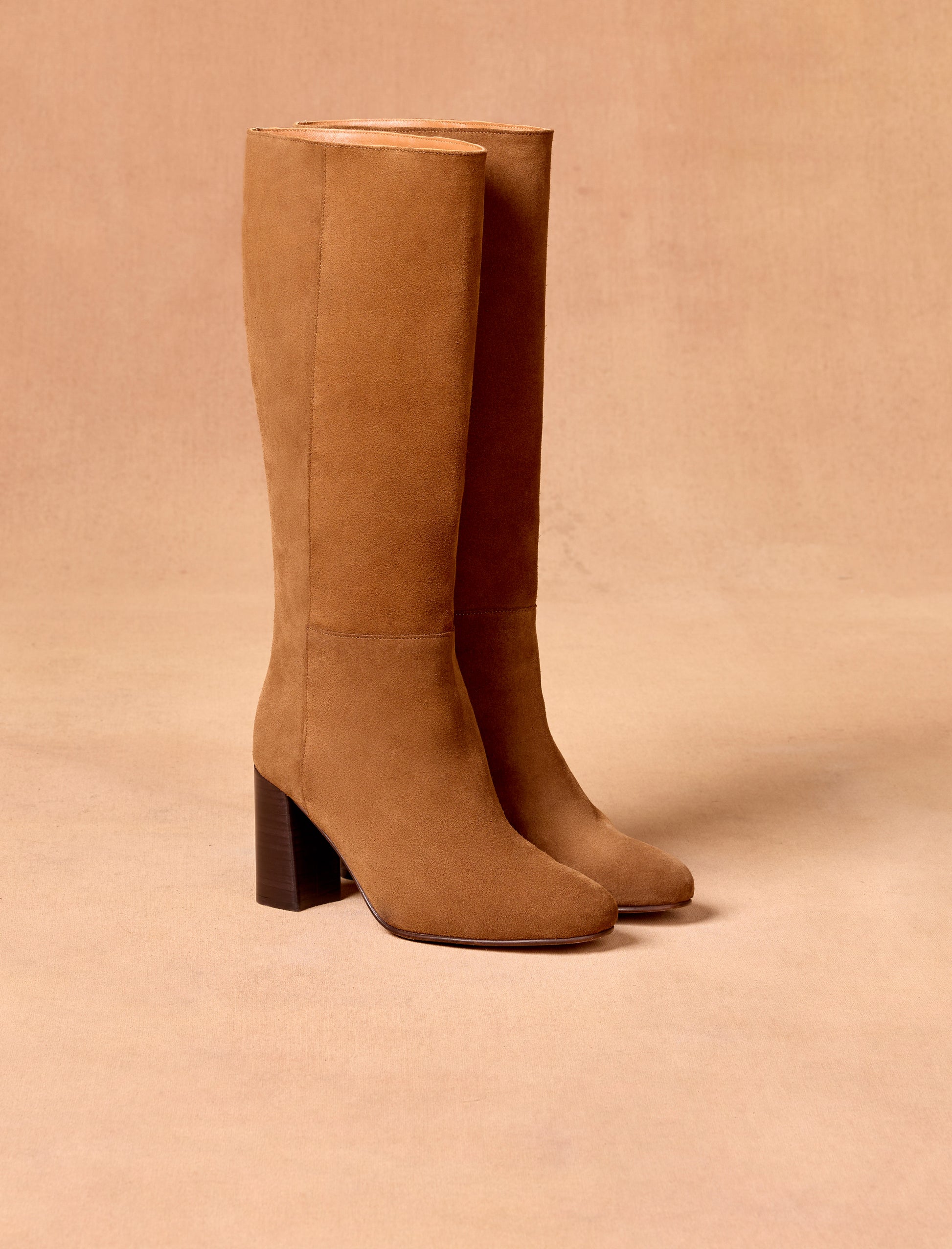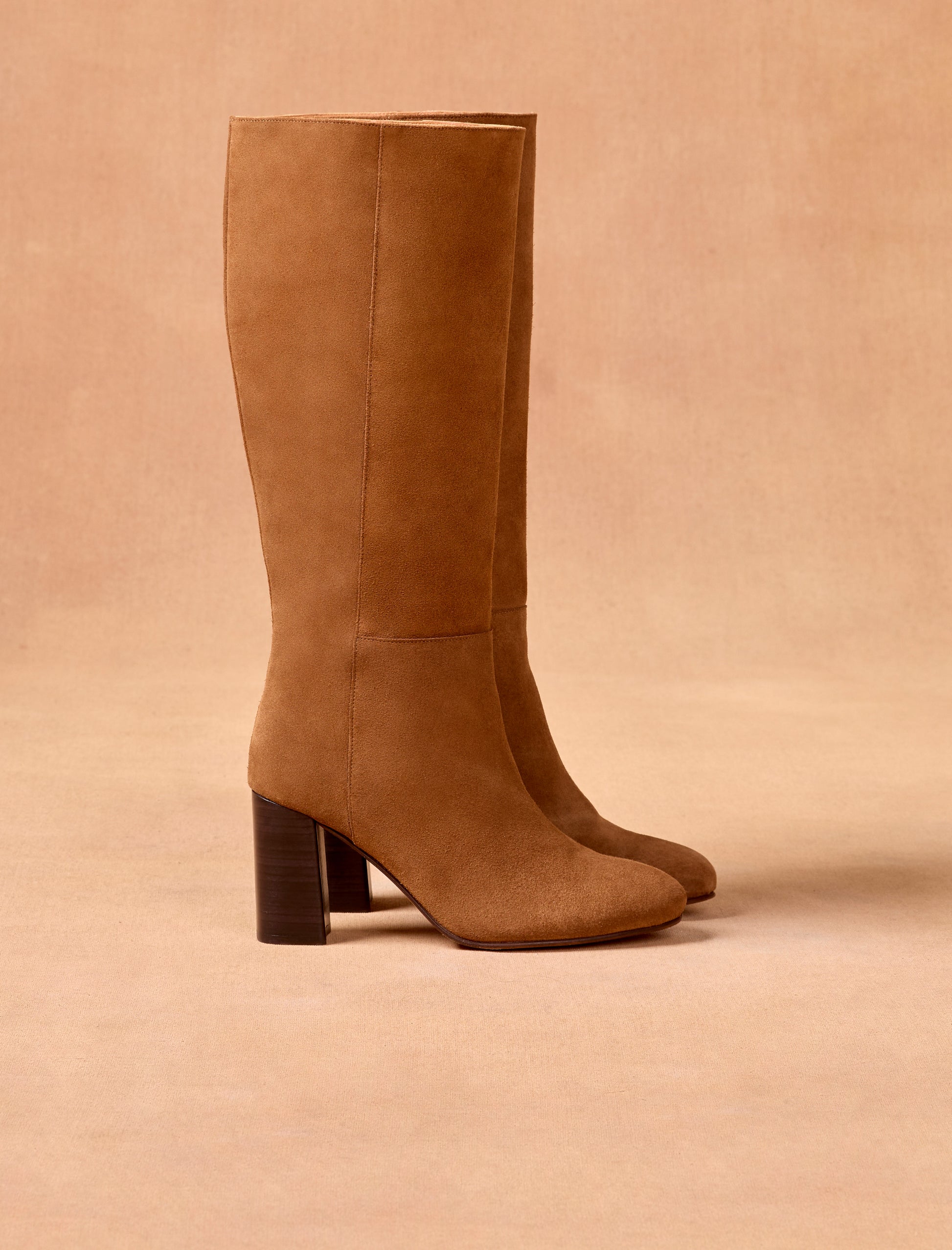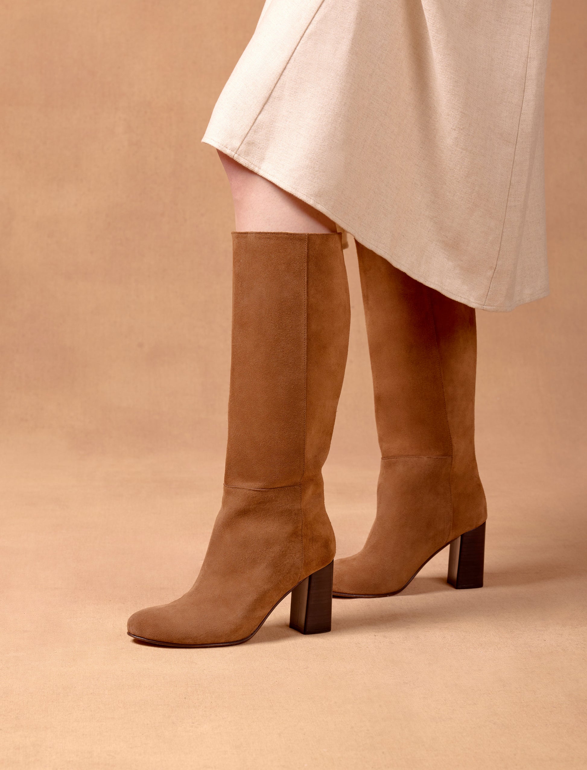 Unsere Nora-Stiefel sind sorgfältig aus kastanienbraunem Wildleder gefertigt, das von den renommiertesten Gerbereien Italiens stammt. Die sichtbaren Nähte entlang der gesamten Länge verleihen diesem Stiefelmodell einen klassischen Akzent. Der 8 cm hohe Absatz hebt Ihre Silhouette hervor und sorgt für eine elegante, feminine Ausstrahlung.