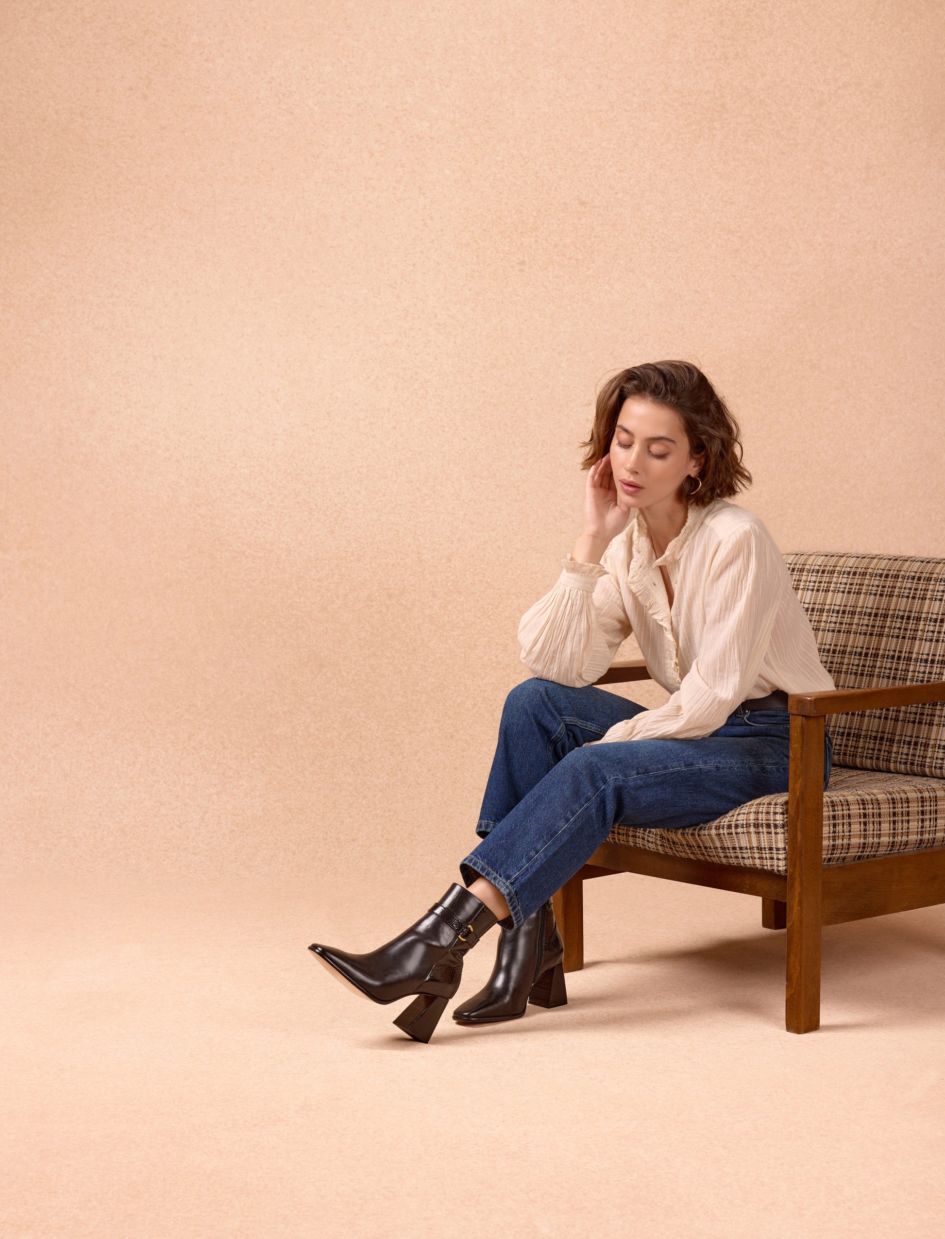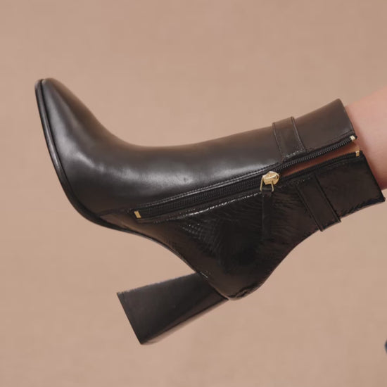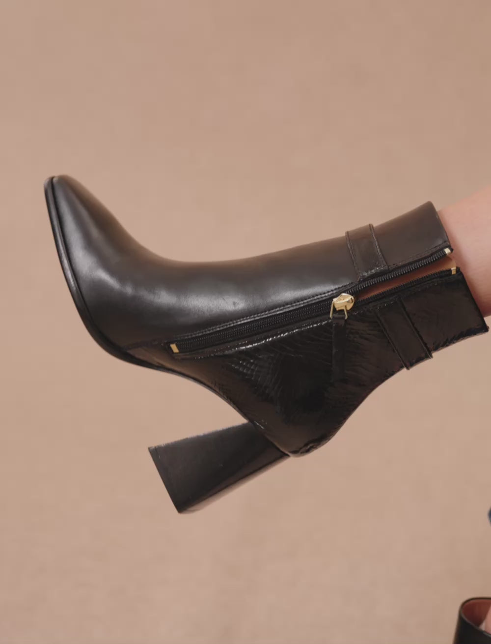 Die Stiefeletten Olympe spielen mit verschiedenen Texturen für einen selbstbewussten und eleganten Look. Gefertigt aus glattem Leder und embossedem Lackleder, werden sie durch einen Schuppenmuster-Gurt und einen goldfarbenen Metallring akzentuiert. Mit ihrem 8 cm hohen Absatz strecken sie die Silhouette und bieten gleichzeitig den ganzen Tag über Komfort.