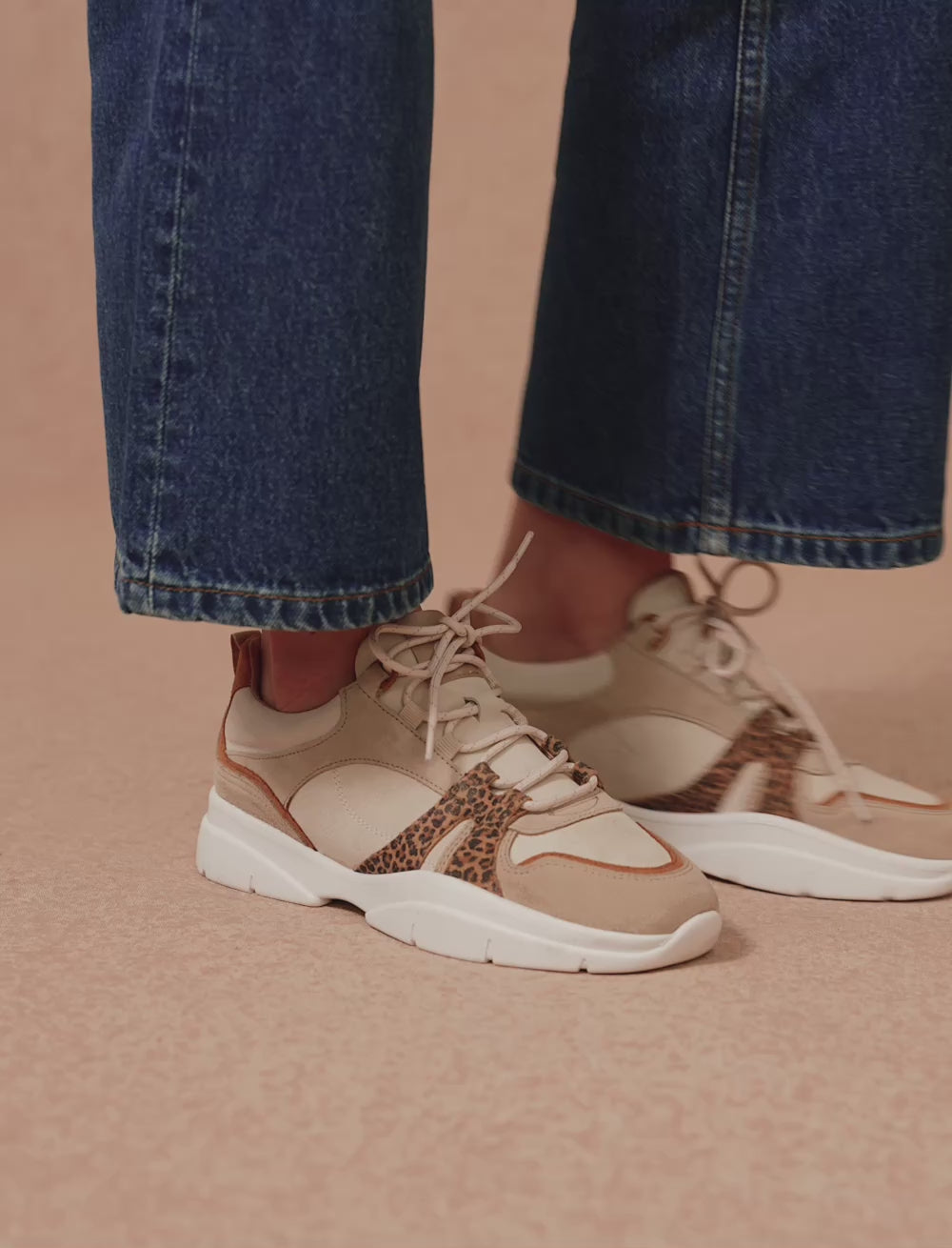 Pied de Biche stellt sein neues Paar Sneakers vor, mit einer dicken Sohle im urbanen, entspannten Look. Das Modell Paola besteht aus sandfarbenem Veloursleder, veredelt durch Details aus Leopardenmuster-Velours. Alle Lederelemente, sorgfältig in Italien ausgewählt, gewährleisten höchste Qualität und unvergleichlichen Tragekomfort.