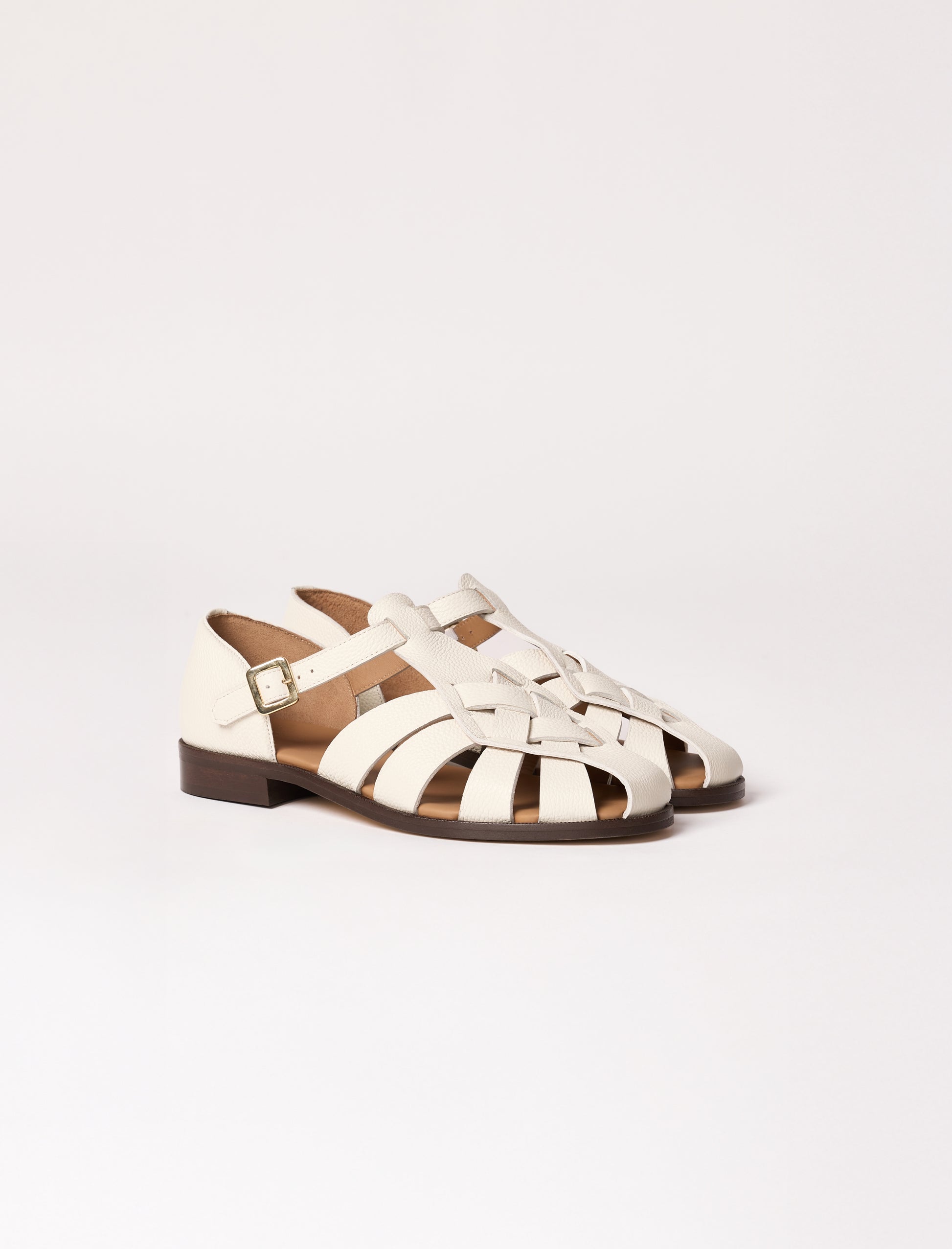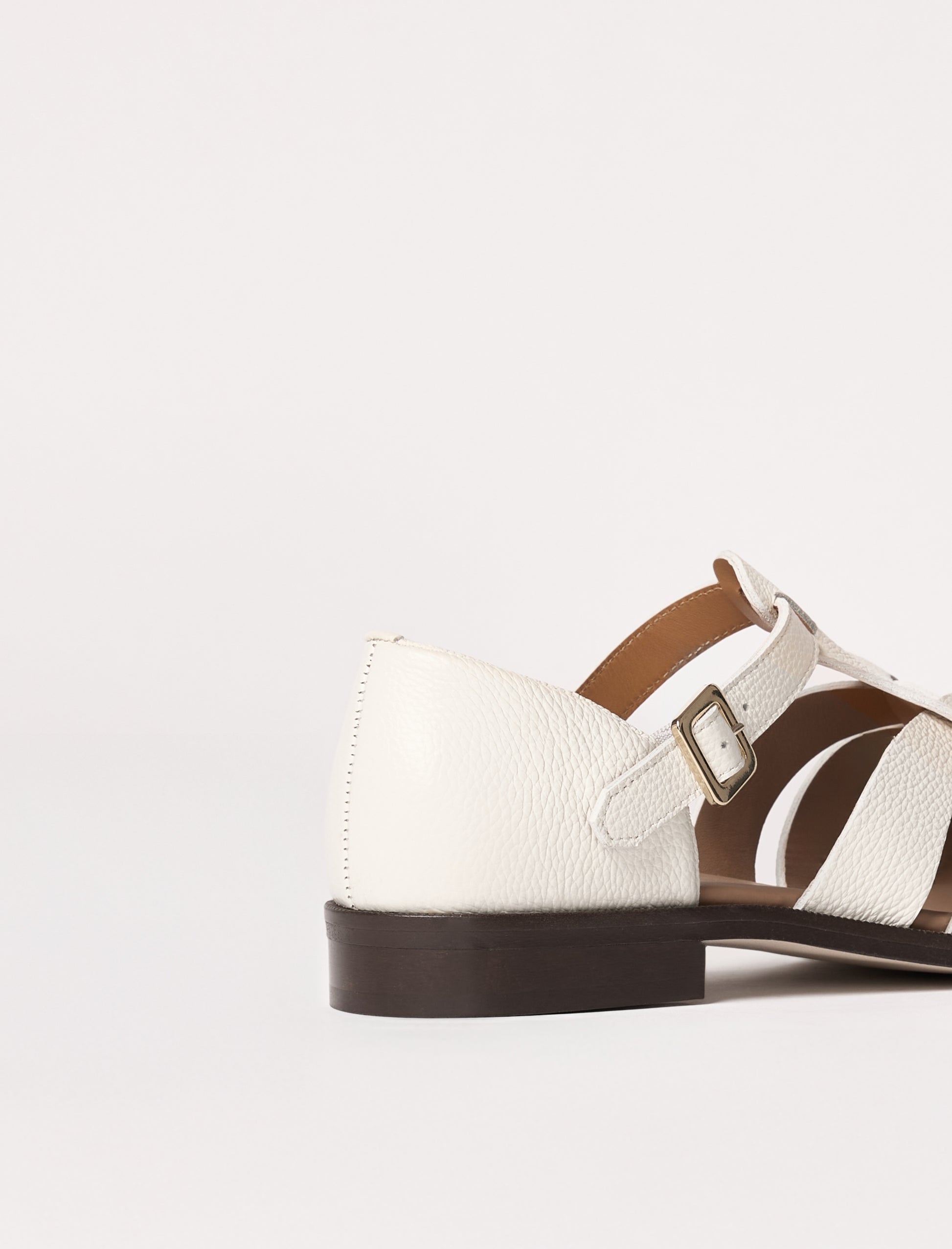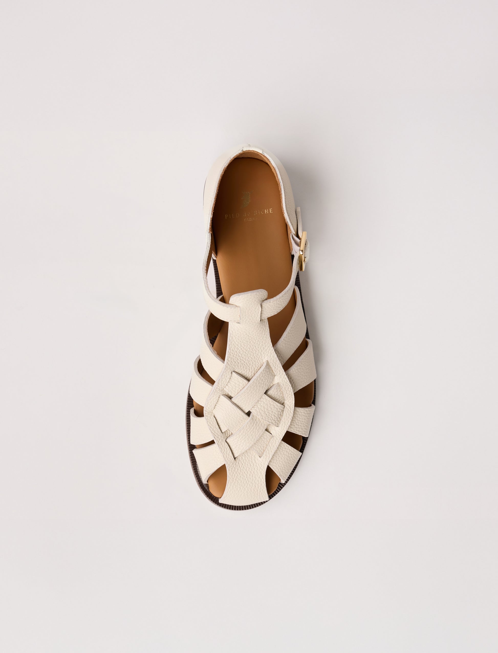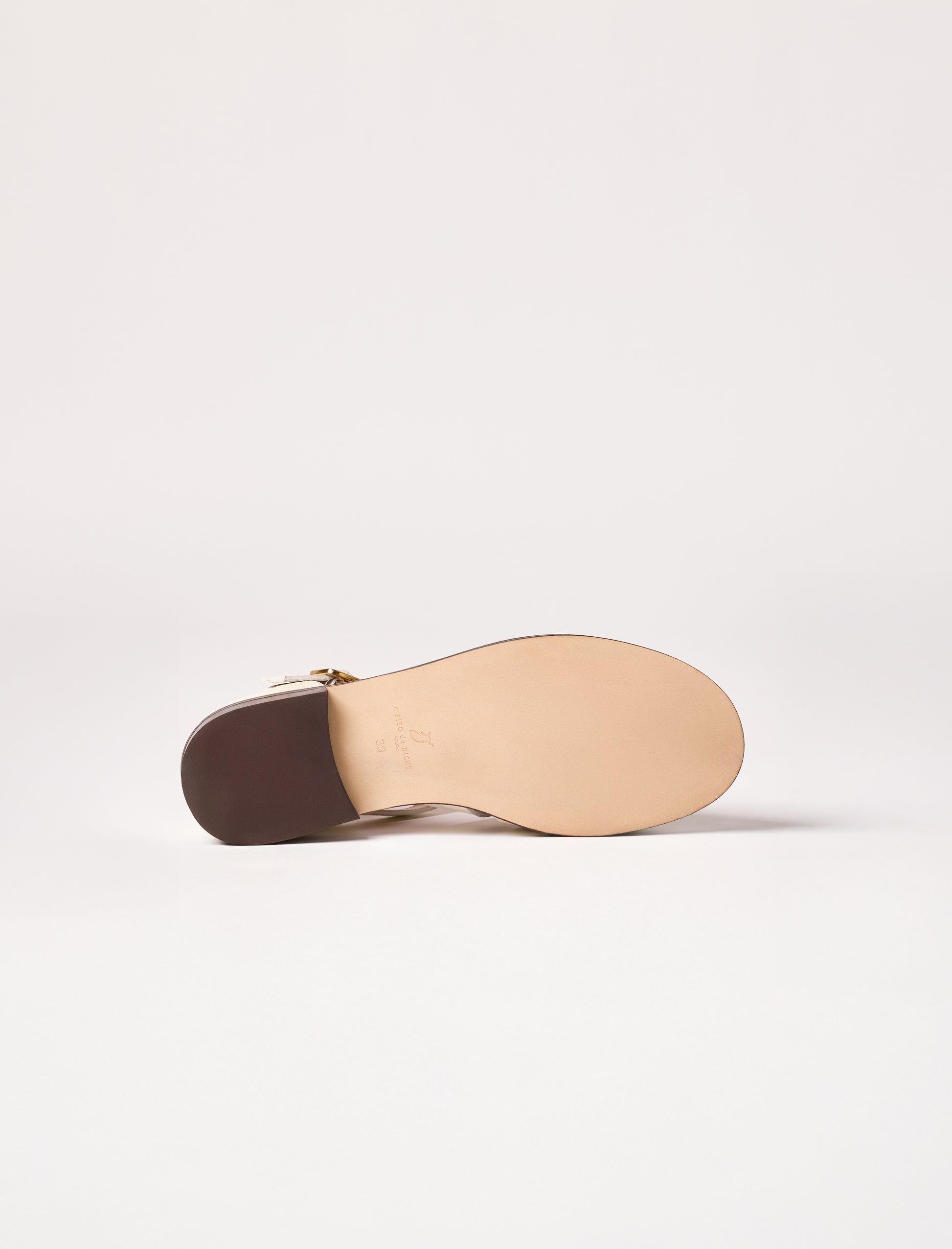 - Flache Sandalen aus geprägtem Rindsleder, verziert mit gekreuzten Riemen auf dem oberen Fuß