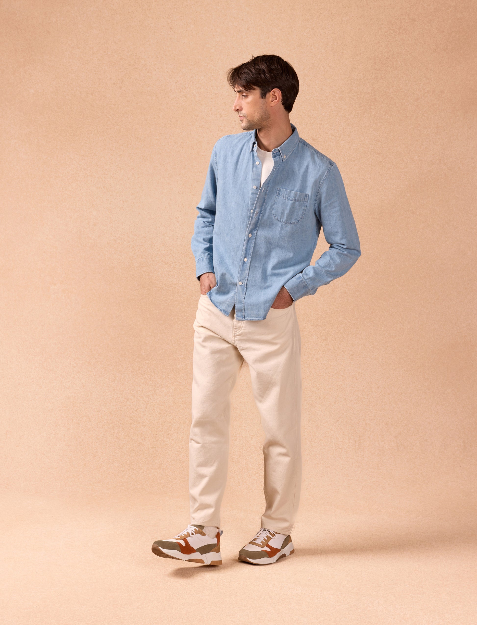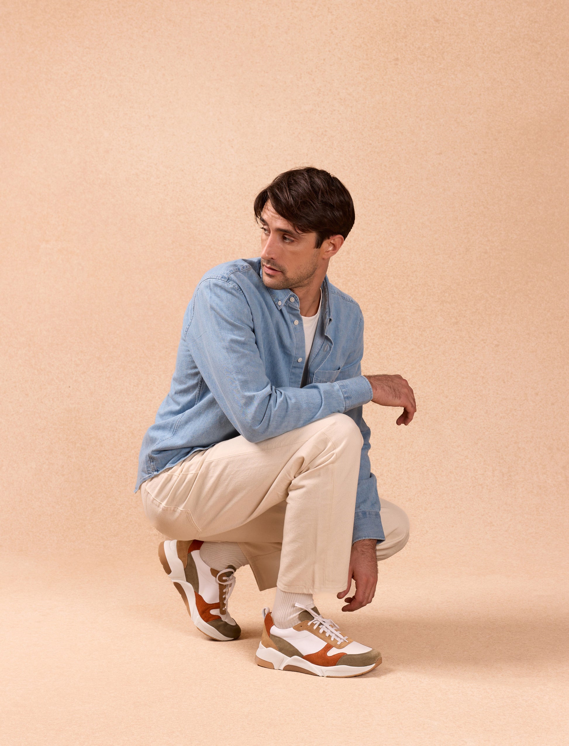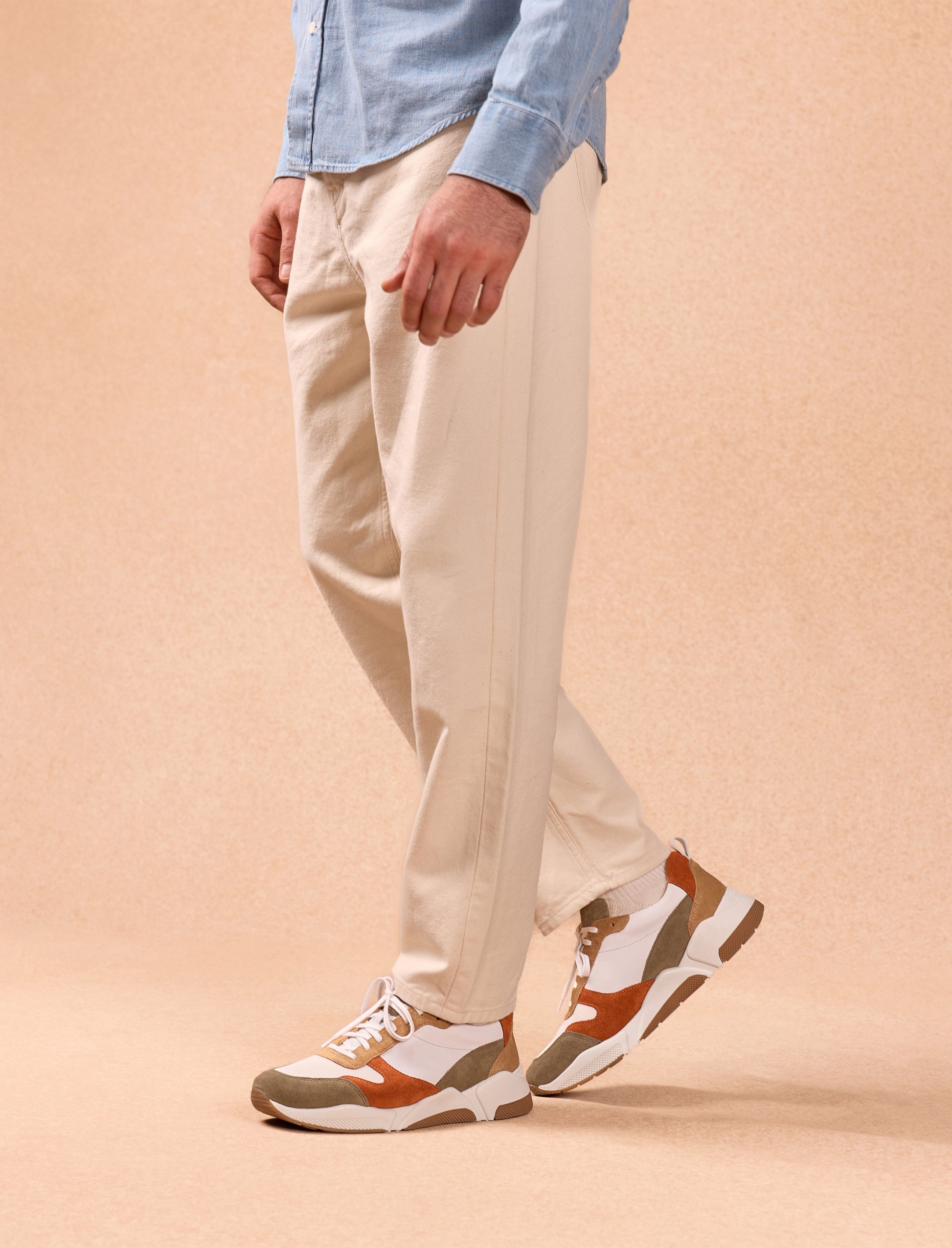Mit einem retroinspirierten und unkonventionellen Geist gestaltet, spielen unsere Sneakers-Modelle für den Laufbereich mit Stil und Eleganz. Wir schätzen dieses Paar in Weiß, Rost und Khaki für seine Optik und seinen Tragekomfort.