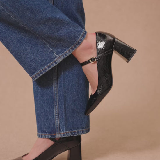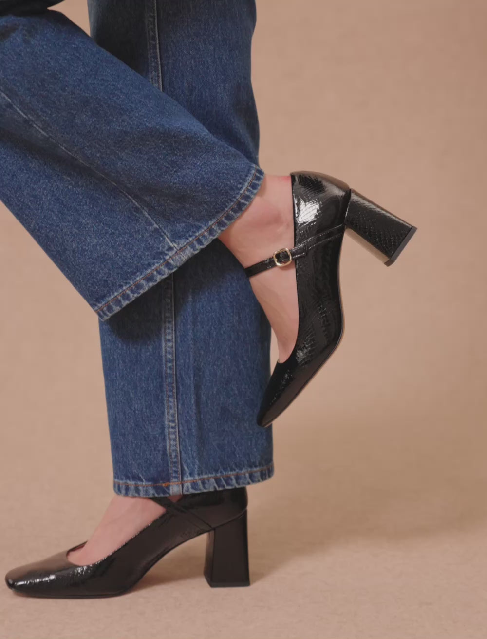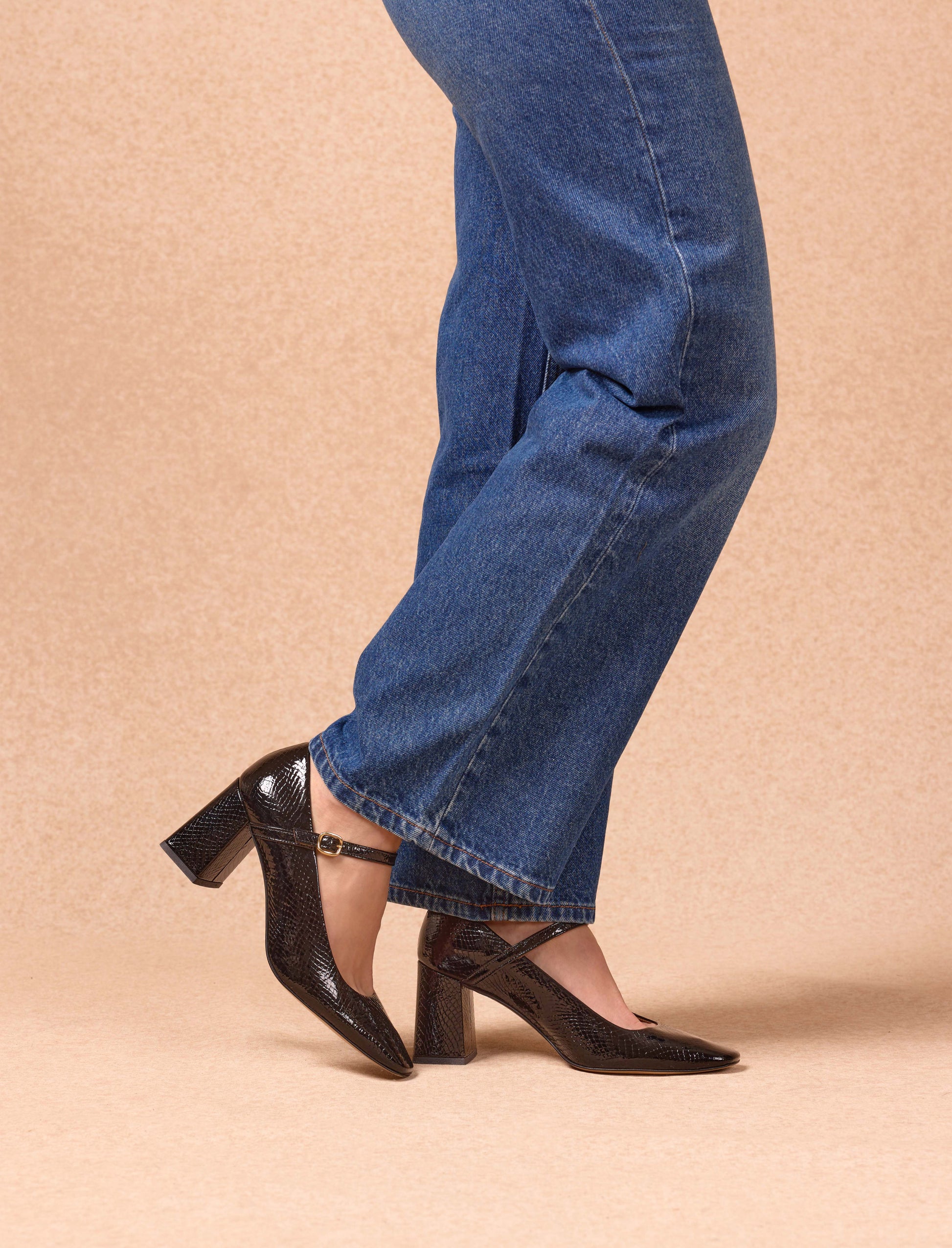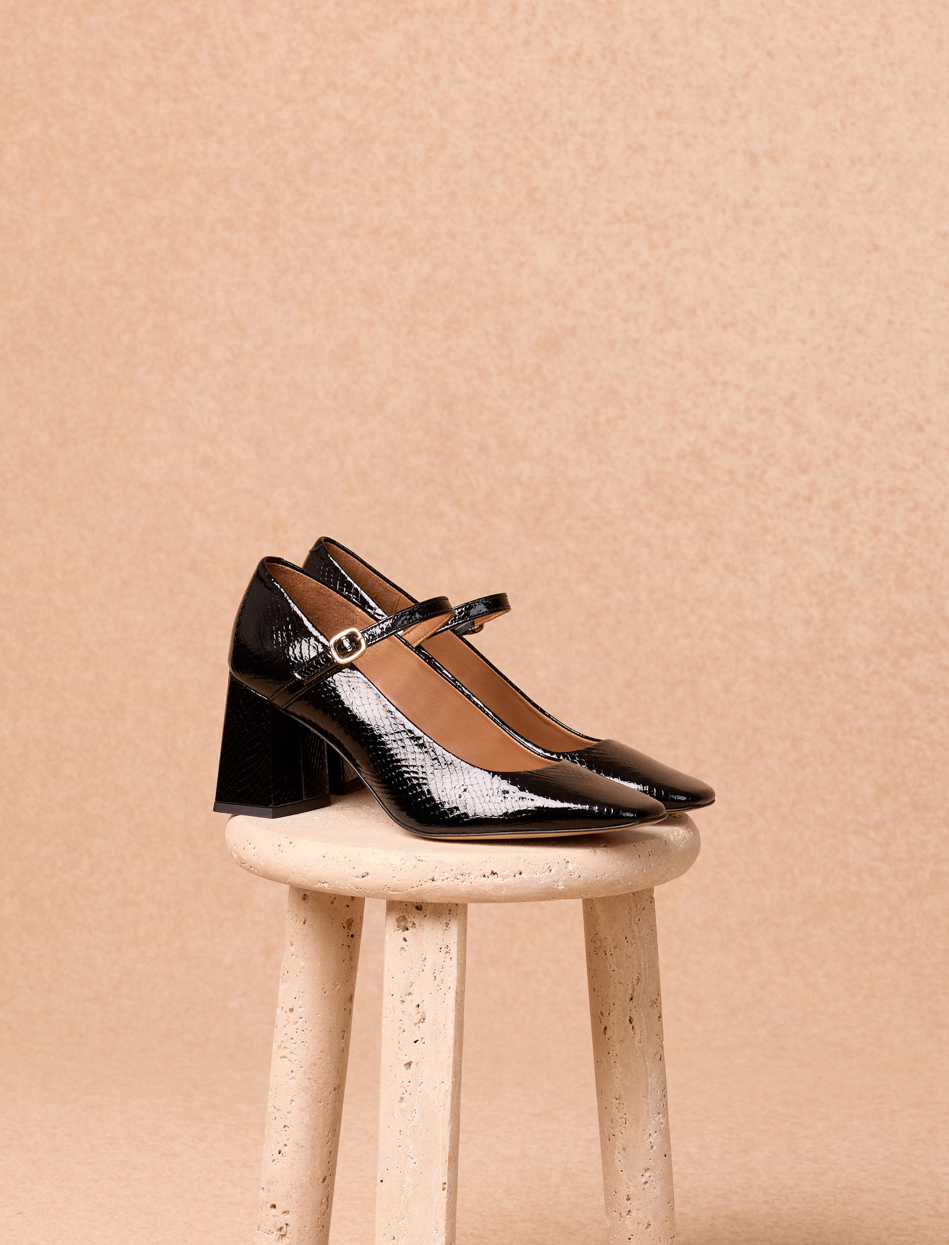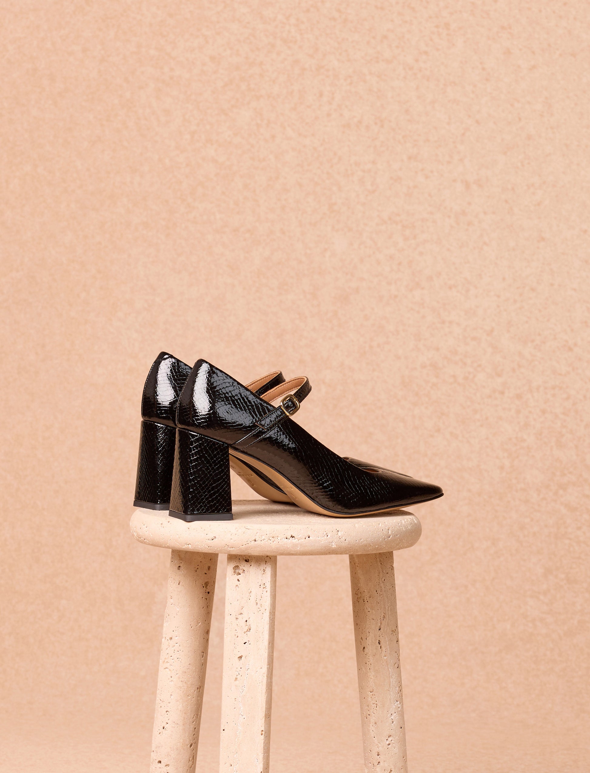 - Stöckelschuhe aus schwarzem Reptil-Leder mit eingeprägtem Schuppenmuster und lackiertem Schuppen-Design