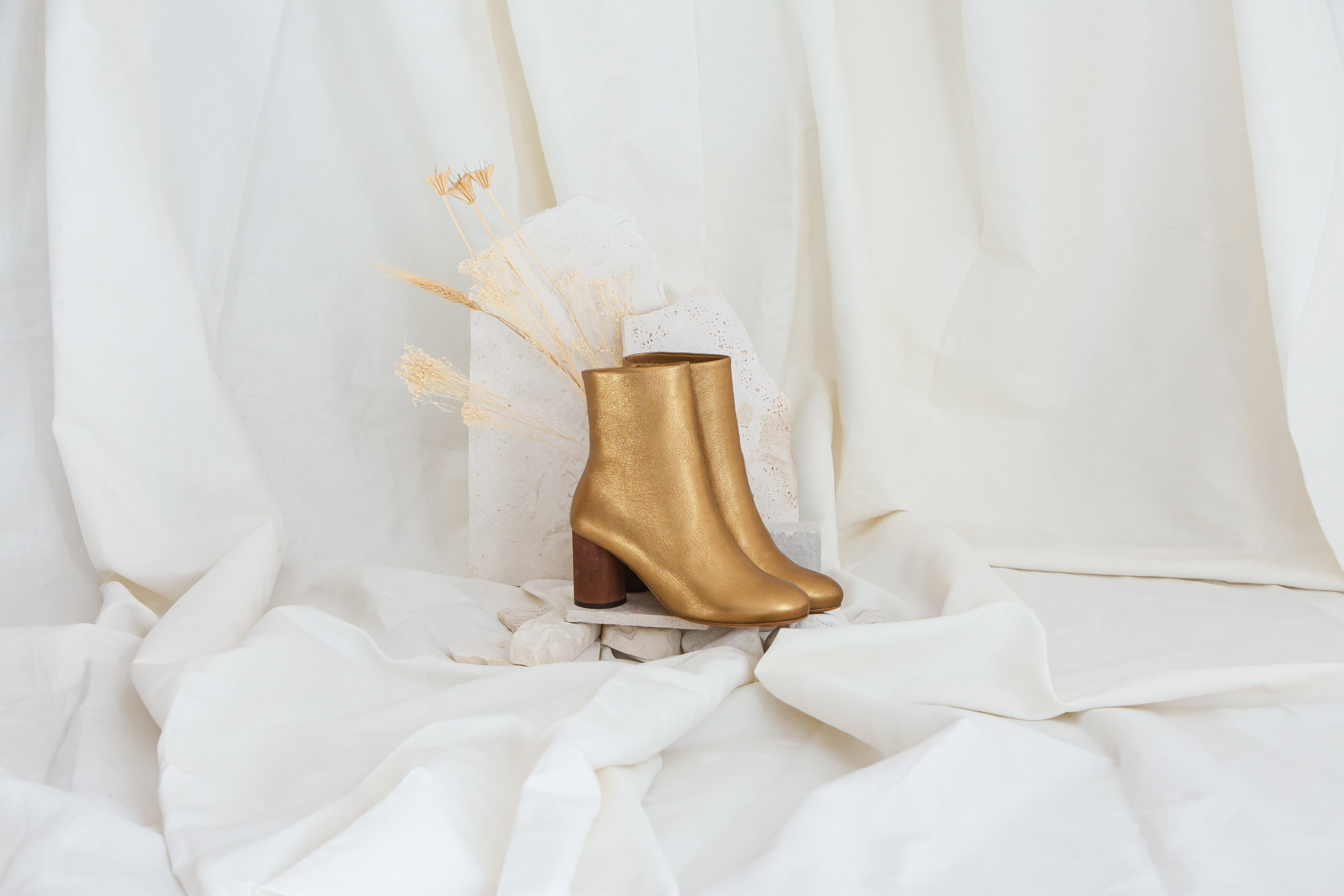 Gold-finished metallic ankle bootsThe Alma pair features high-quality metallic leather in gold, made from goat, ensuring comfort and flexibility, with a round wooden heel of 6 centimeters, a 3-millimeter leather sole, and a lambskin lining. An internal zipper makes slipping into the boot easy. Handcrafted in Portugal, Alma guarantees exceptional quality. Elegant and sparkling, it will only enhance your beauty on your most special day. Comfortable thanks to its thick, mid-height heel, you’ll be able to dance all night long. Refined yet versatile enough to be worn daily.