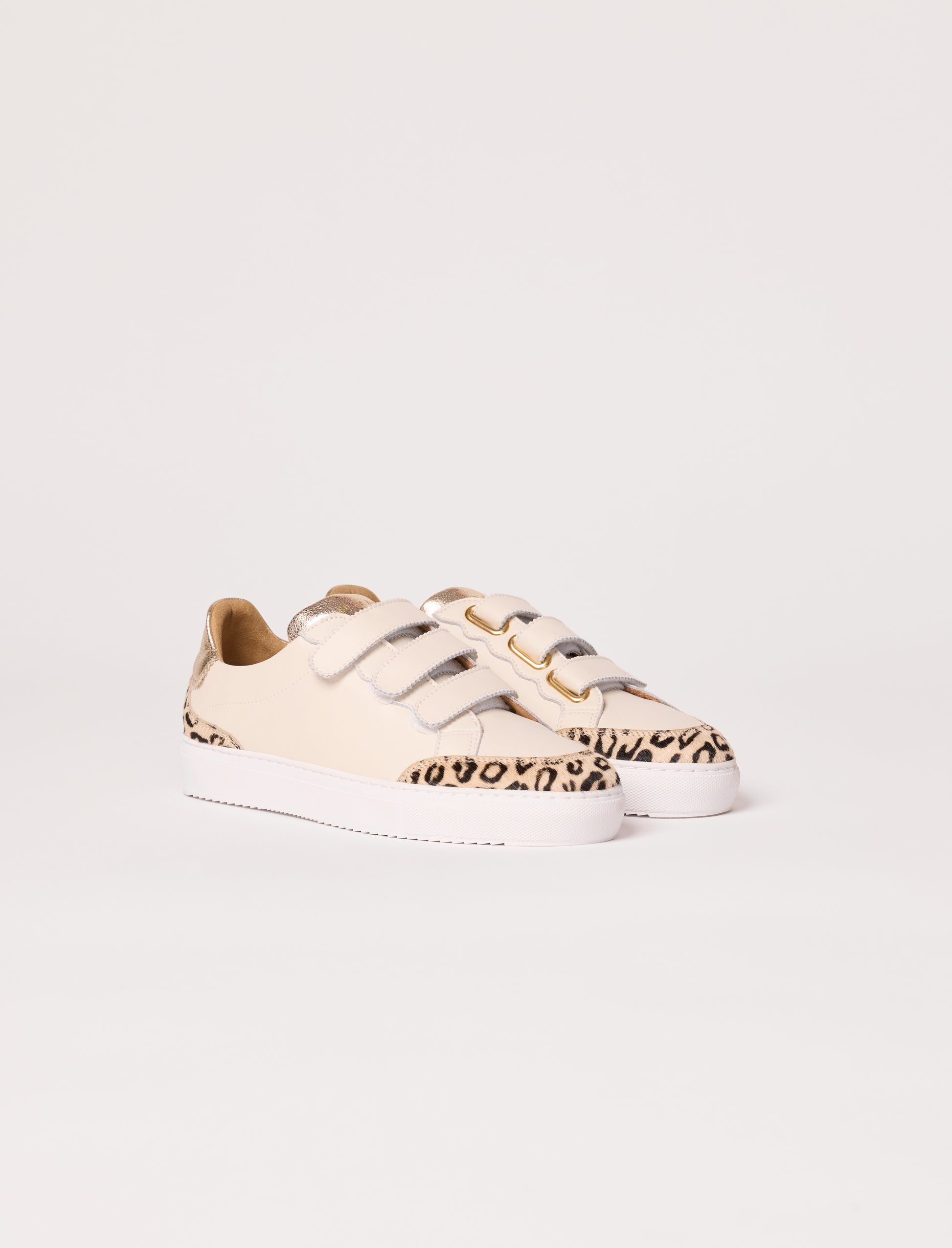 - Smooth leather sneakers accented with pony leather panels and shimmering gold leather