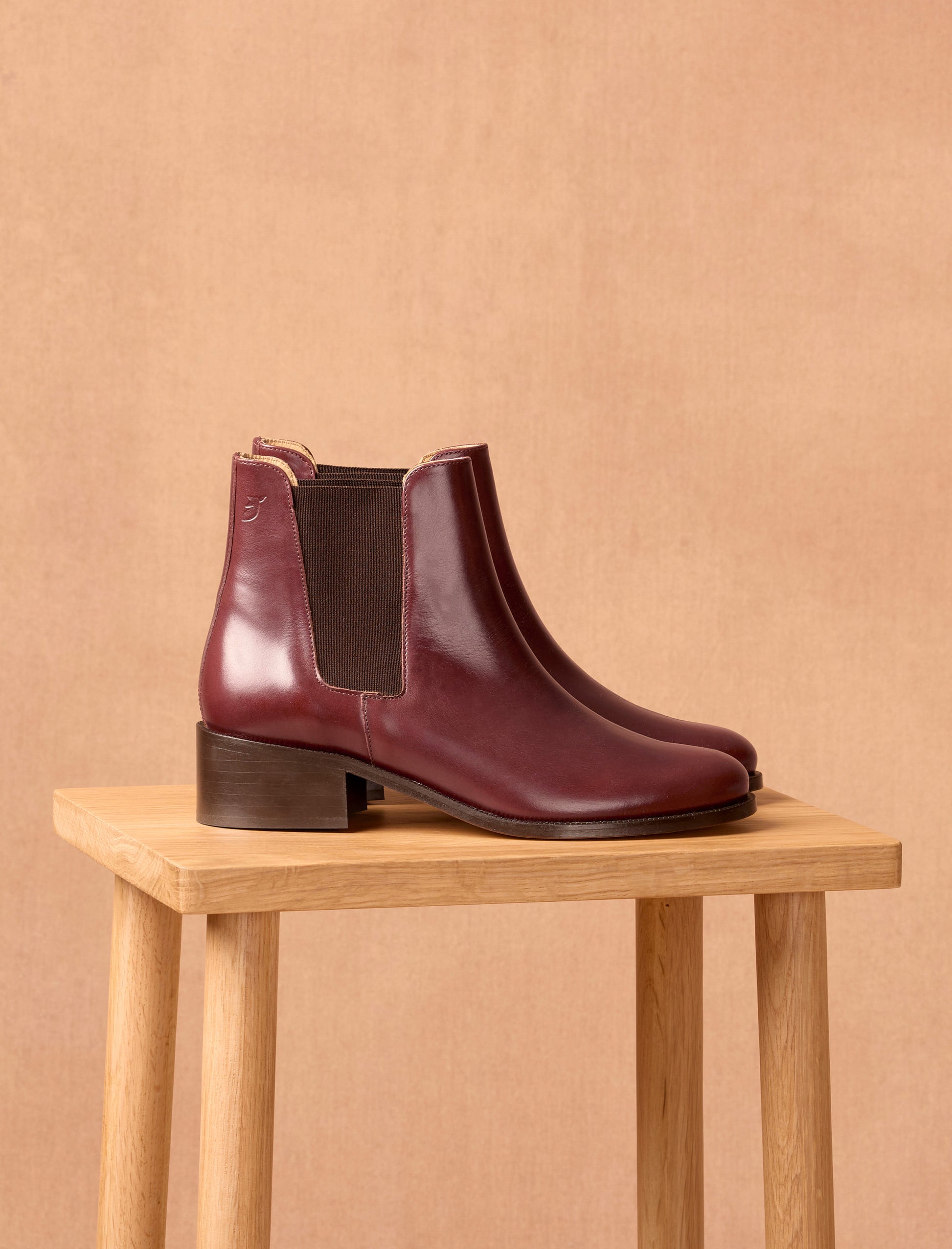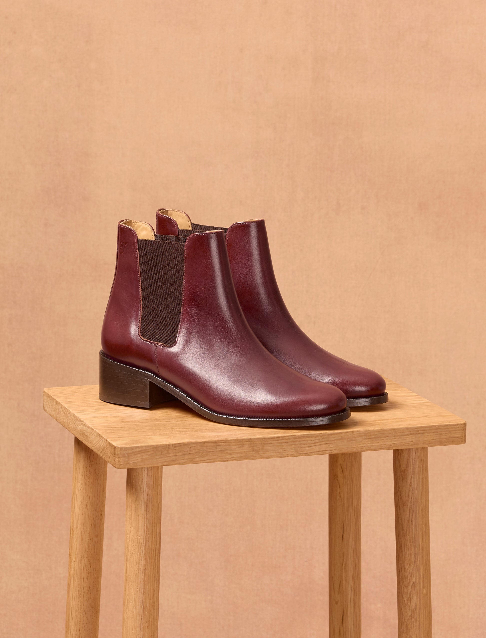 - Pull-up burgundy cowhide leather Chelsea boots with heels