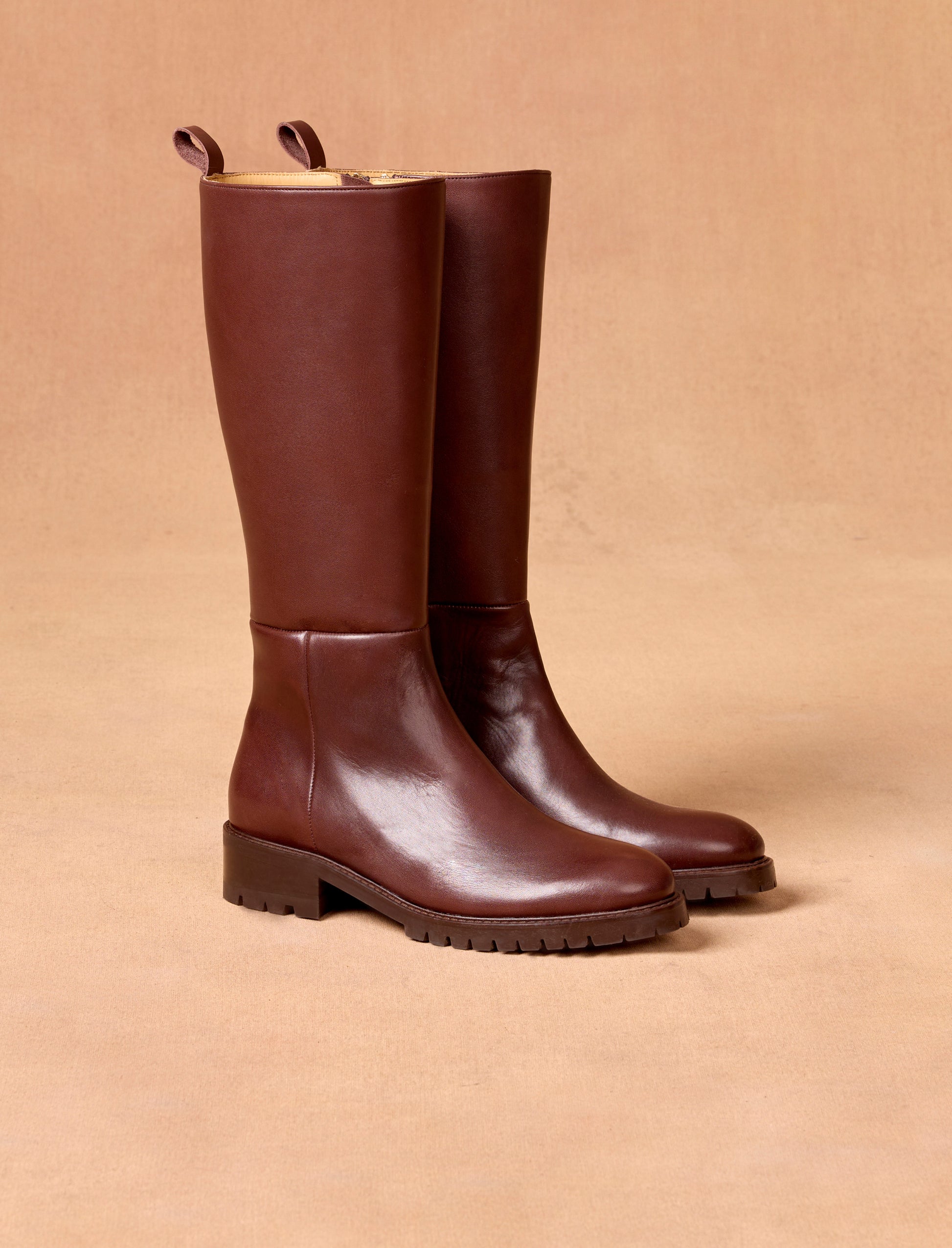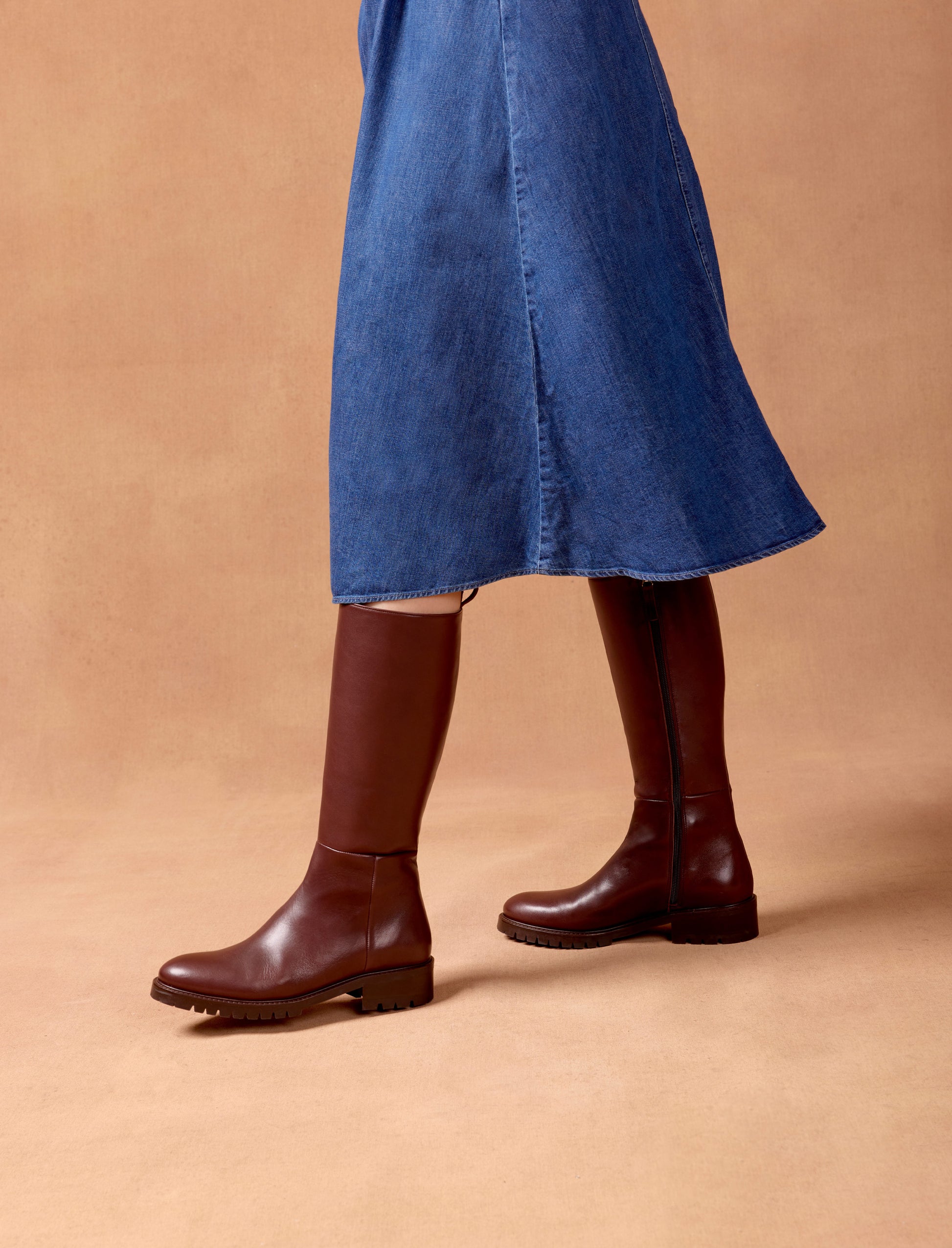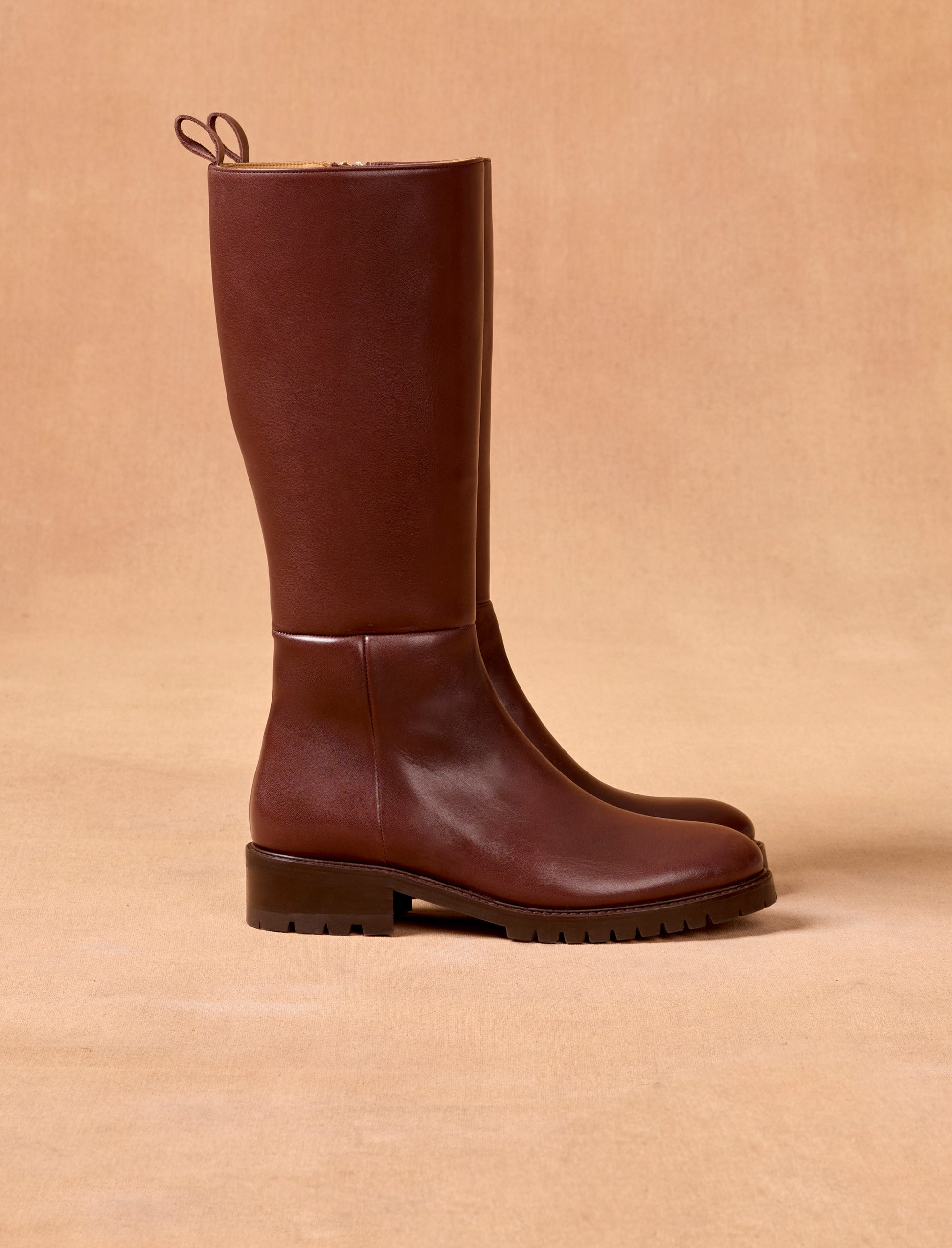 The Ingrid boots feature a textured sole and a 4 cm heel, offering all-day comfort with a modern, preppy silhouette. Carefully selected in Spain, these boots are crafted from smooth, first-quality ebony leather. The side zipper allows for easy on and off, making them ideal for busy mornings.