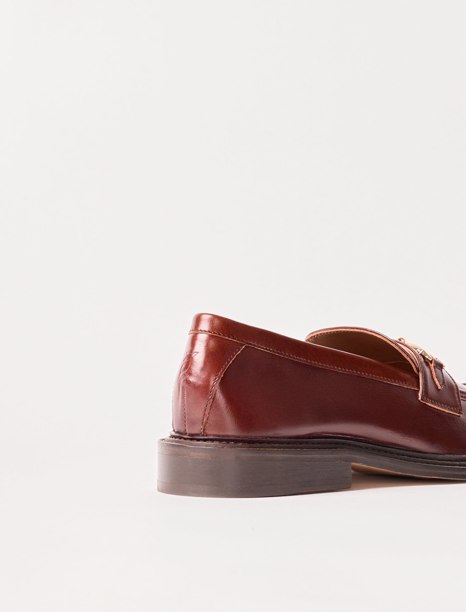 - Vintage burgundy red cowhide leather loafers with metal bit detailing and a lined sole