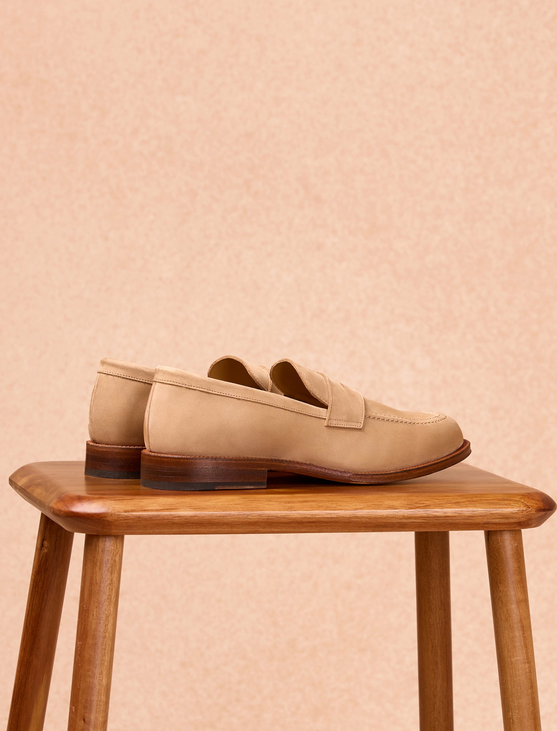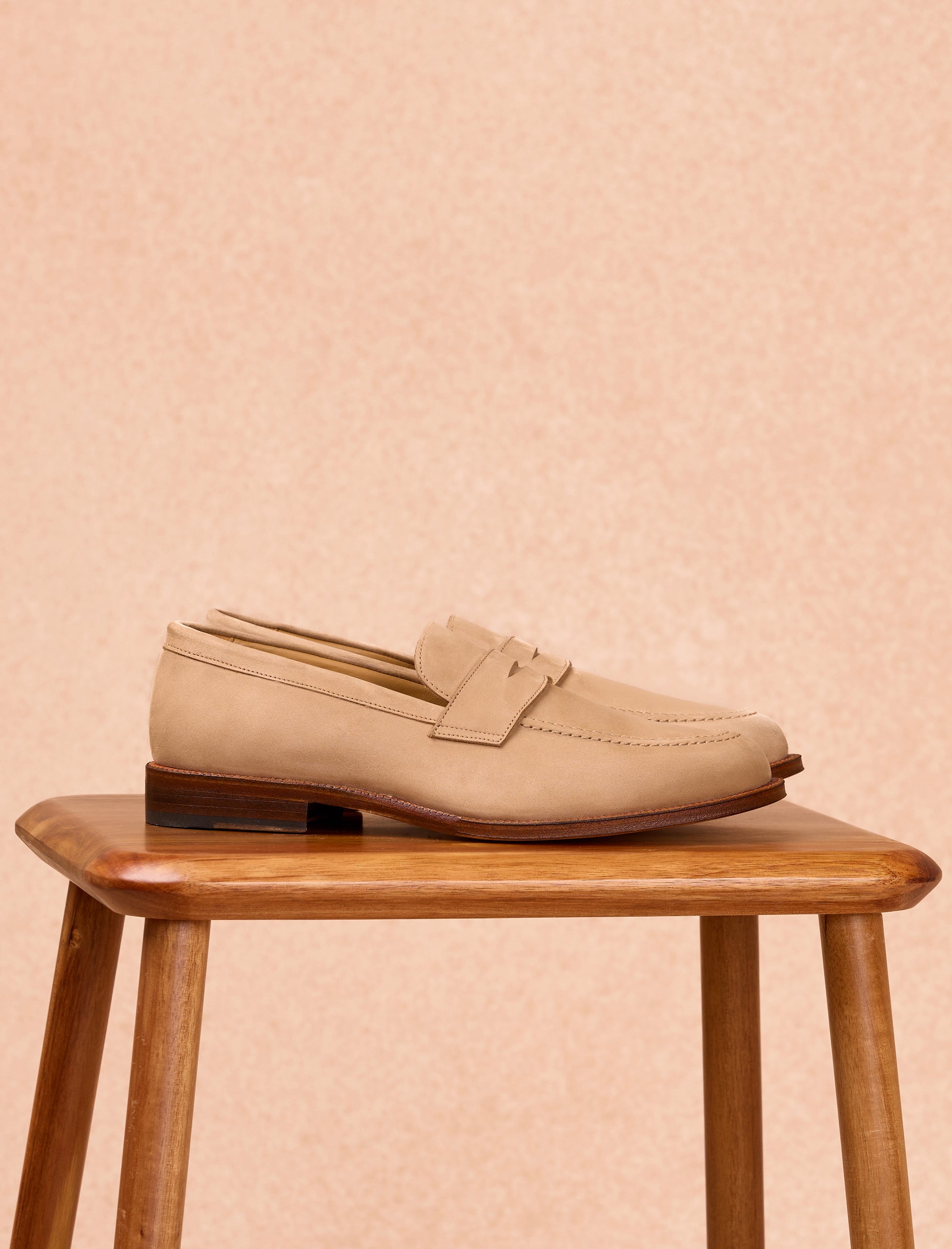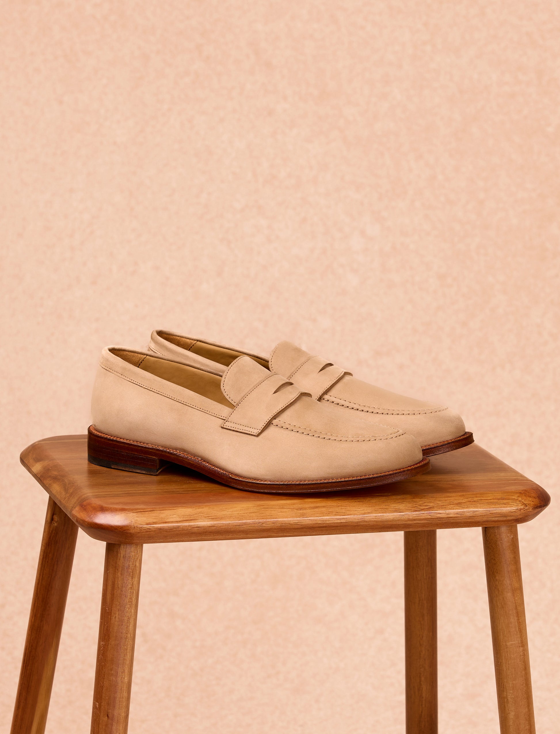 The Olivier loafers, crafted from sand-colored nubuck leather, blend elegance with practicality. Featuring a cowhide leather lining and mounted on a leather sole with a rubber heel for enhanced comfort, these shoes are made in Portugal and embody artisanal craftsmanship.