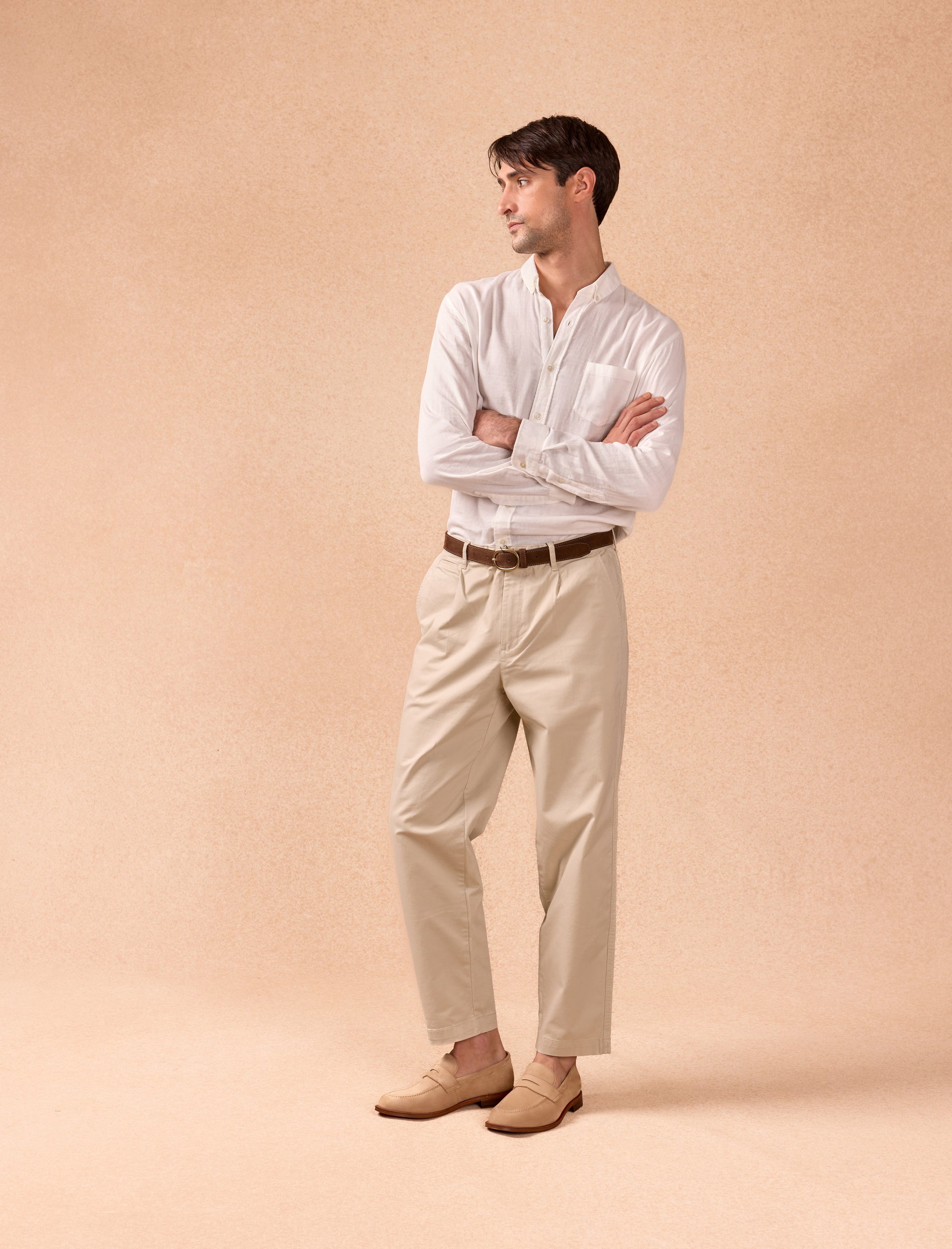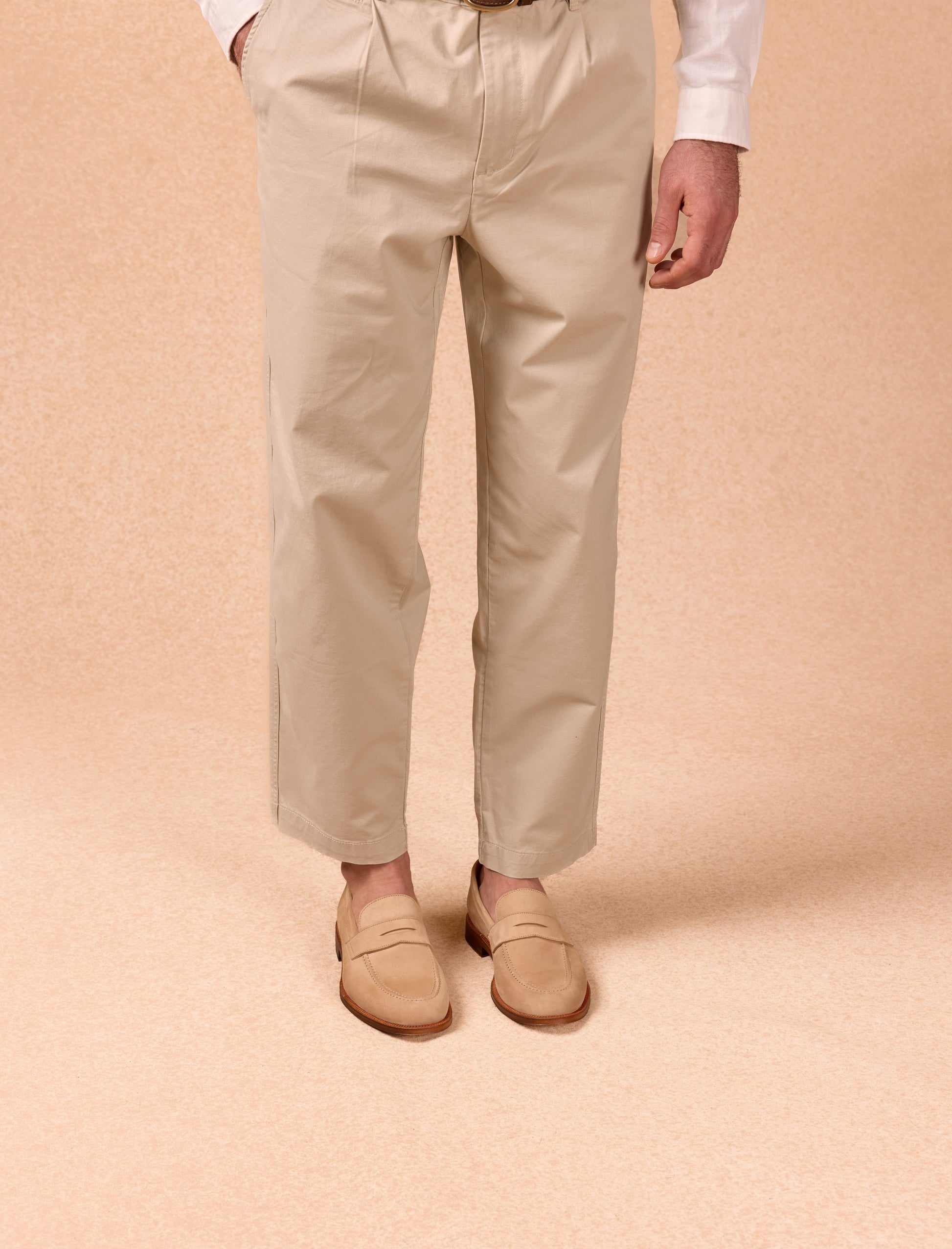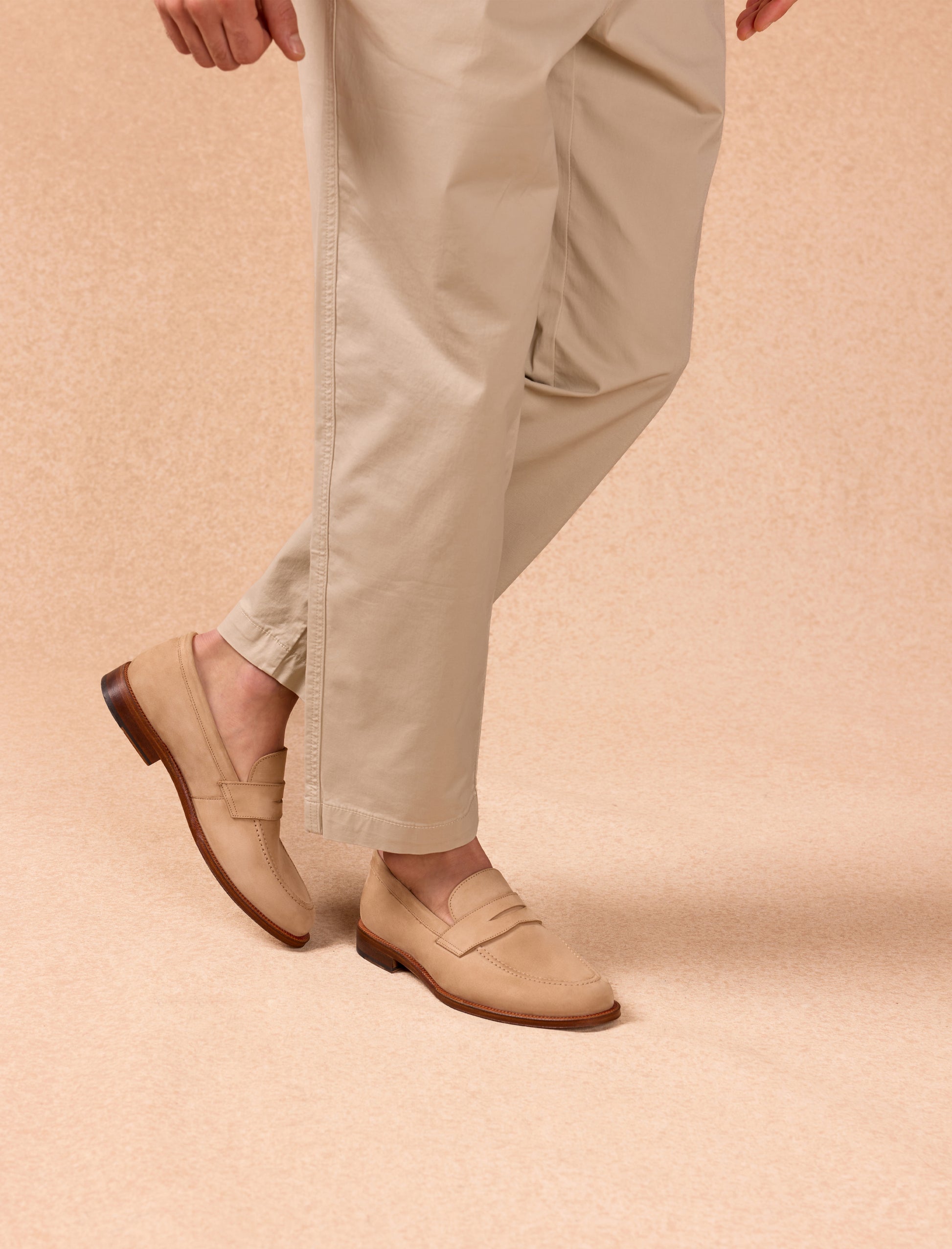 The Olivier loafers, crafted from sand-colored nubuck leather, blend elegance with practicality. Featuring a cowhide leather lining and mounted on a leather sole with a rubber heel for enhanced comfort, these shoes are made in Portugal and embody artisanal craftsmanship.