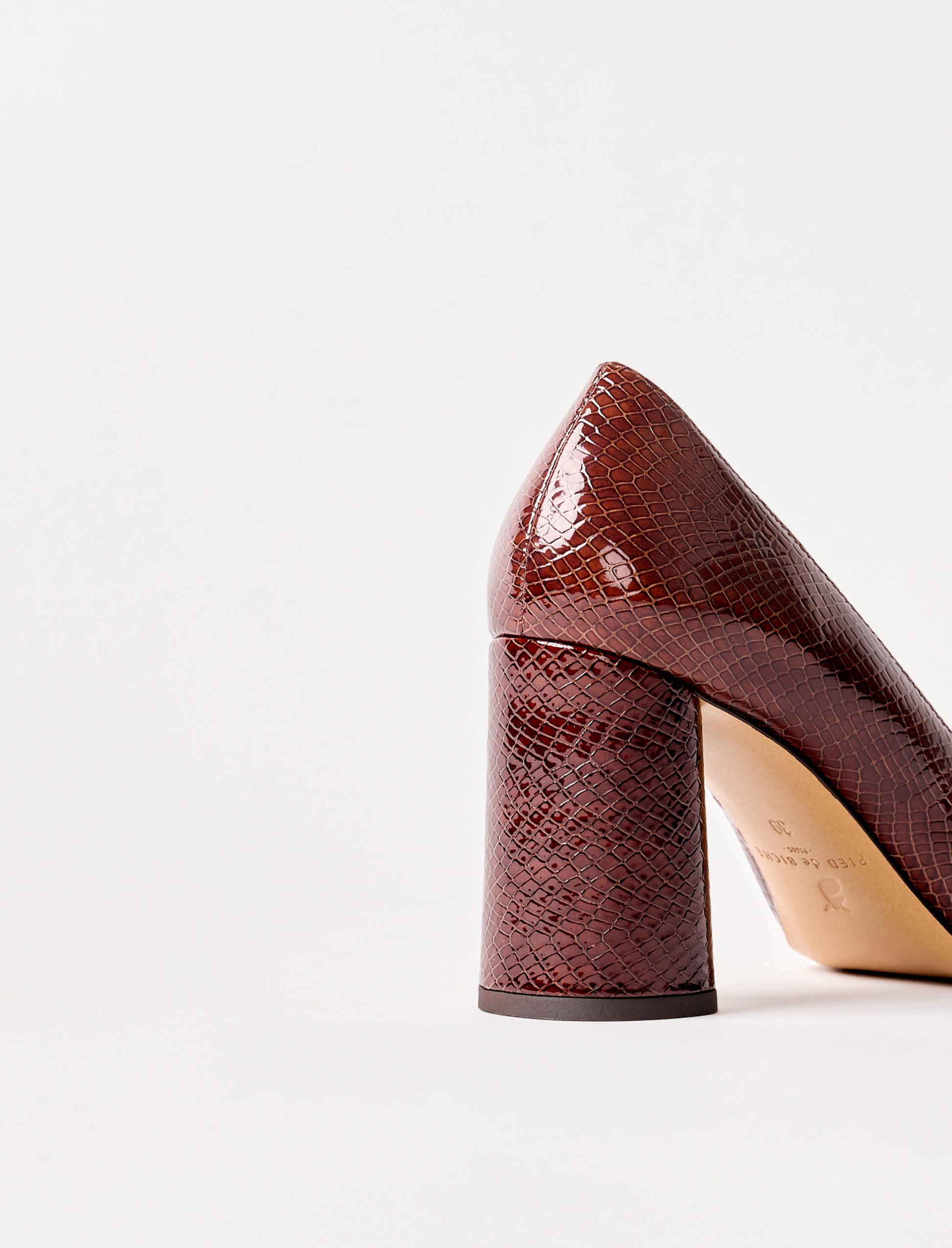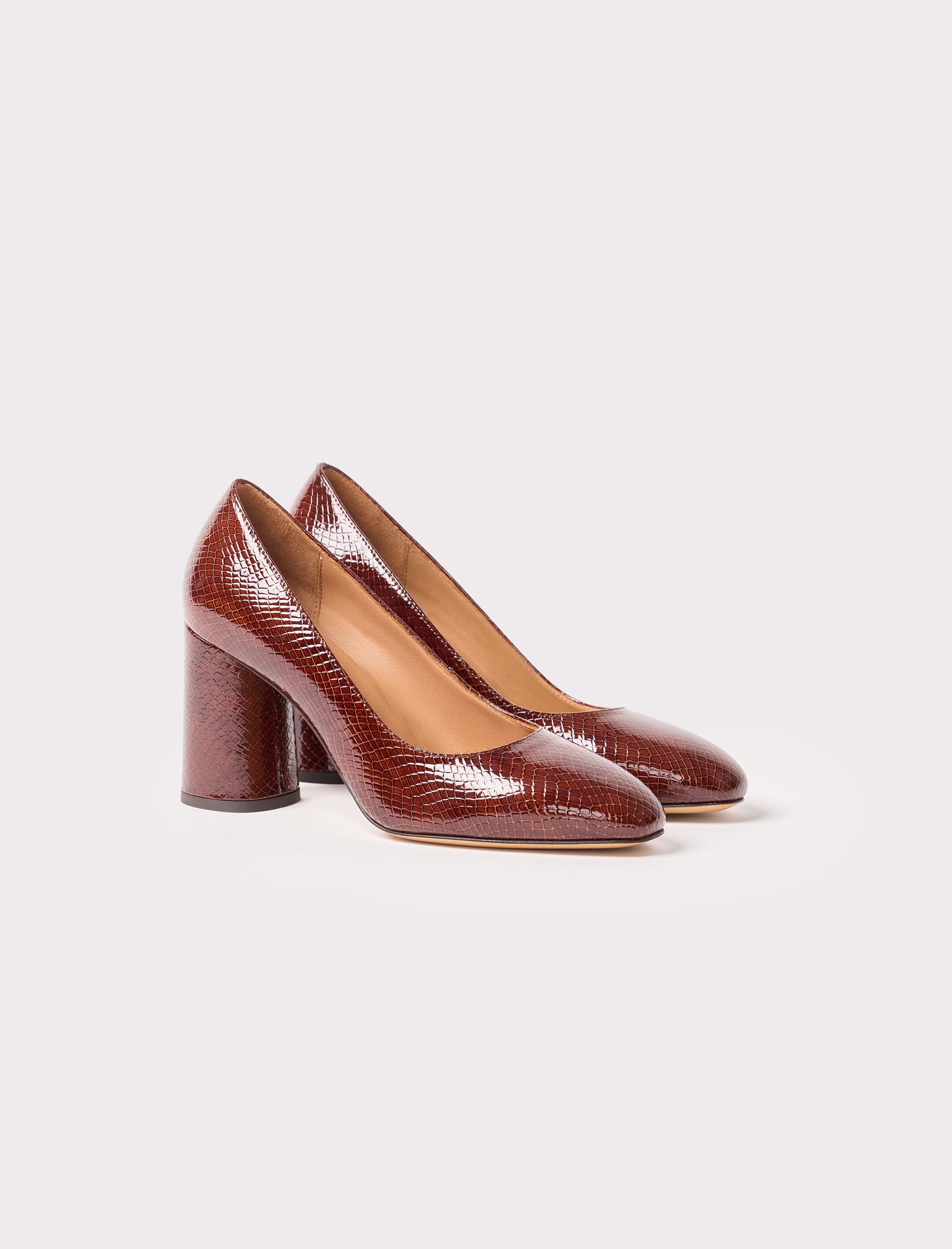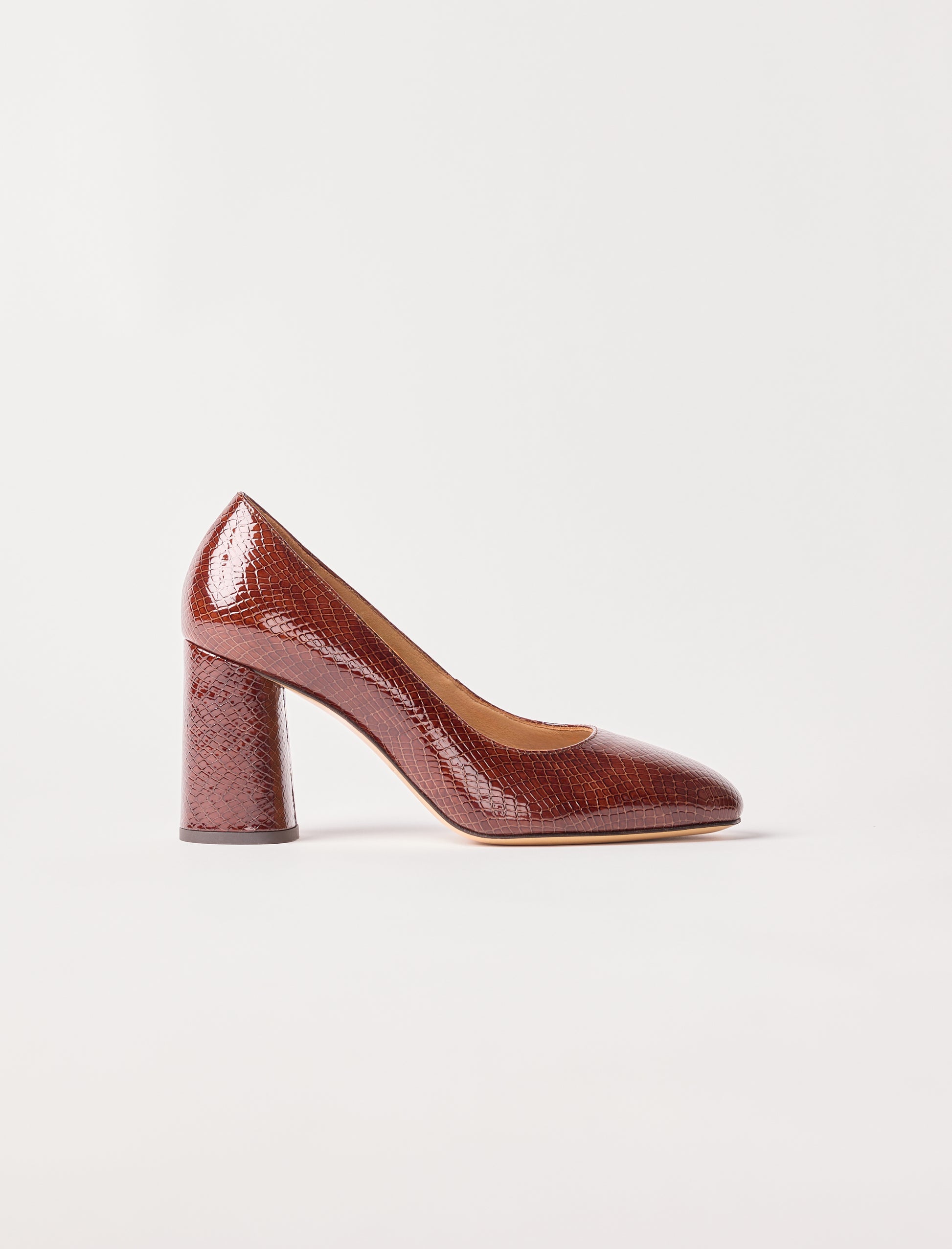 An essential piece in your wardrobe, this pump gracefully transitions through the seasons. Crafted from glossy, scaled leather, featuring an 8 cm flared heel and a cushioned comfort pad at the heel, this pair will be your go-to for any occasion.
