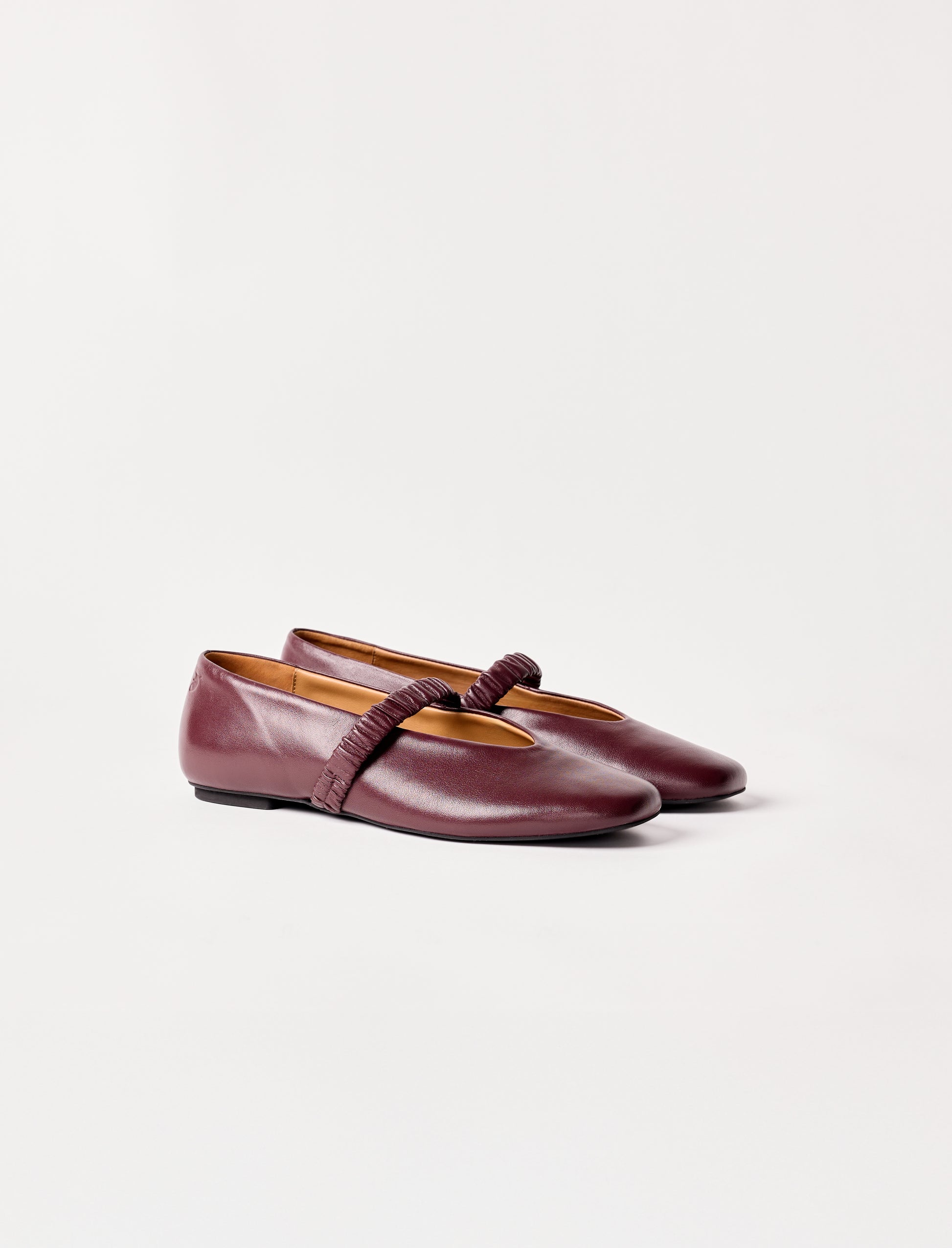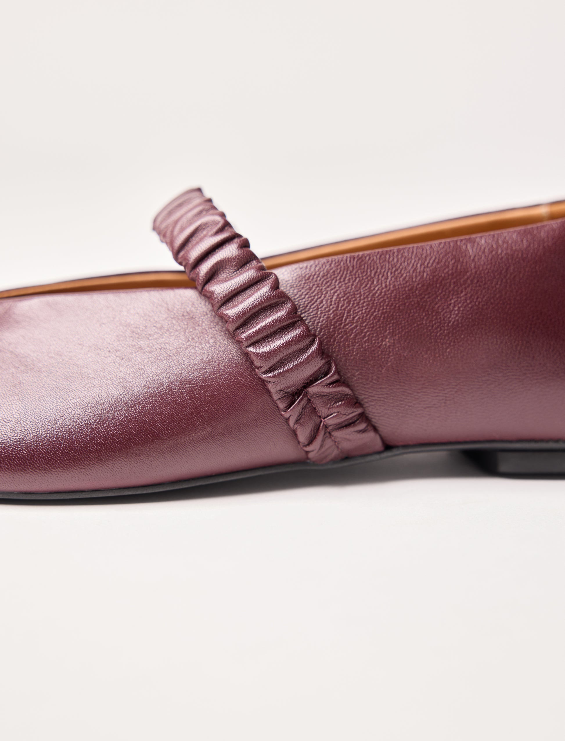 Our smooth aubergine leather ballet flat is the essential fashion piece for the season. Made in Spain, it is lined with goat leather for added comfort. Its nubuck-tunit sole provides lightness, and the elastic leather strap with pleats ensures a secure fit.