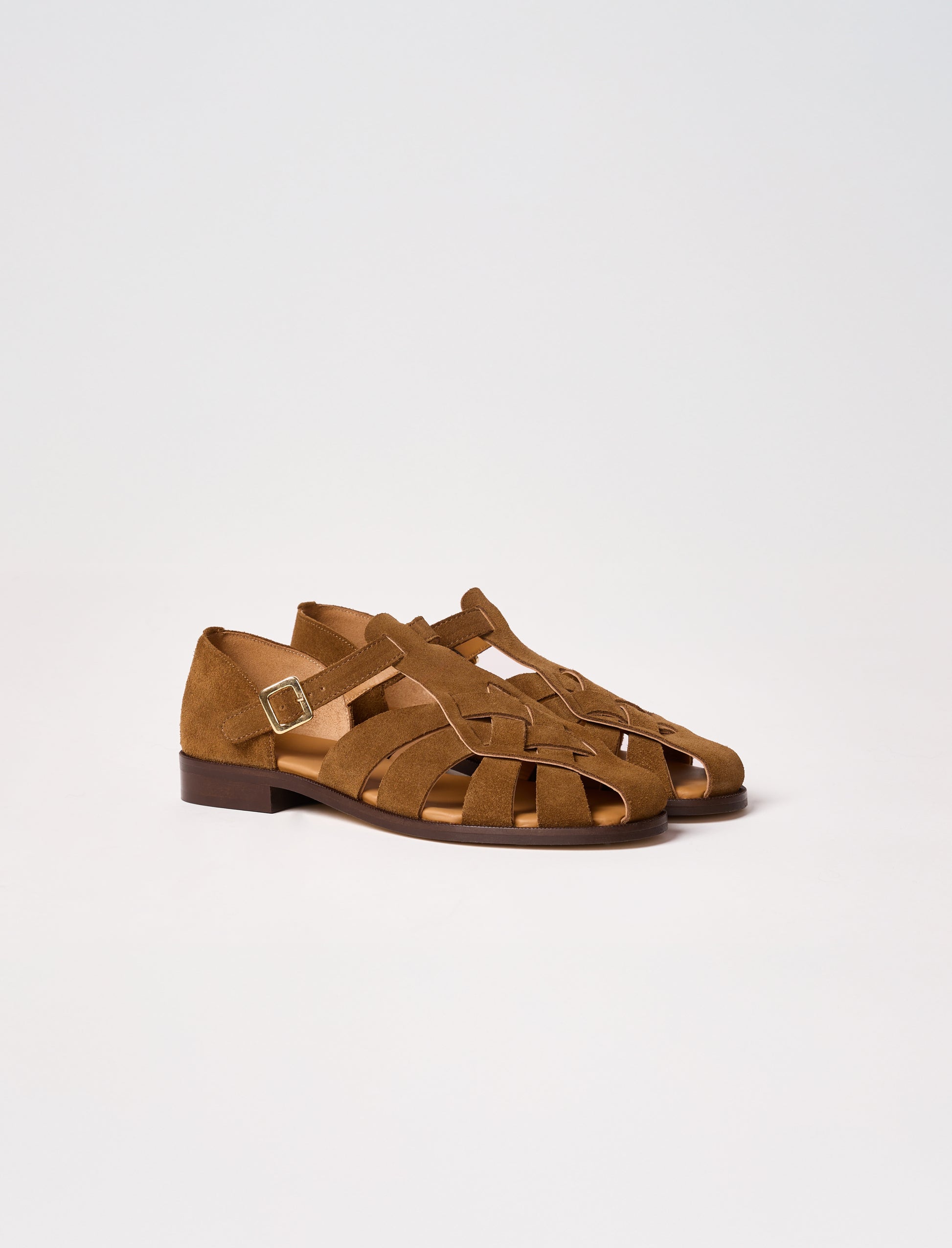 - Flat sandals crafted from cowhide suede, featuring cross-strap embellishments across the top of the foot