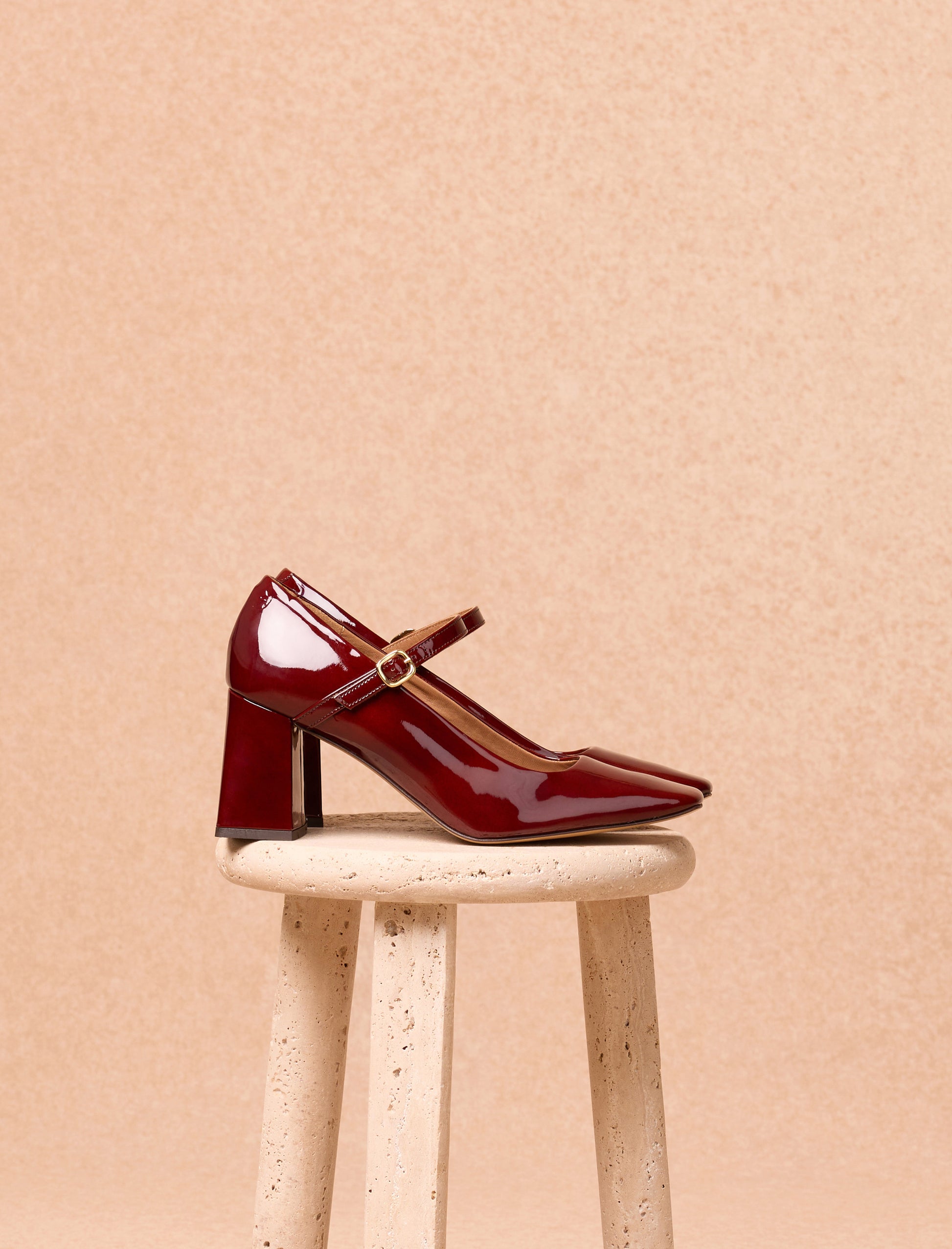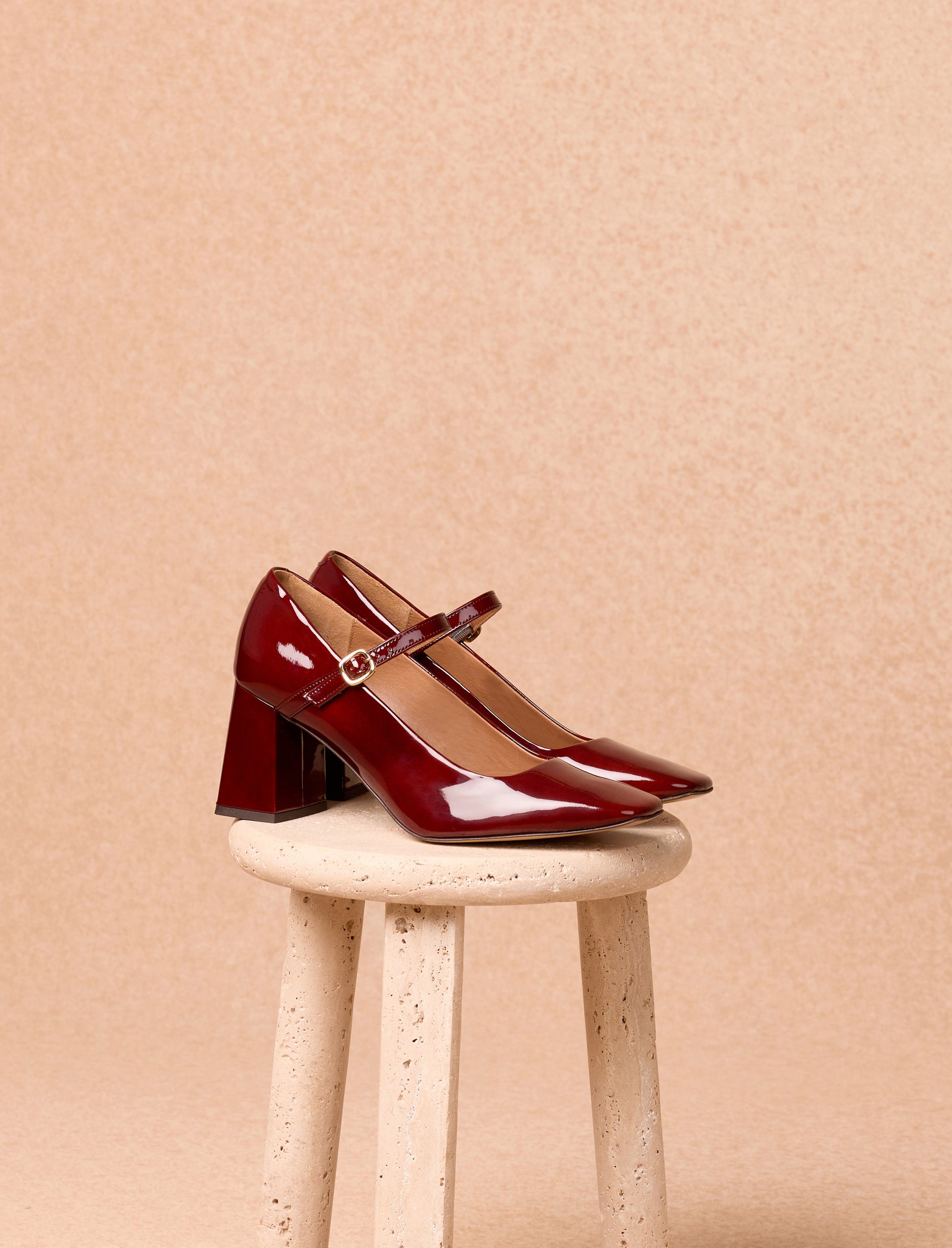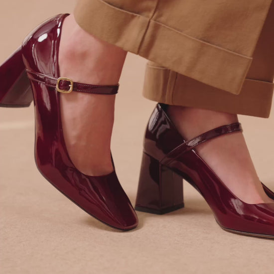 - Varnished burgundy calfskin pumps with a leather-covered heel