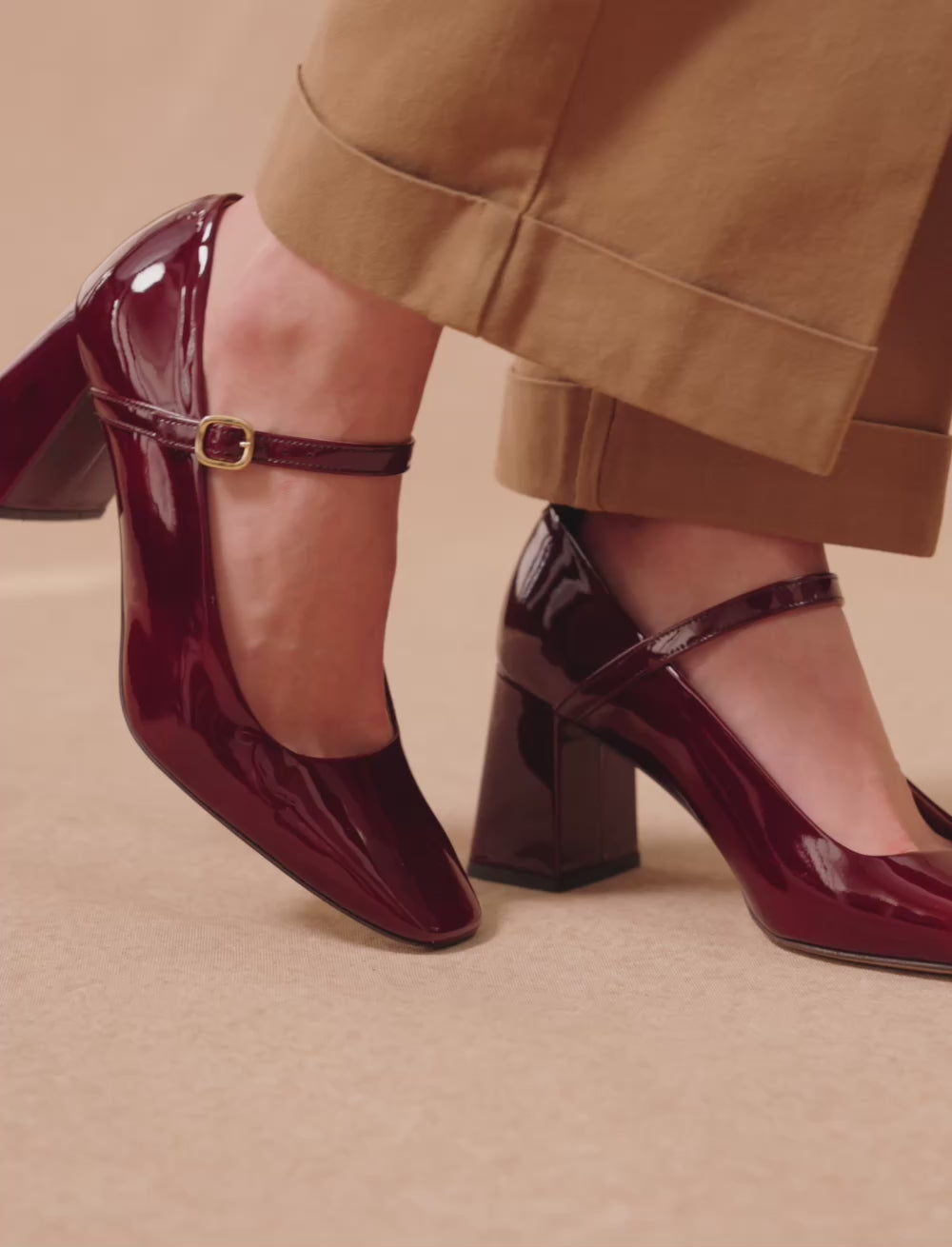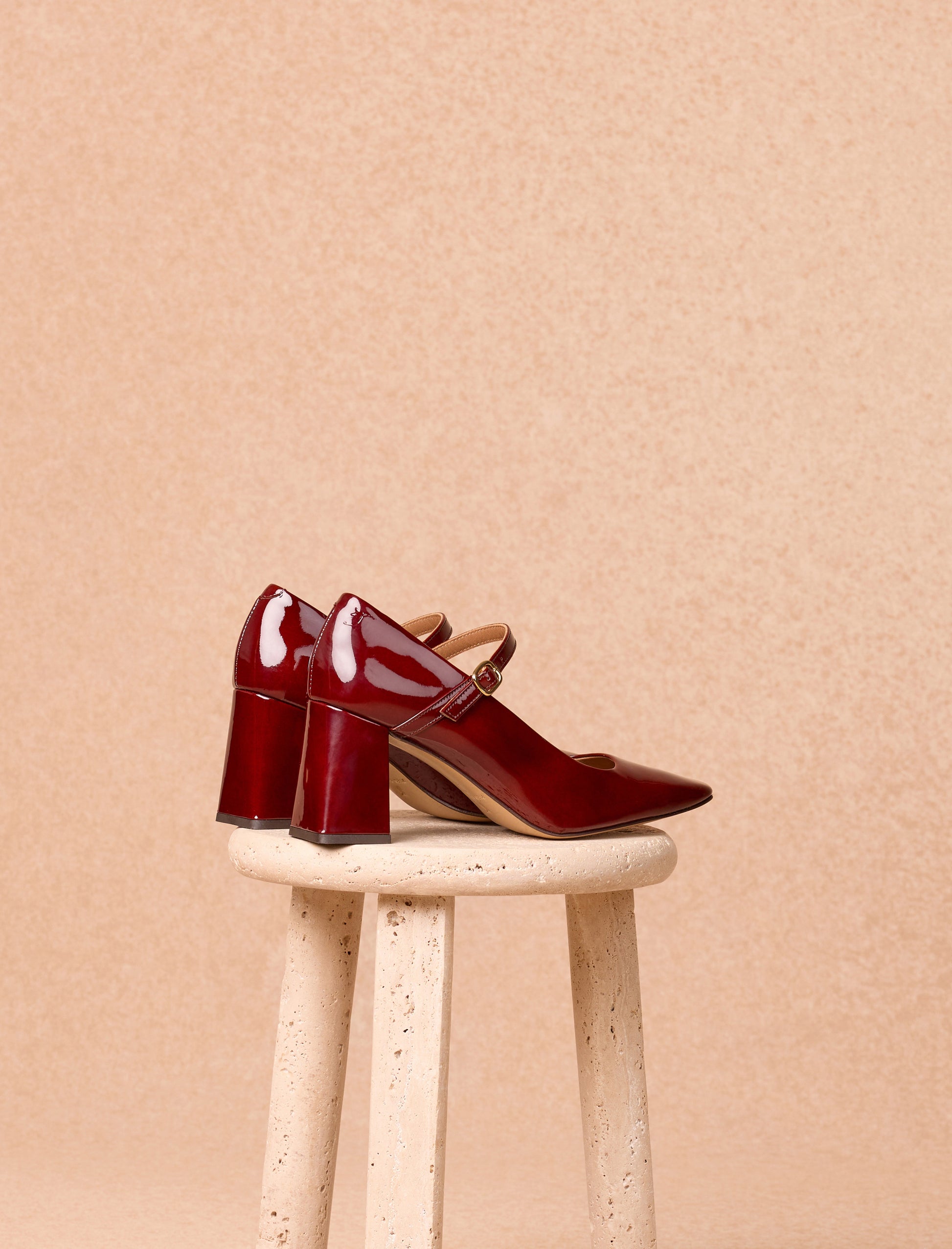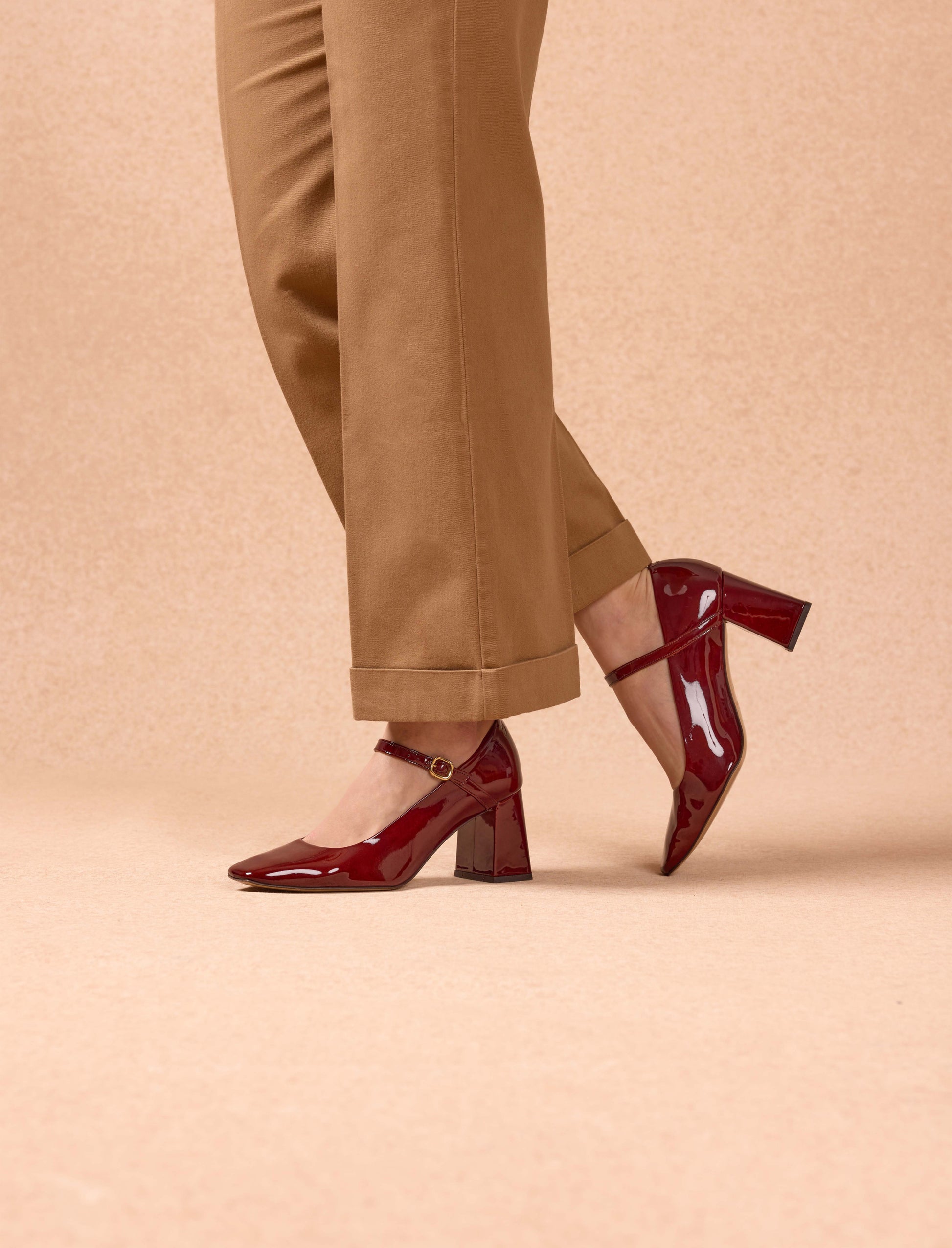 - Varnished burgundy calfskin pumps with a leather-covered heel