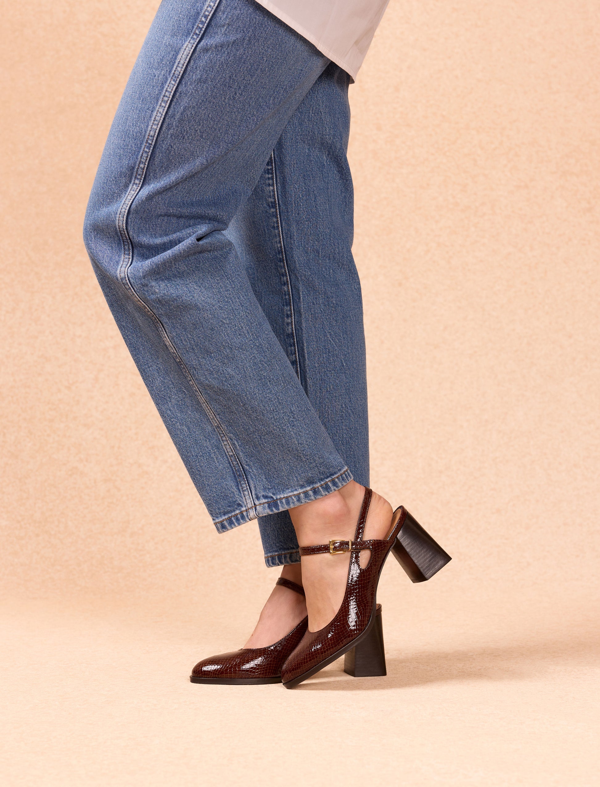 Adèle : la babies au charme résolument vintage. Avec son cuir verni embossé et son talon élégant de 7,5 cm, notre sandale allie féminité et caractère, tout en élançant votre silhouette. Chaque détail est soigneusement pensé, comme sa bride, signature emblématique des babies.
