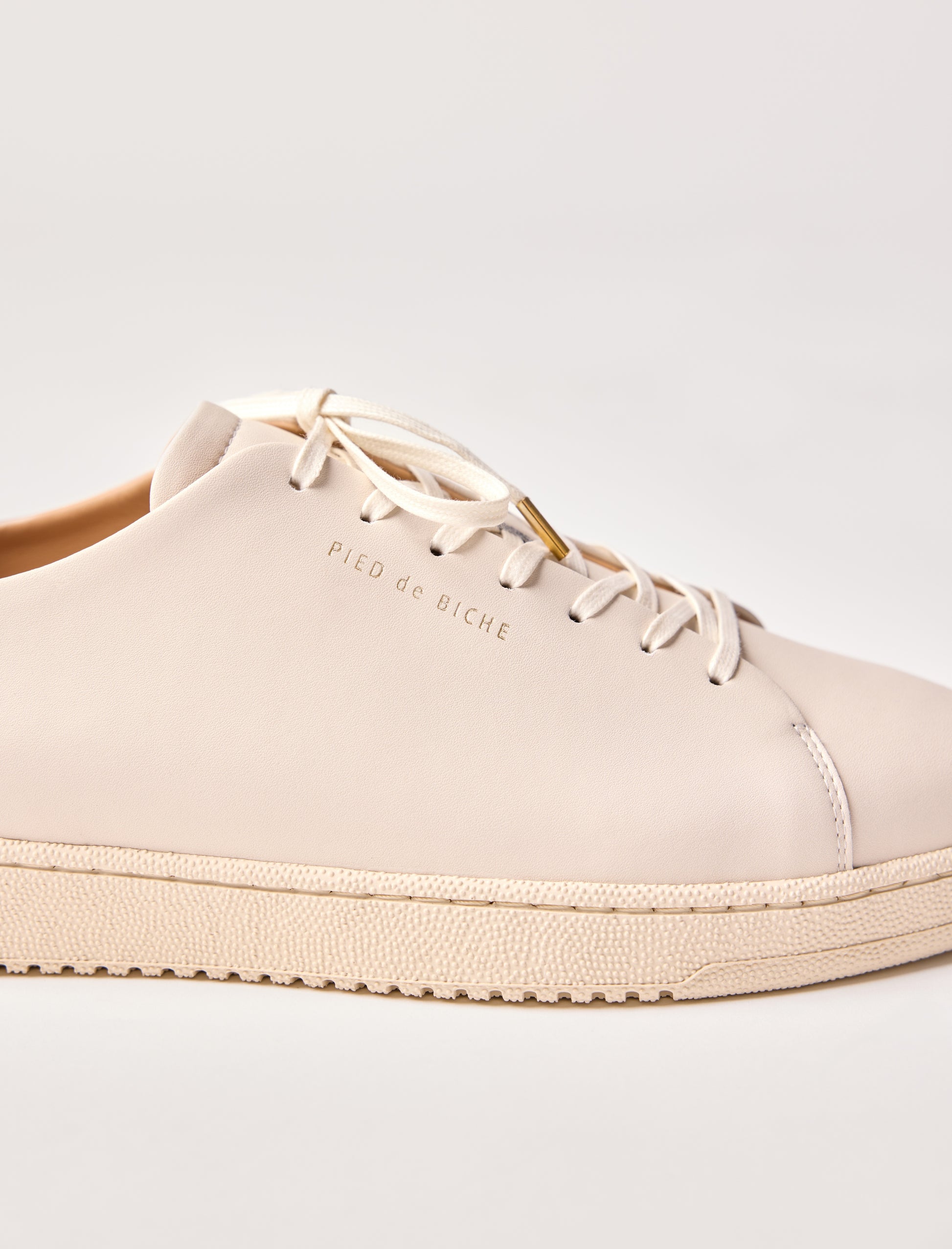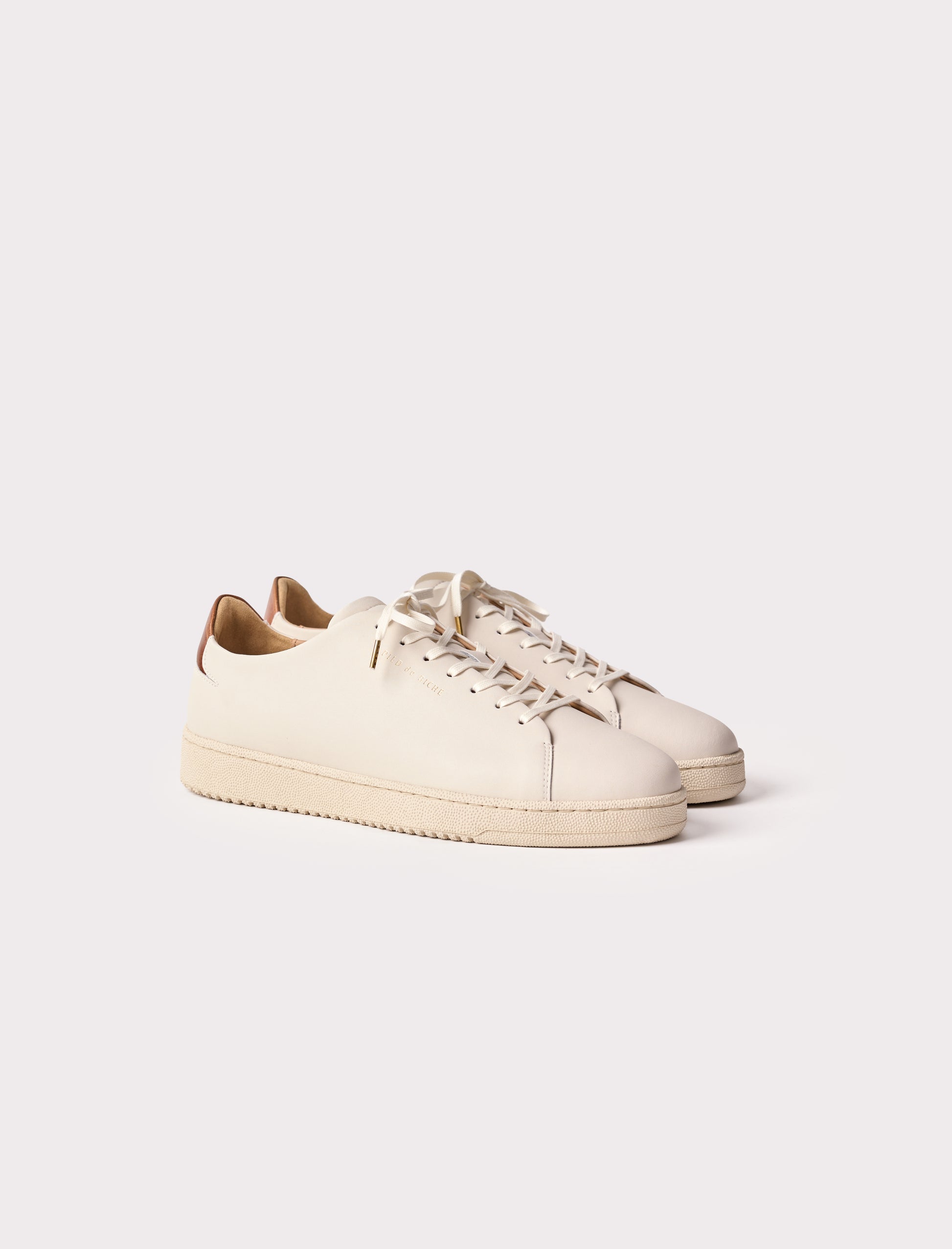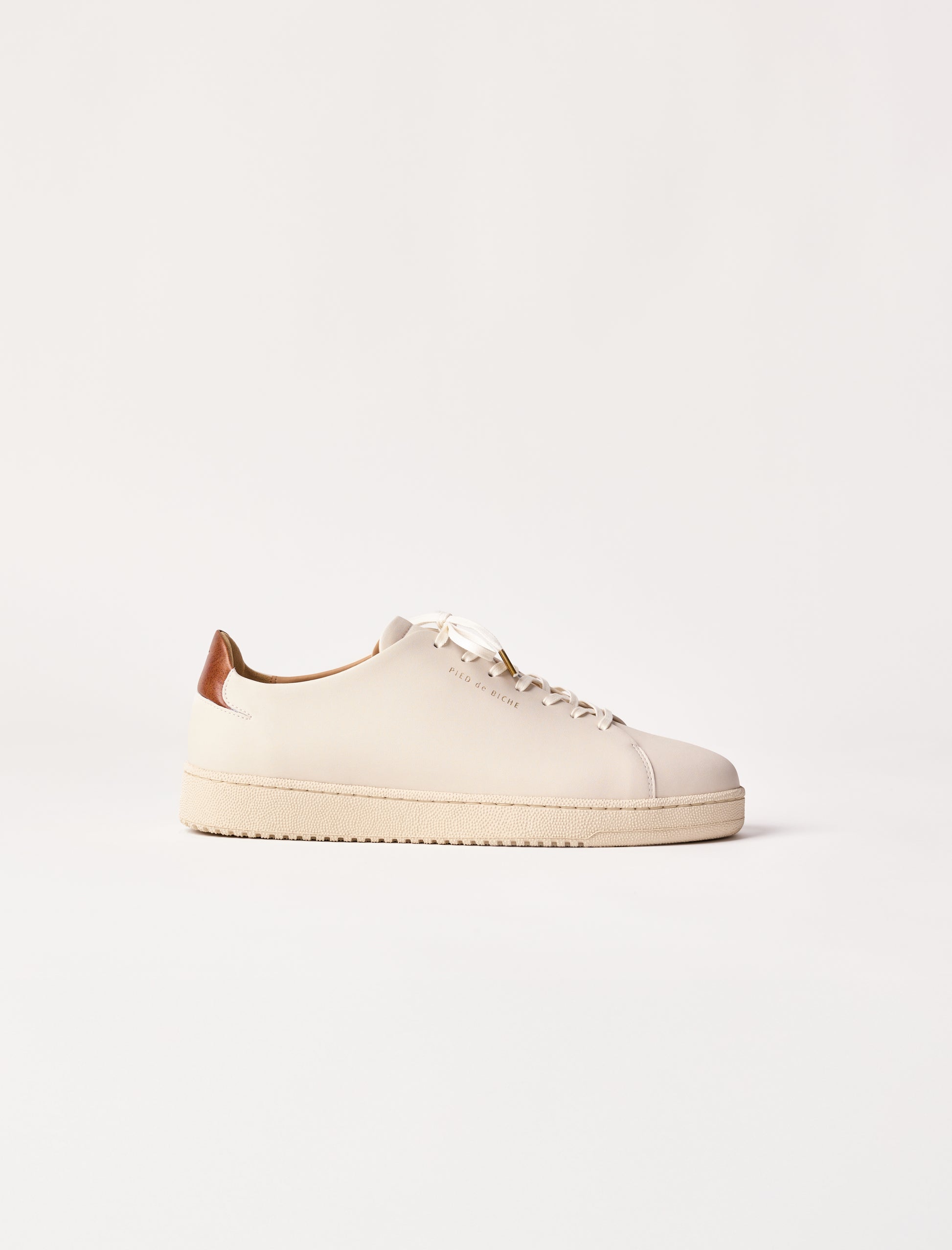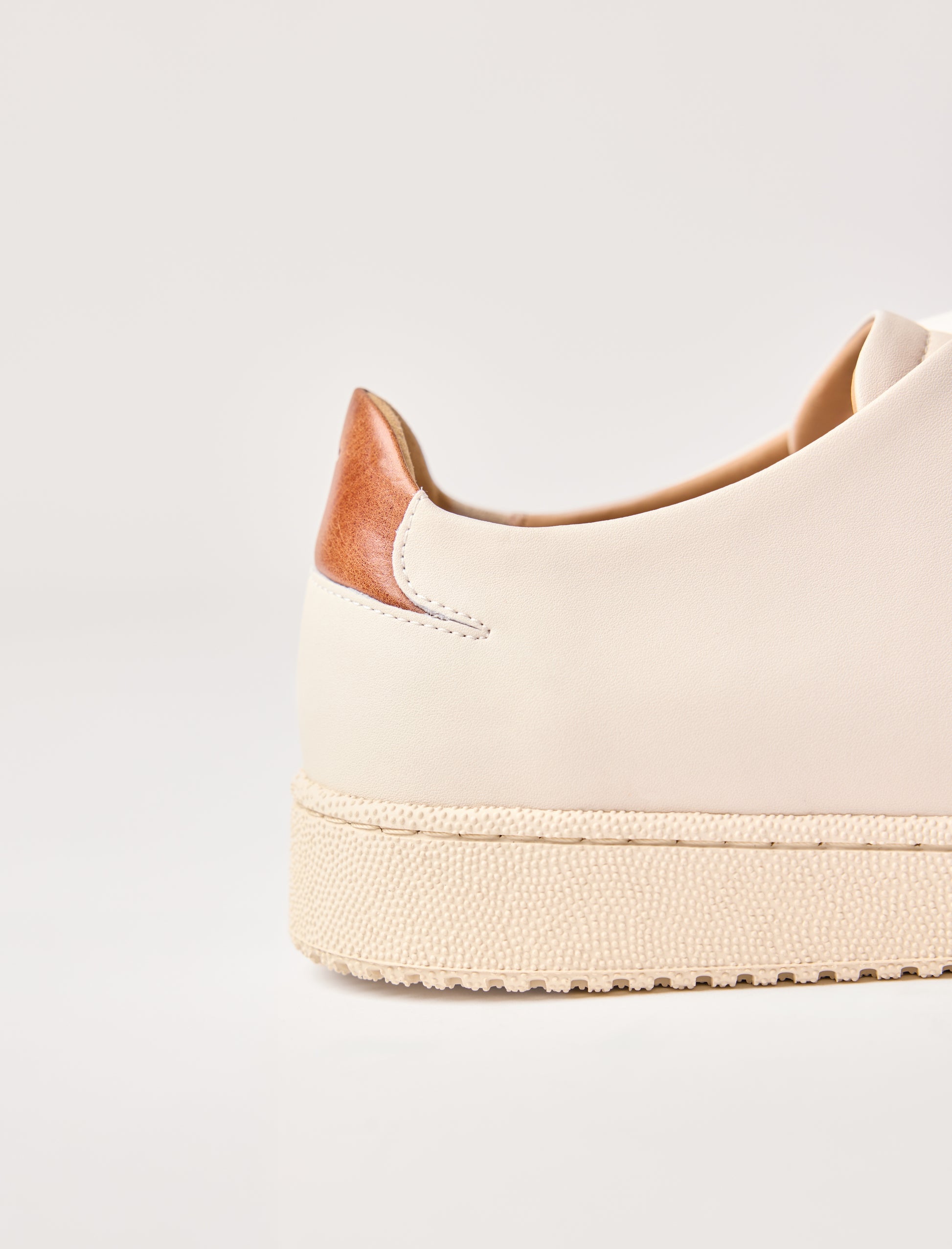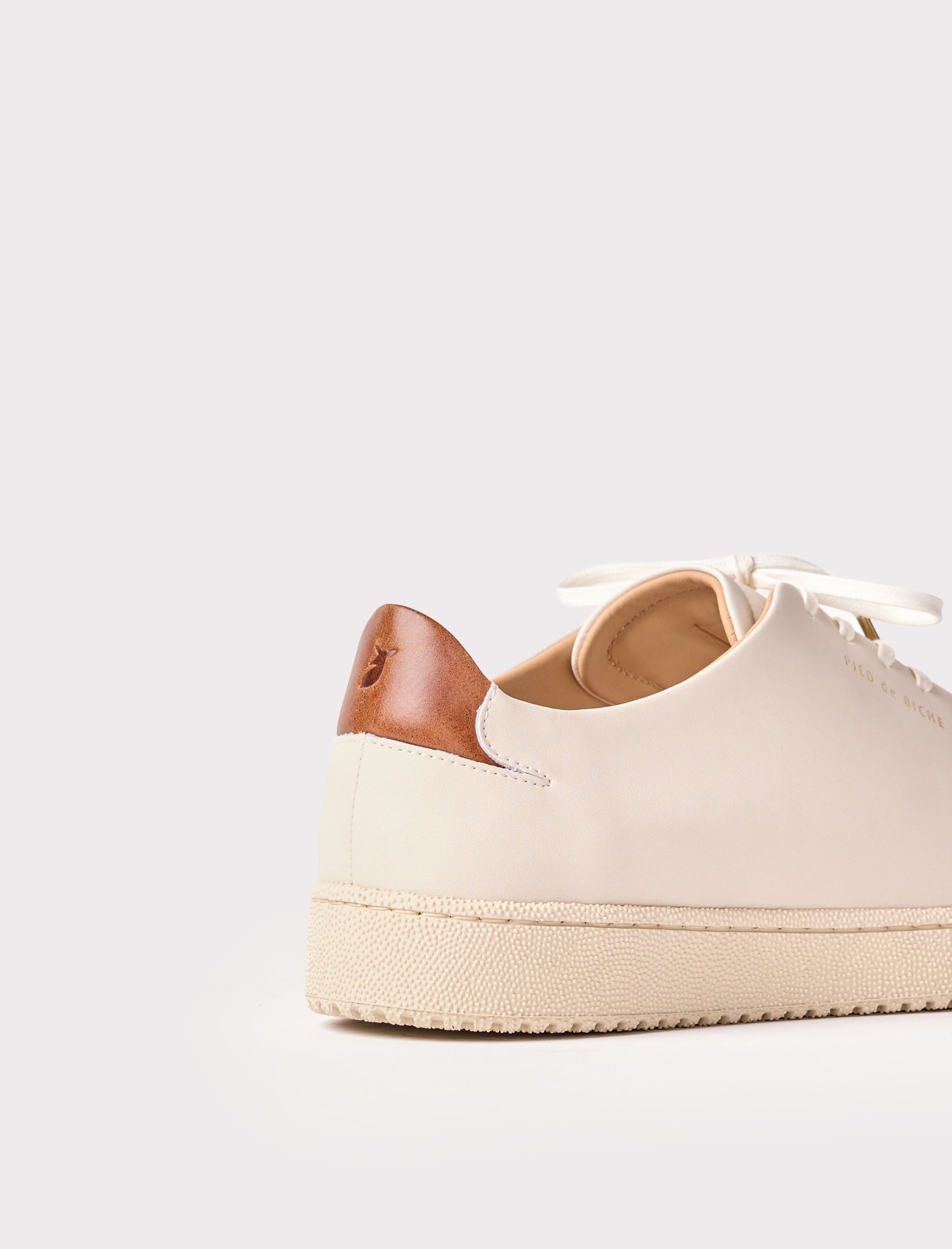 - Sneakers en cuir de vachette lisse blanc avec un empiècement à l'arrière en cuir pull-up havane