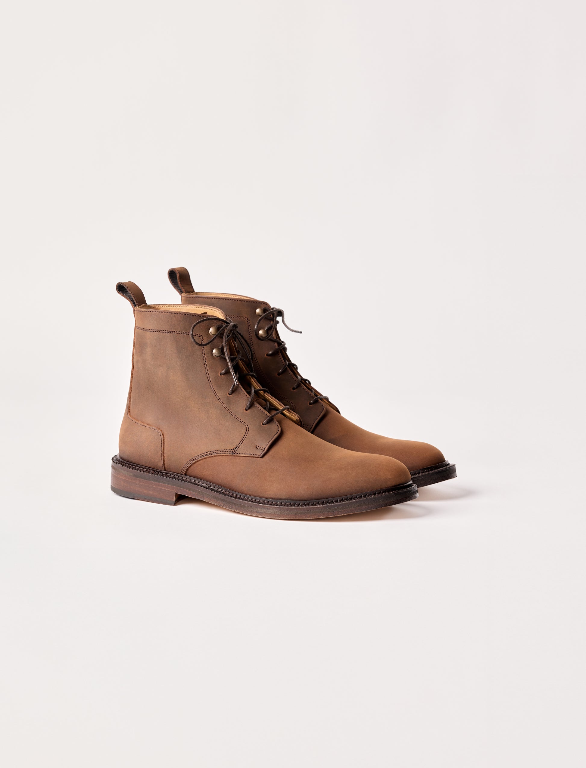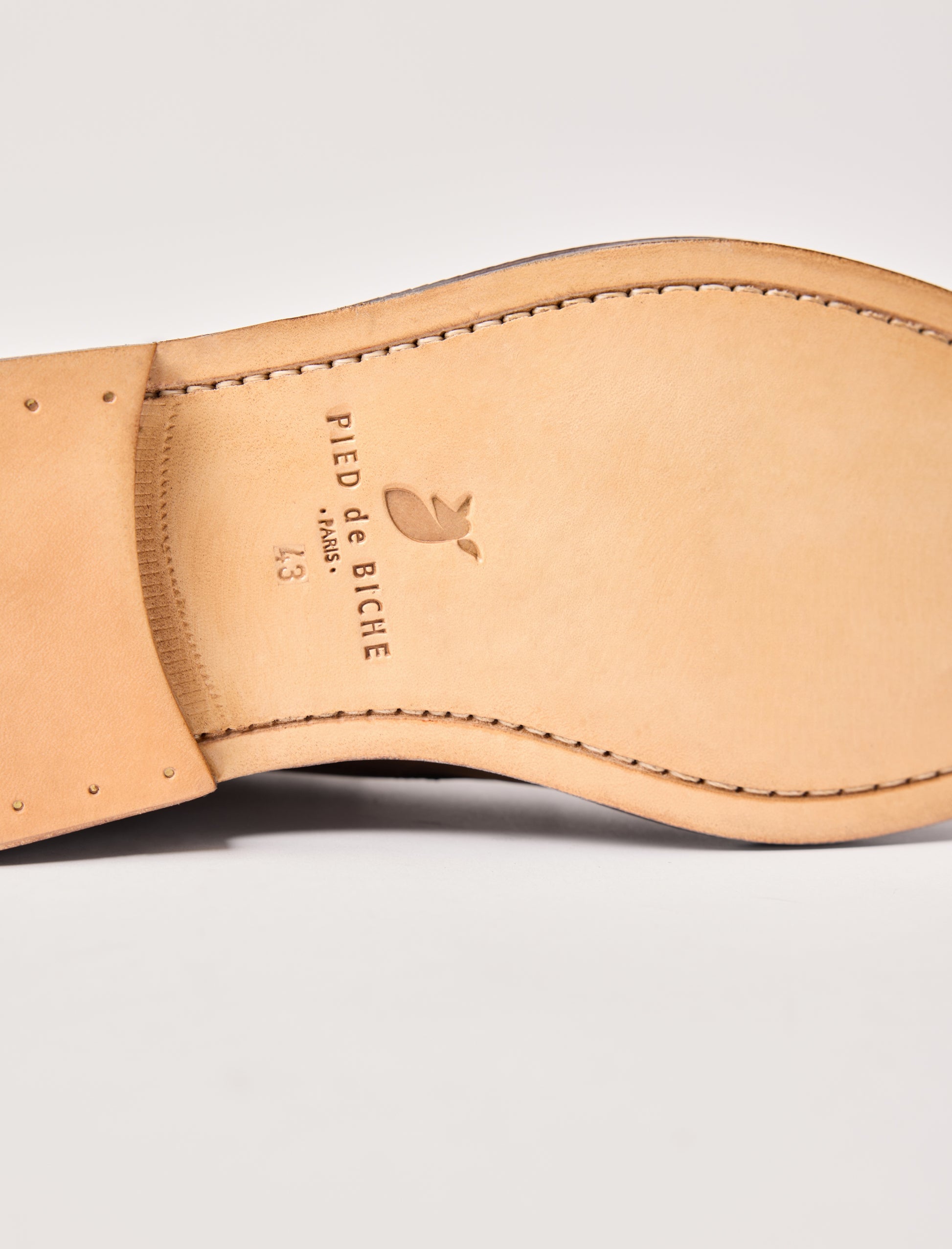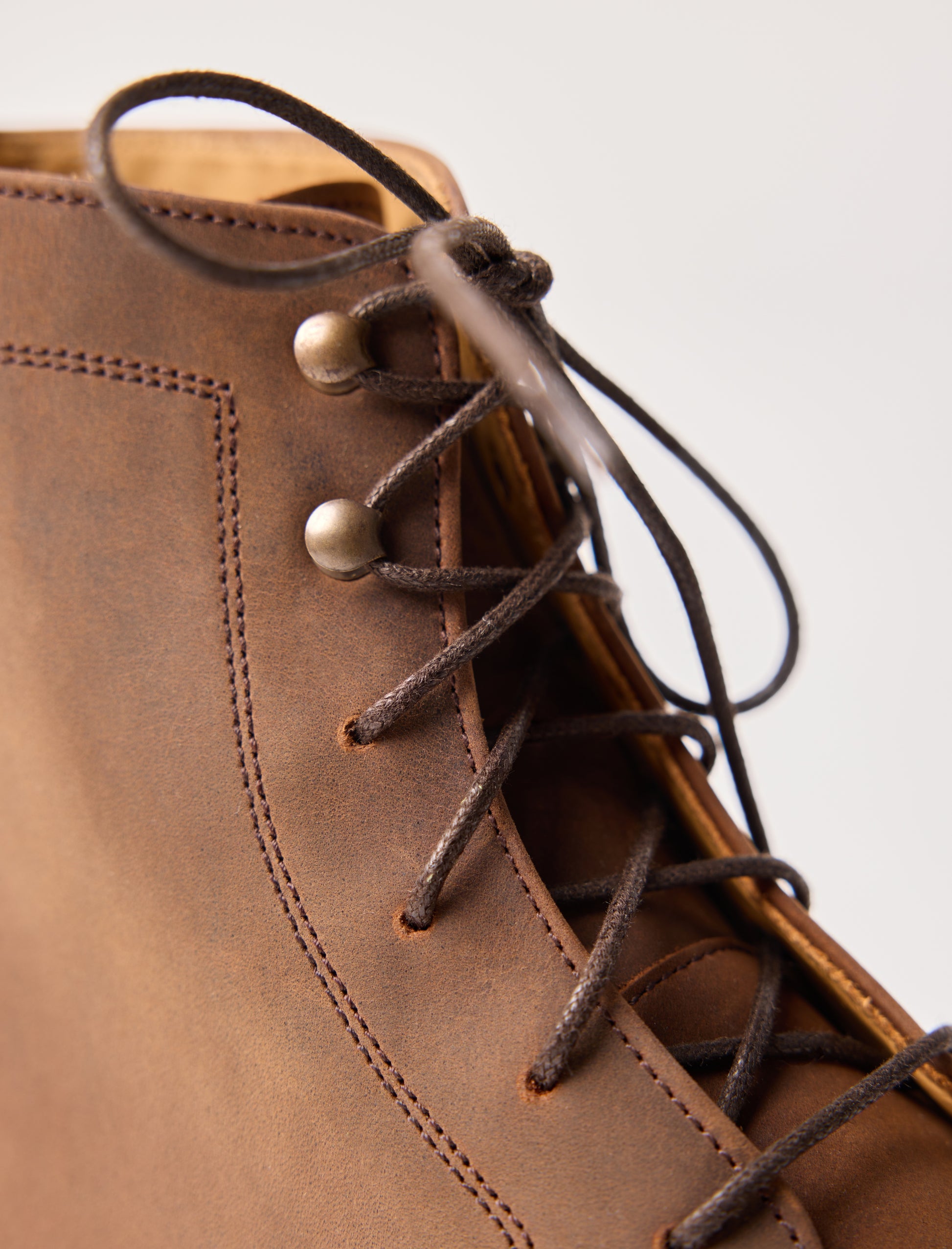 Fabriquées à la main au Portugal, ces combat boots pour homme présentent un montage et une finition irréprochables. Chez Pied de Biche, la durabilité est au cœur de notre processus de création. Nous valorisons les pièces qui se bonifient avec le temps et nous nous assurons de concevoir des chaussures qui deviennent de plus en plus belles avec l'âge. Chaque détail de cette bottine a été soigneusement pensé : cuir 100% italien, construction cousu Blake, tige et semelle en cuir avec trépointe en cuir.