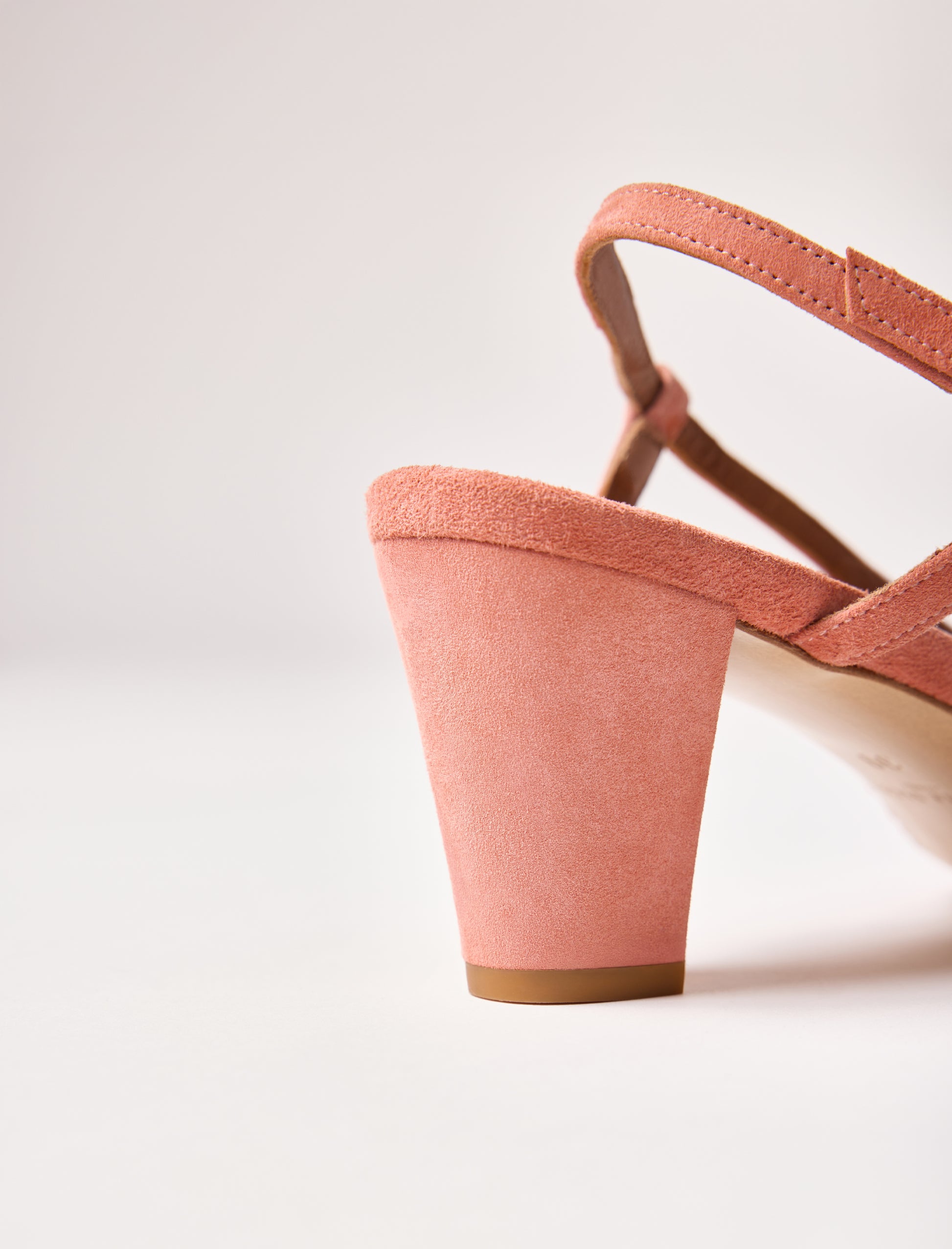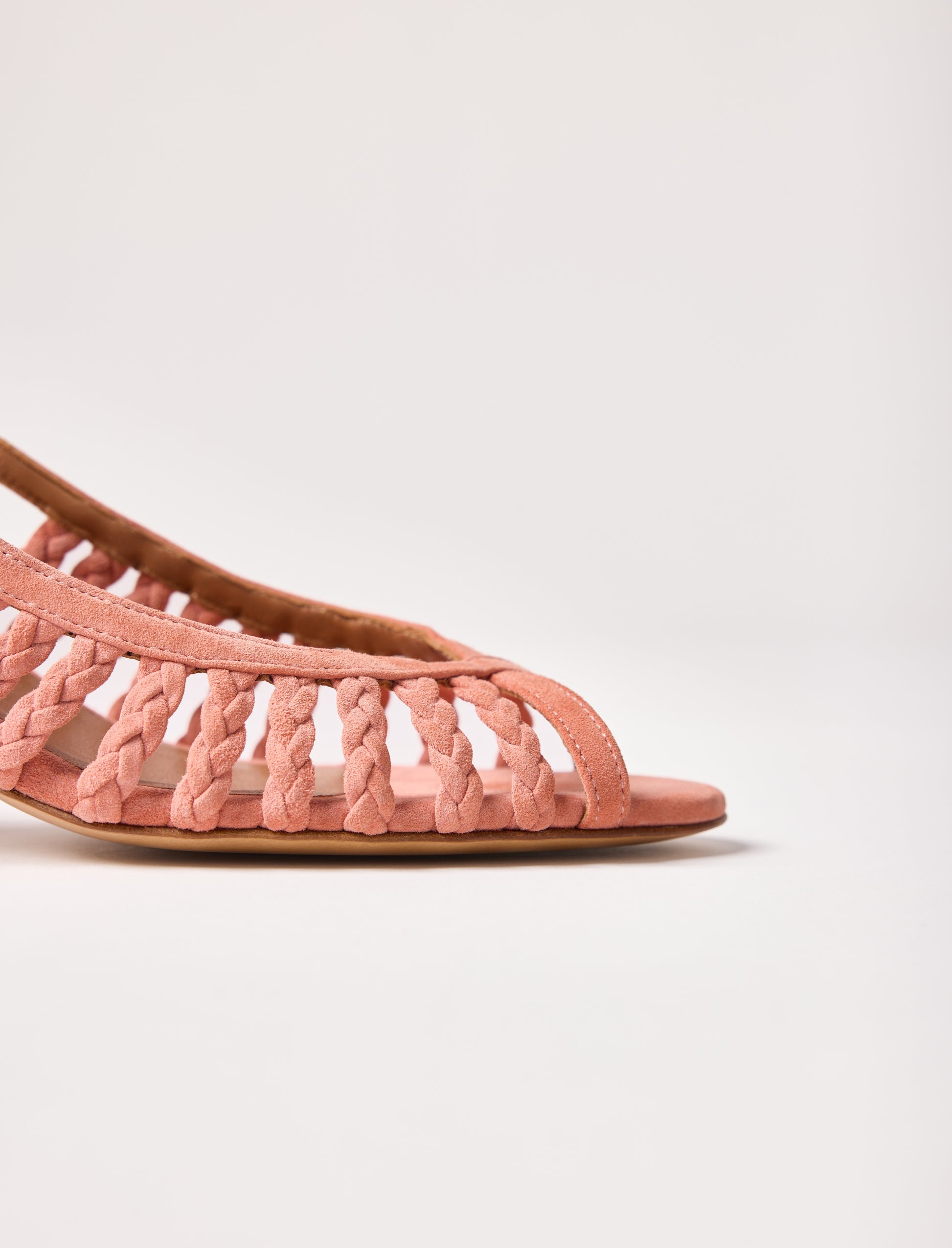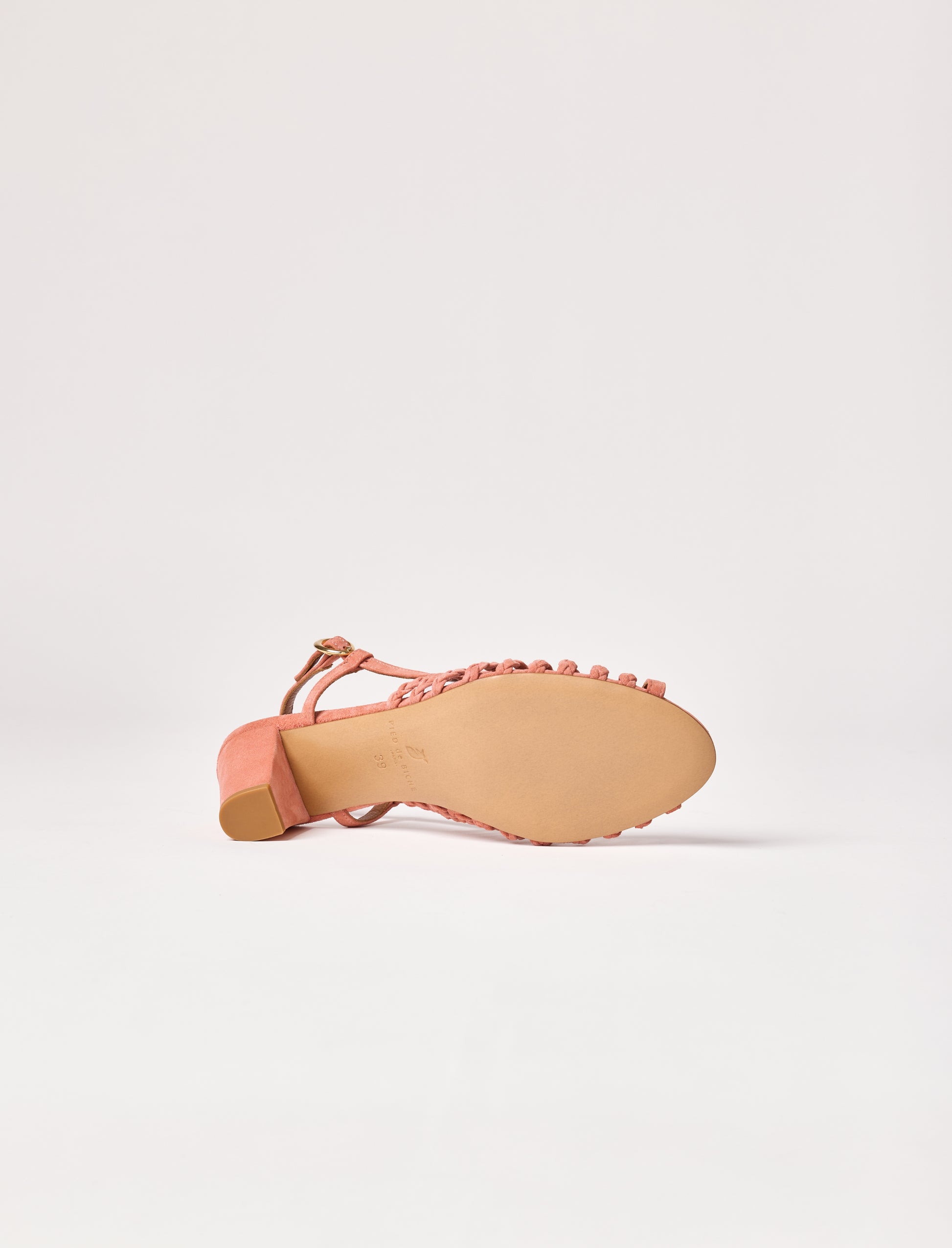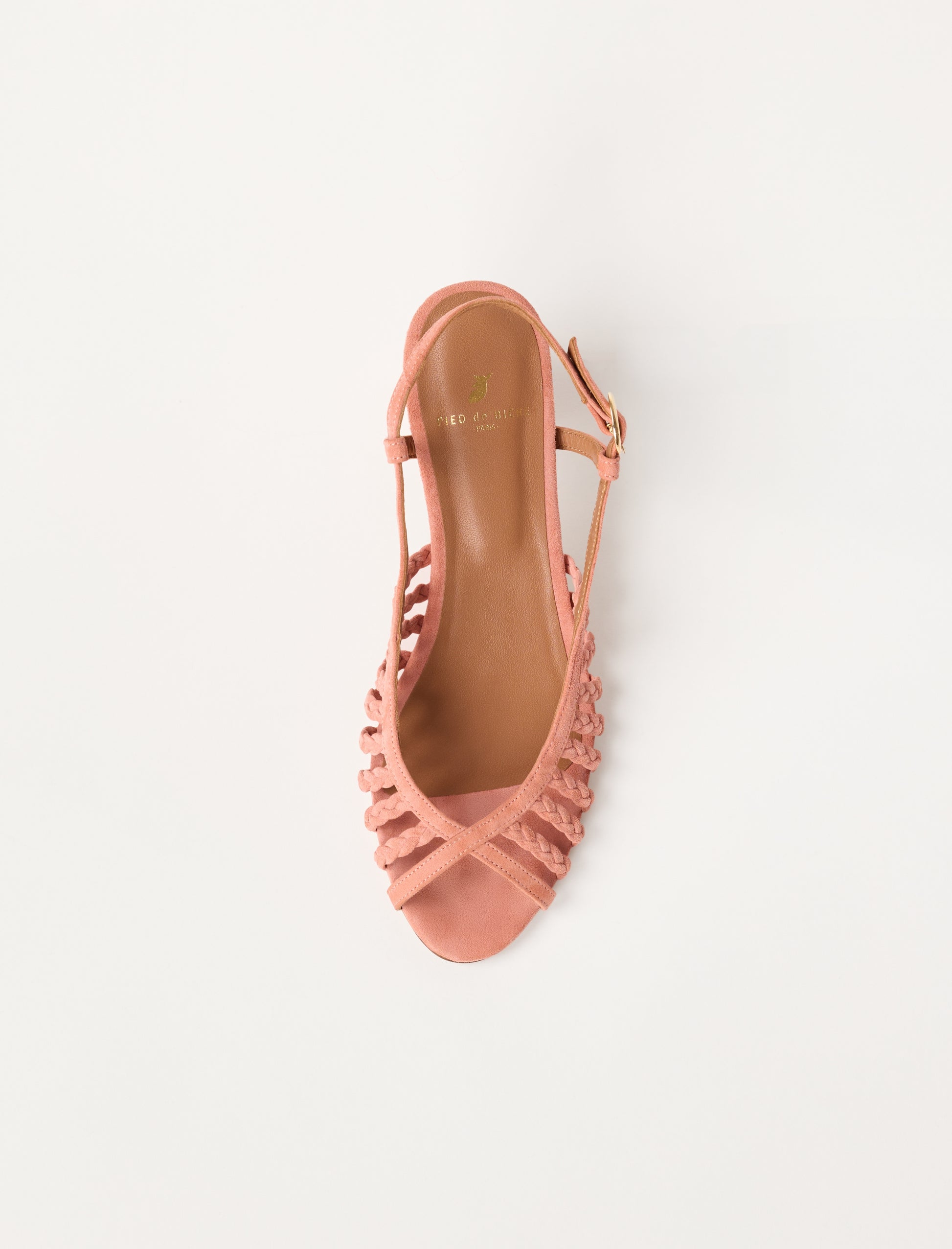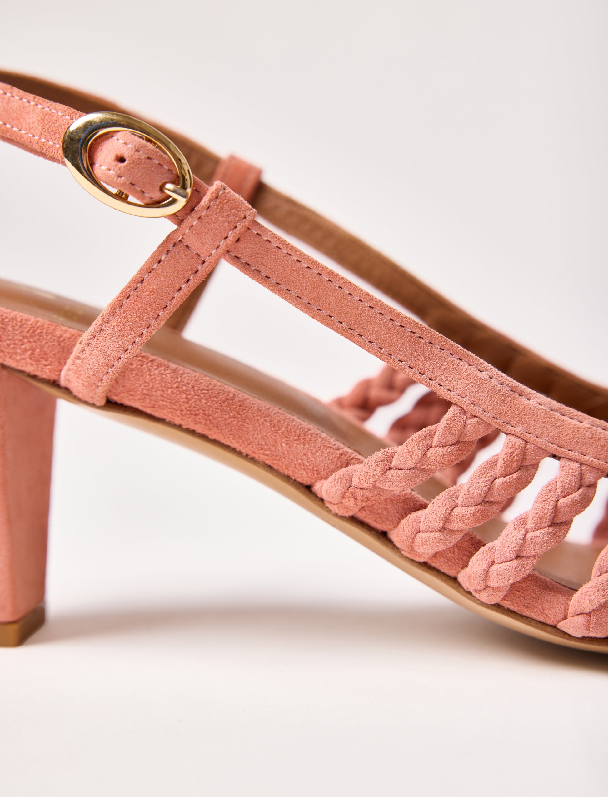 - Sandales à talons en cuir suède de chèvre rose poudré, dotées de brides tressées sur le côté