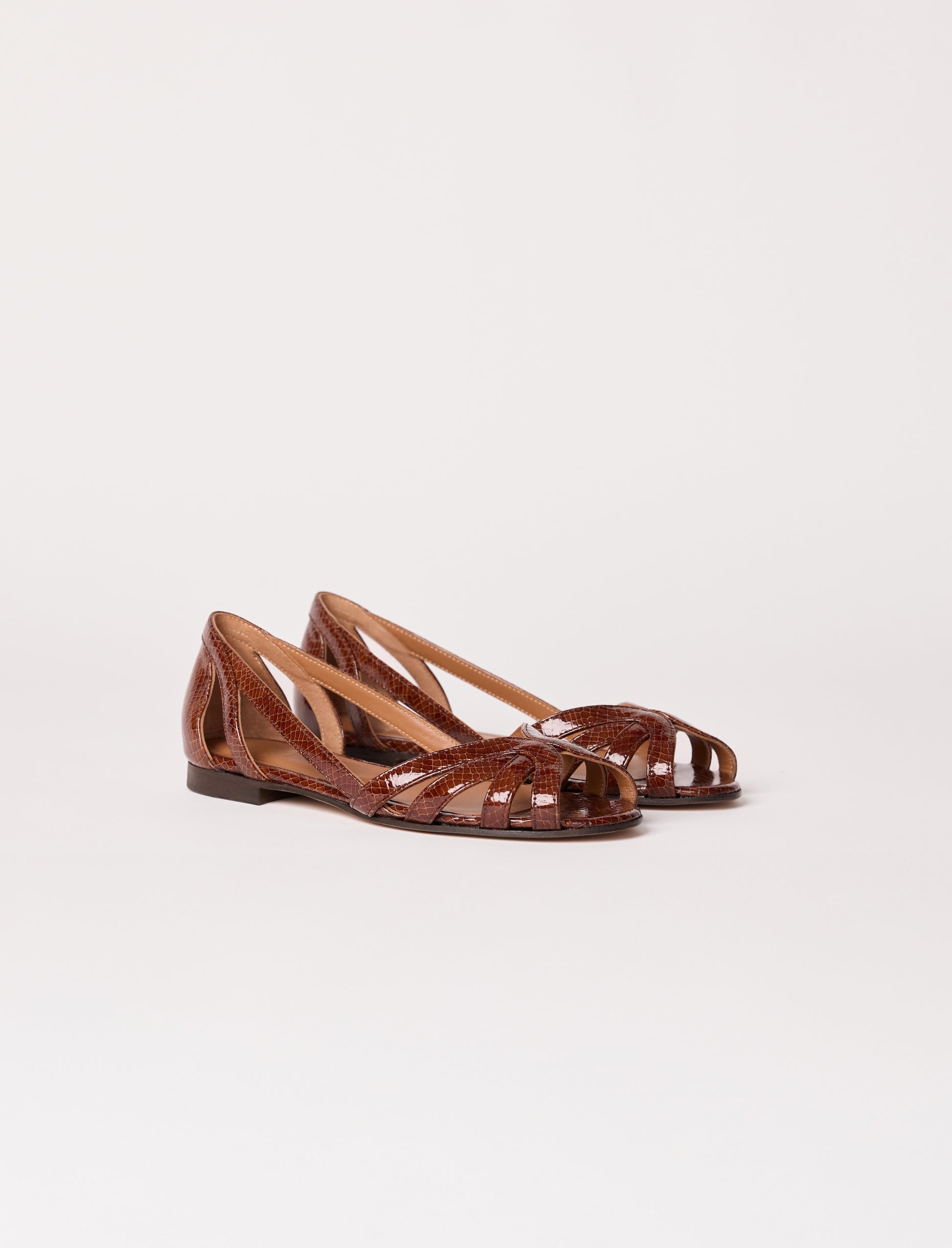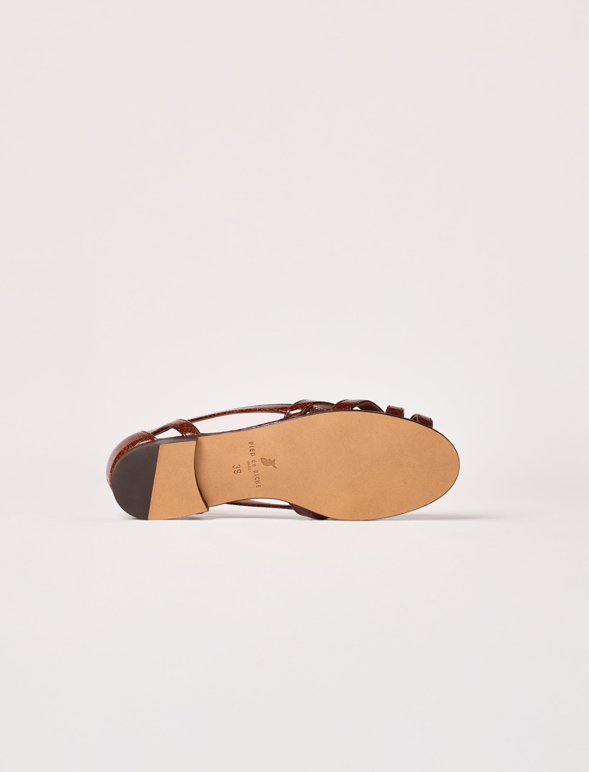 Indispensable du vestiaire féminin, la sandale Hortensia se réinvente cette saison dans un cuir verni reptile acajou. À la fois élégante et polyvalente, elle assure une allure raffinée en toute circonstance.