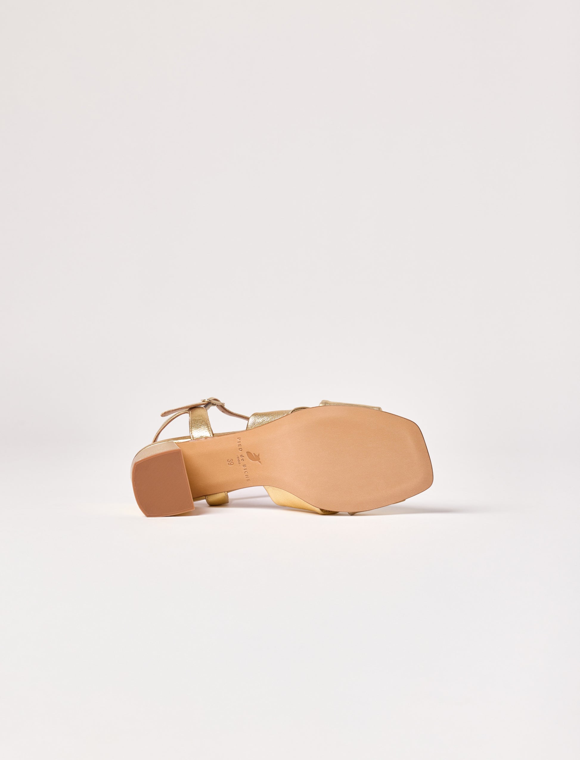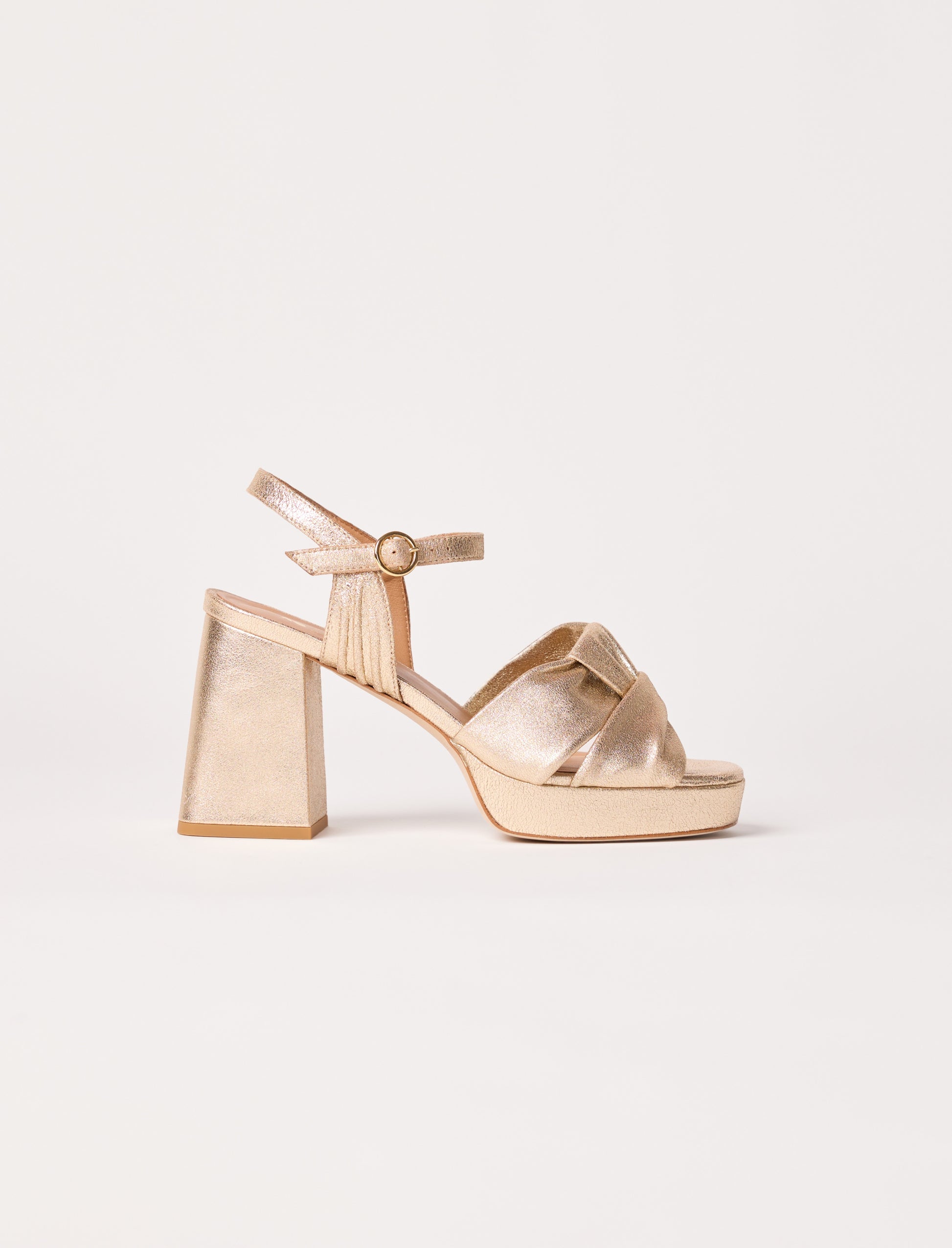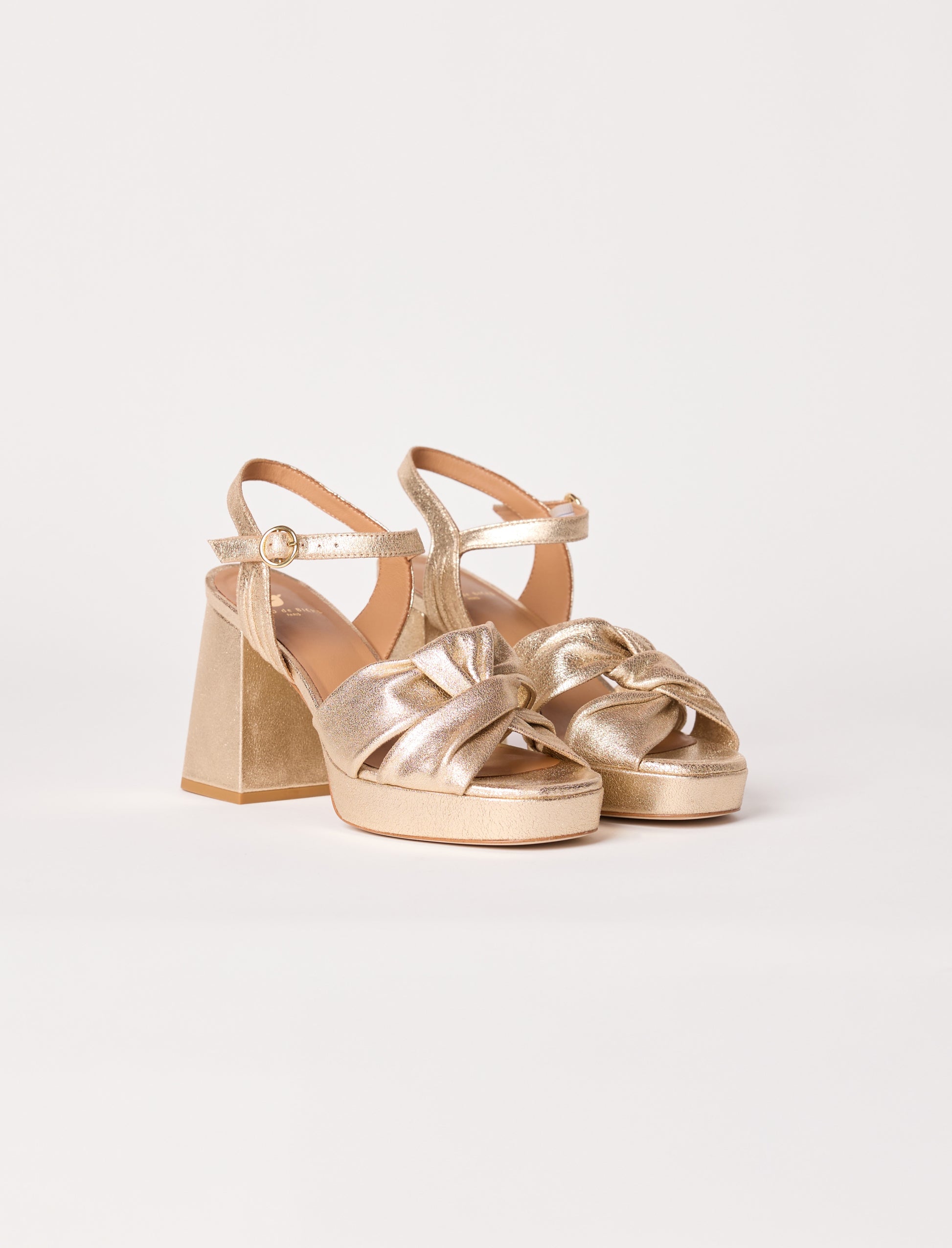 - Sandales à plateformes en cuir de chèvre lisse doré avec une torsade à l'avant