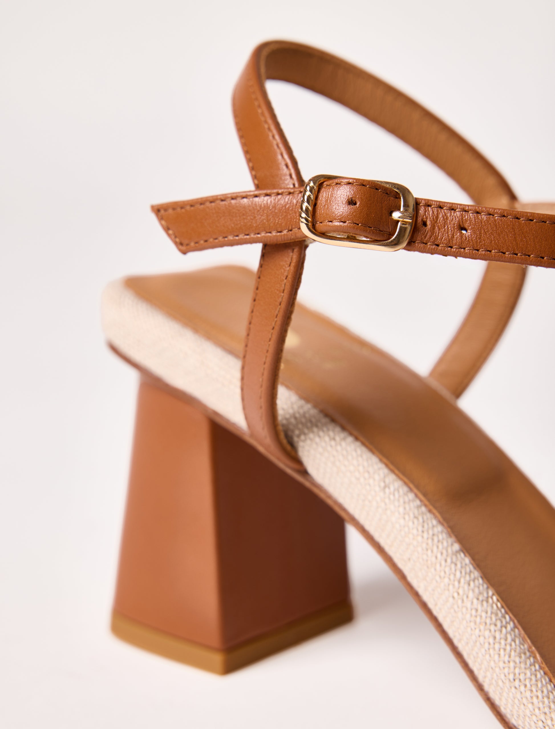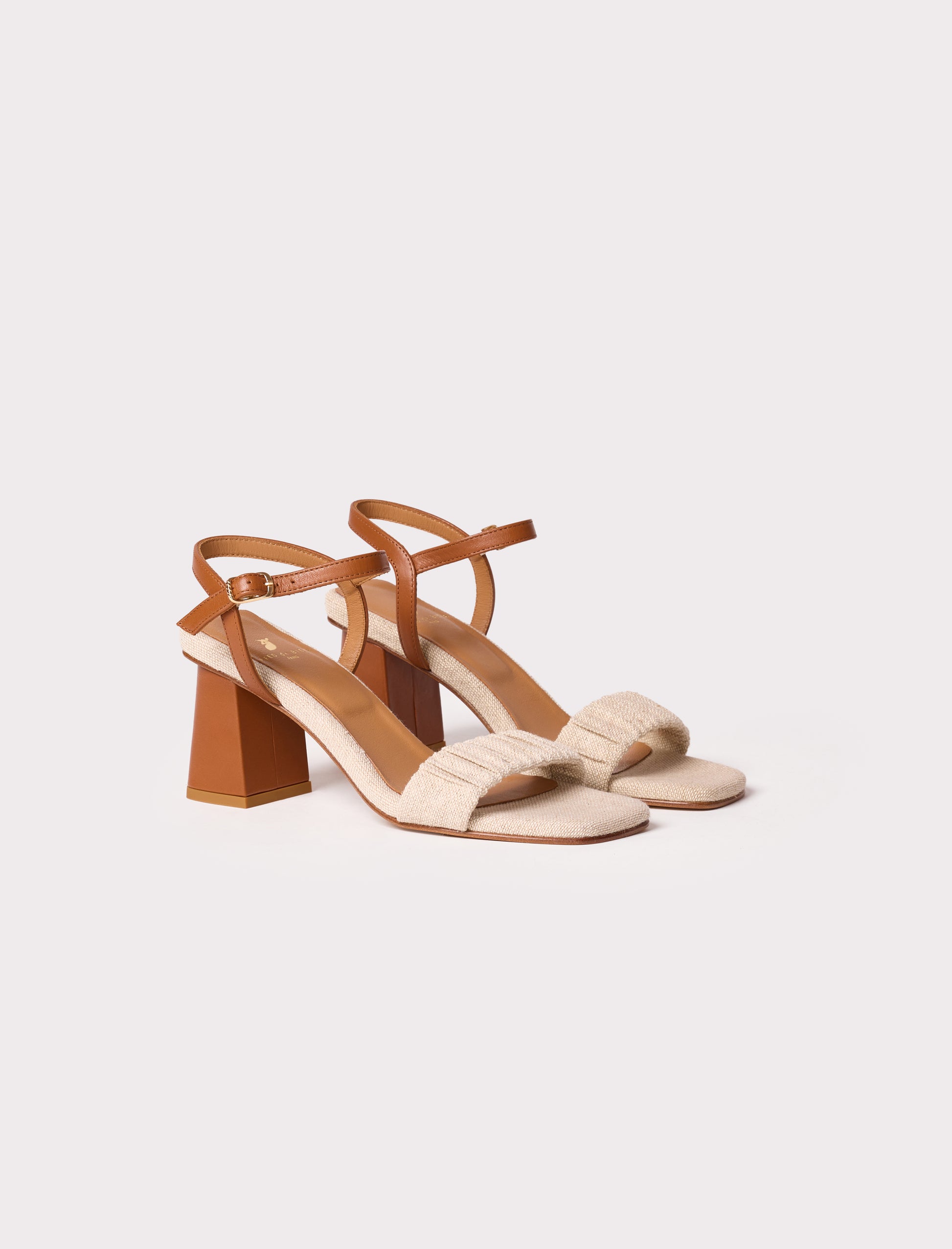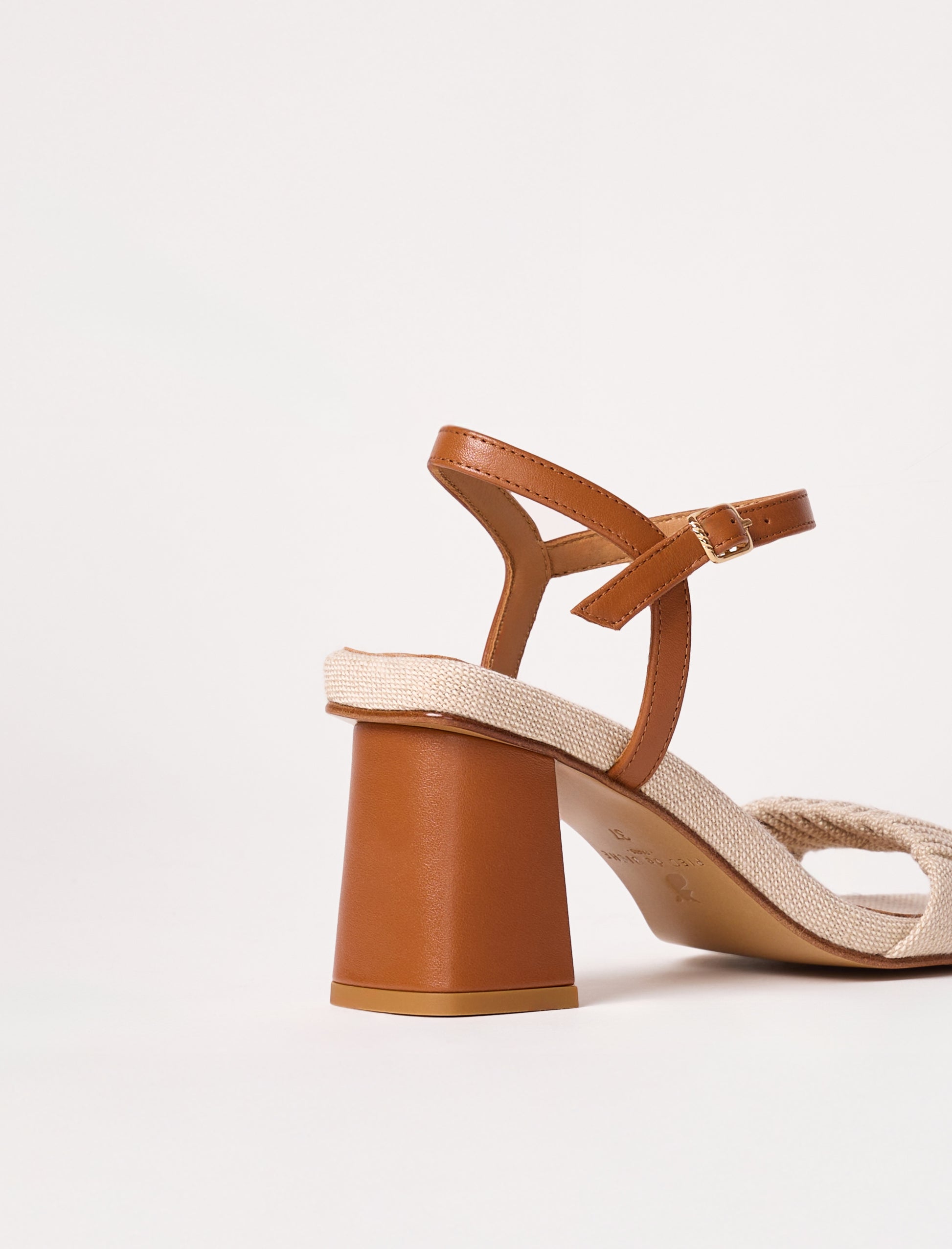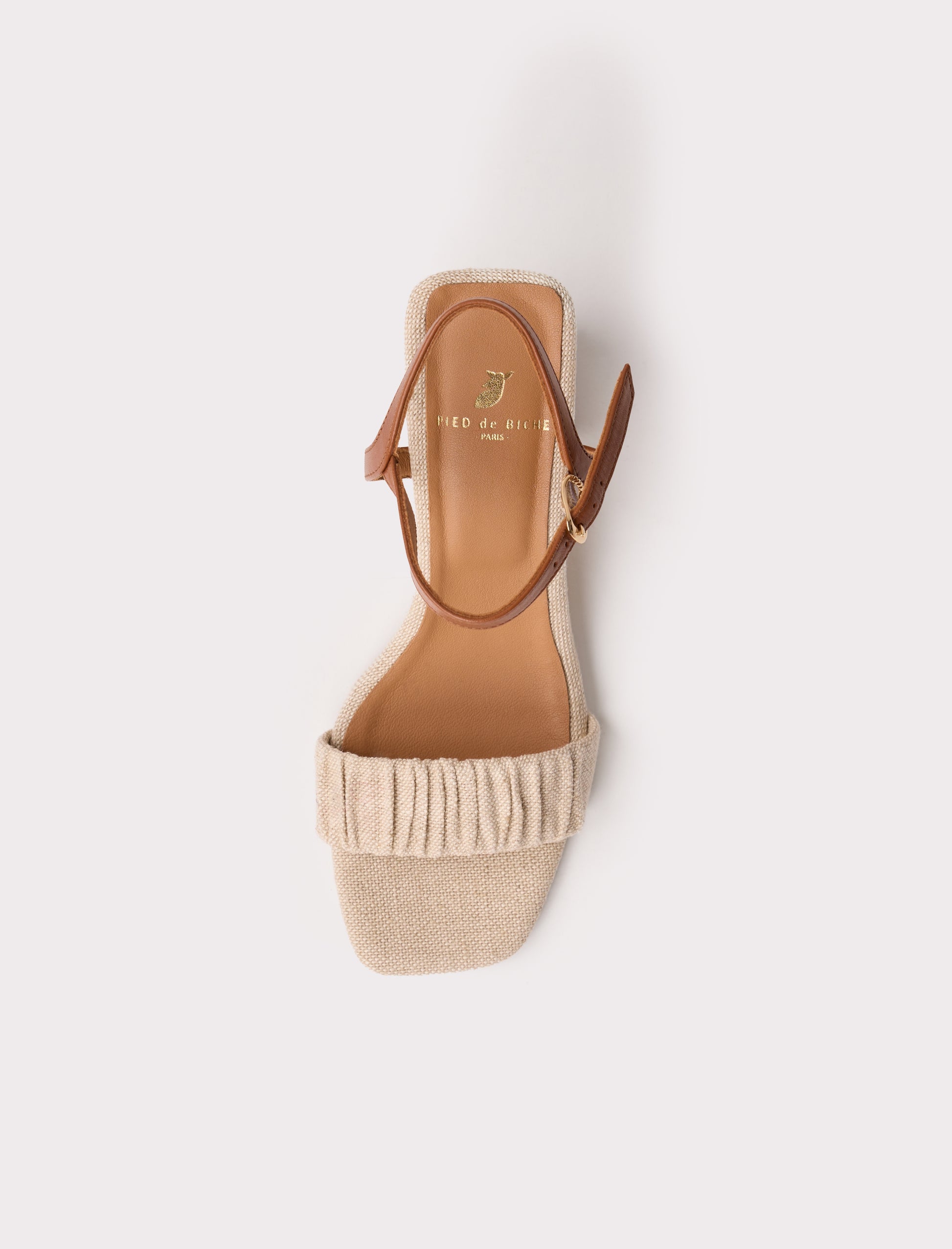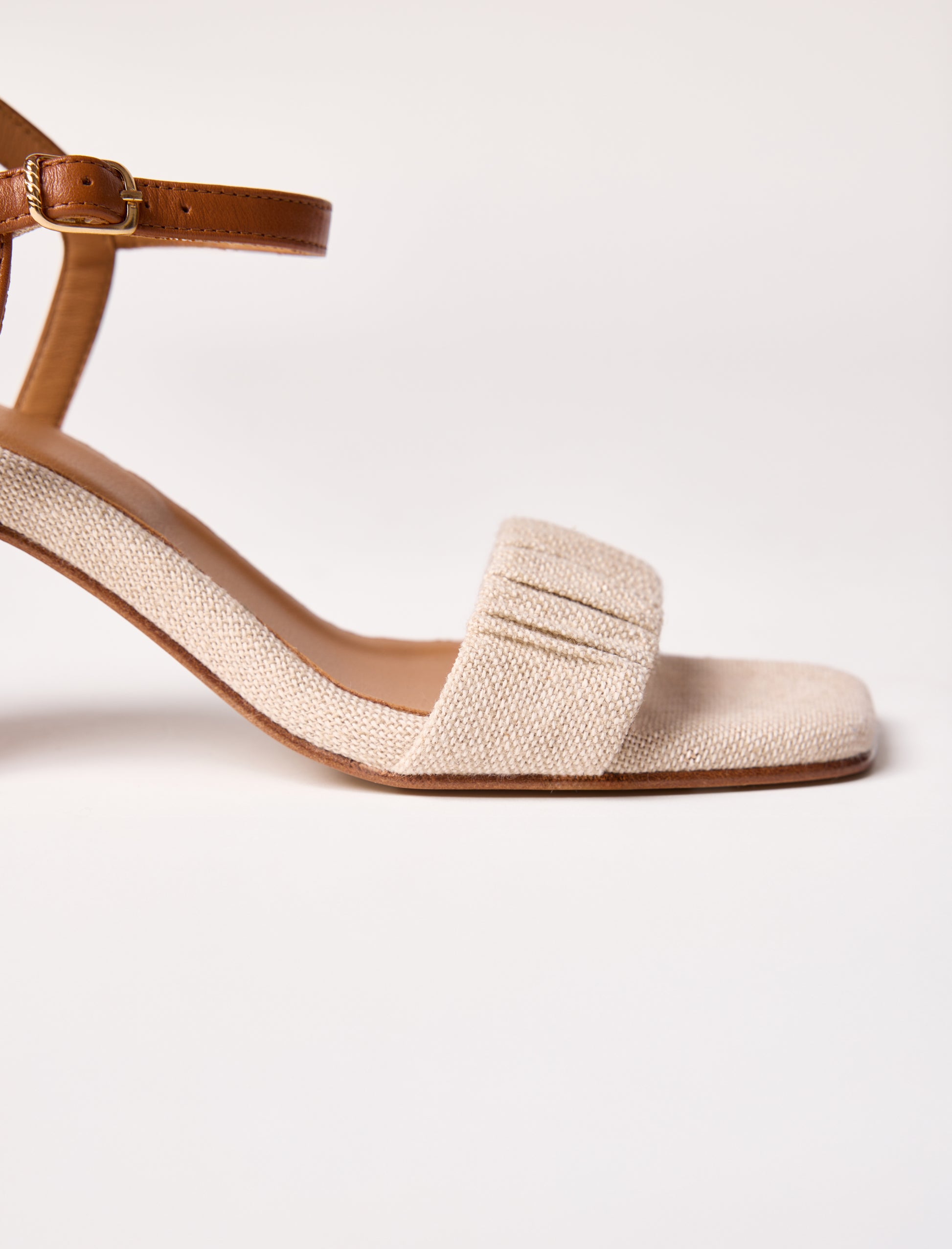 - Sandales à talons en toile (70% coton, 30% lin) avec une bride froncée sur l'avant et une boucle doré torsadée