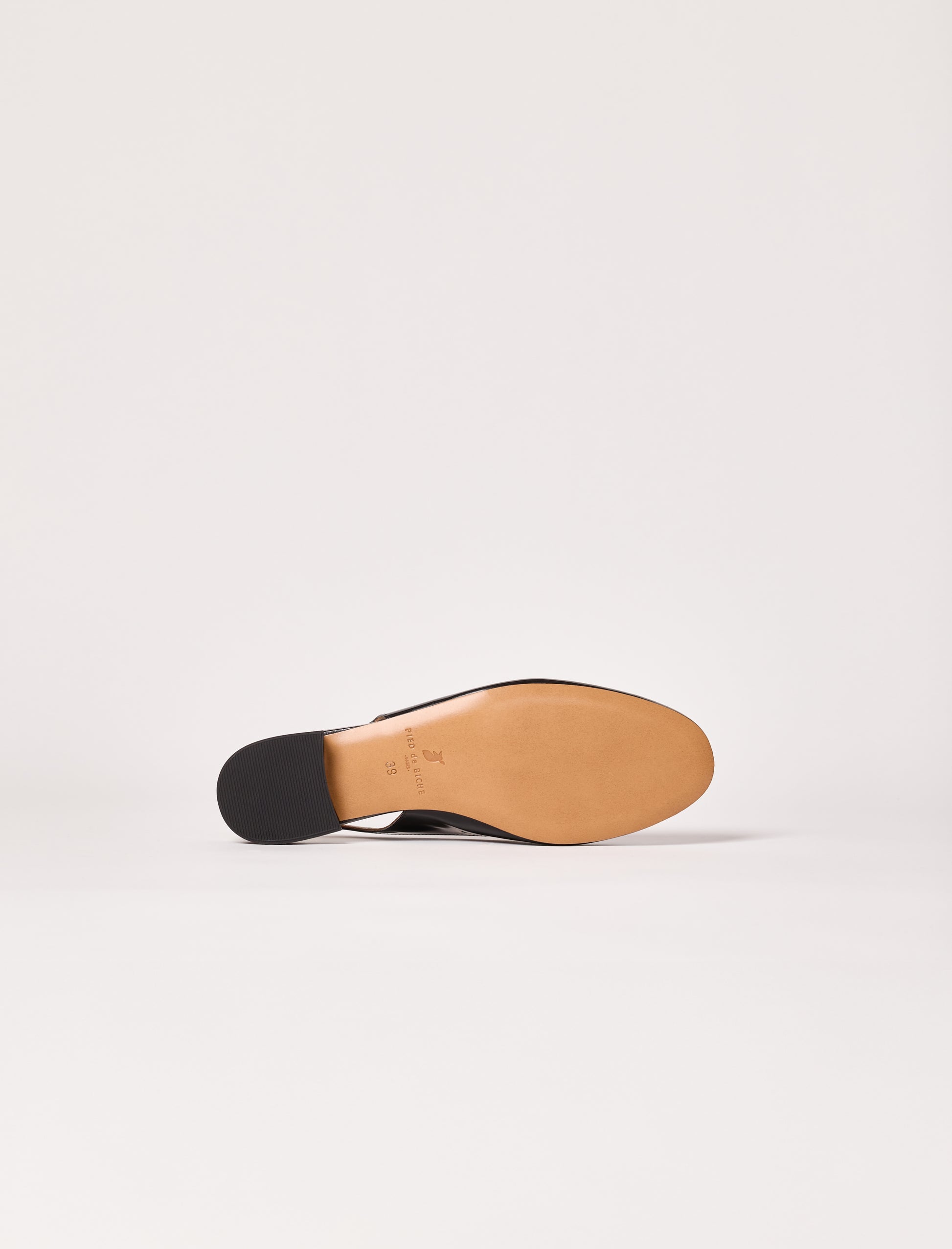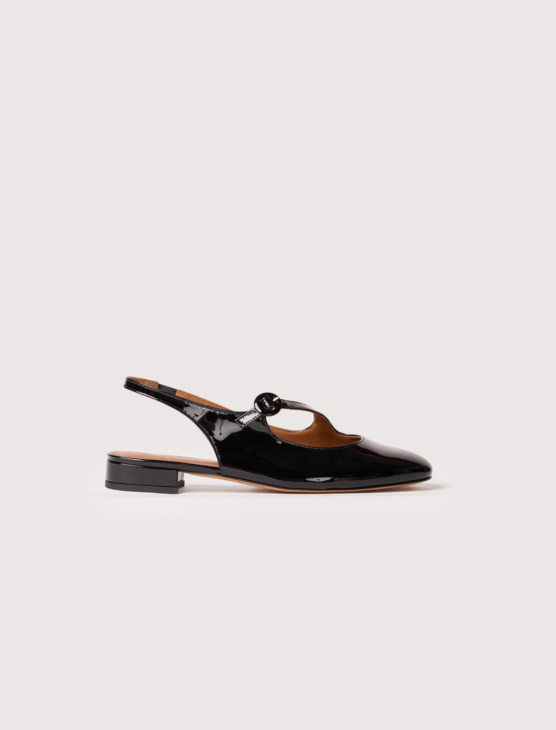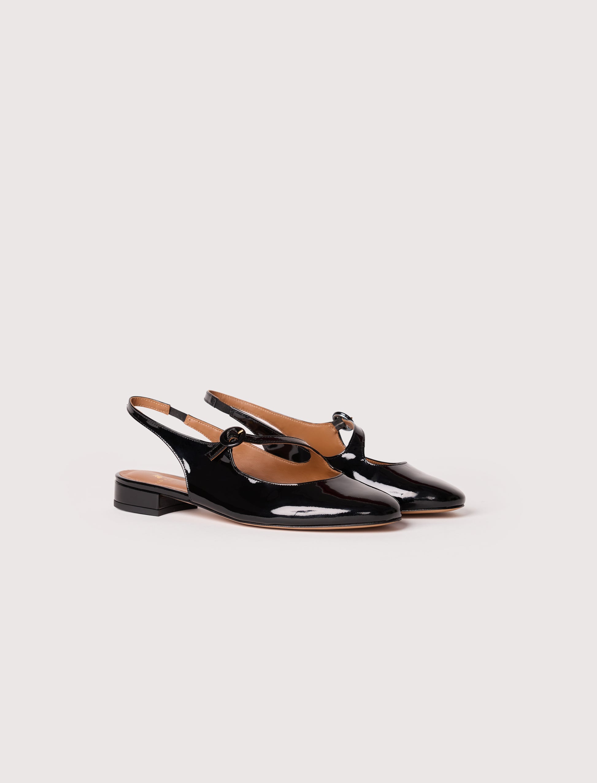 - Ballerines en cuir verni de vachette, dotées de brides asymétriques sur l’avant du pied
