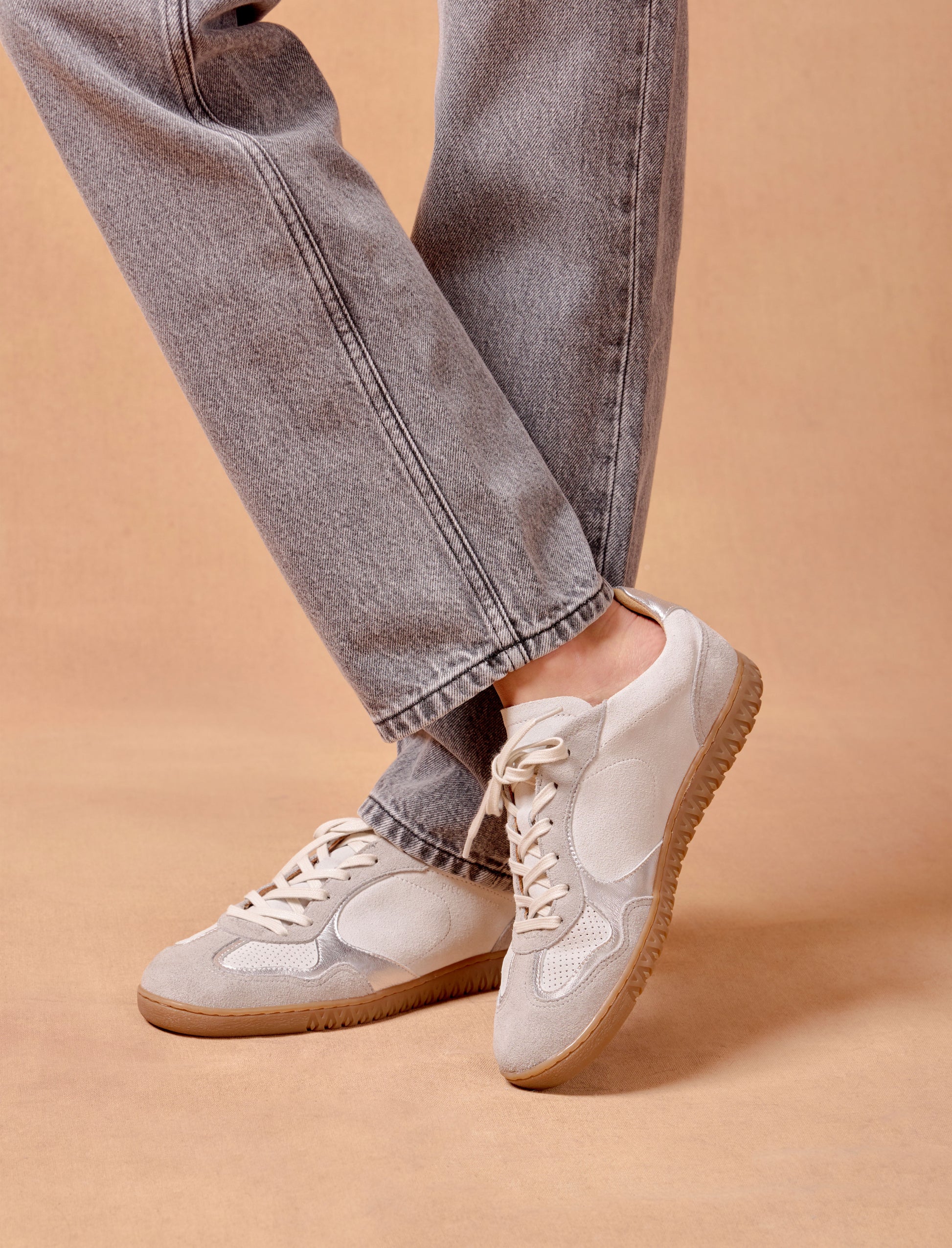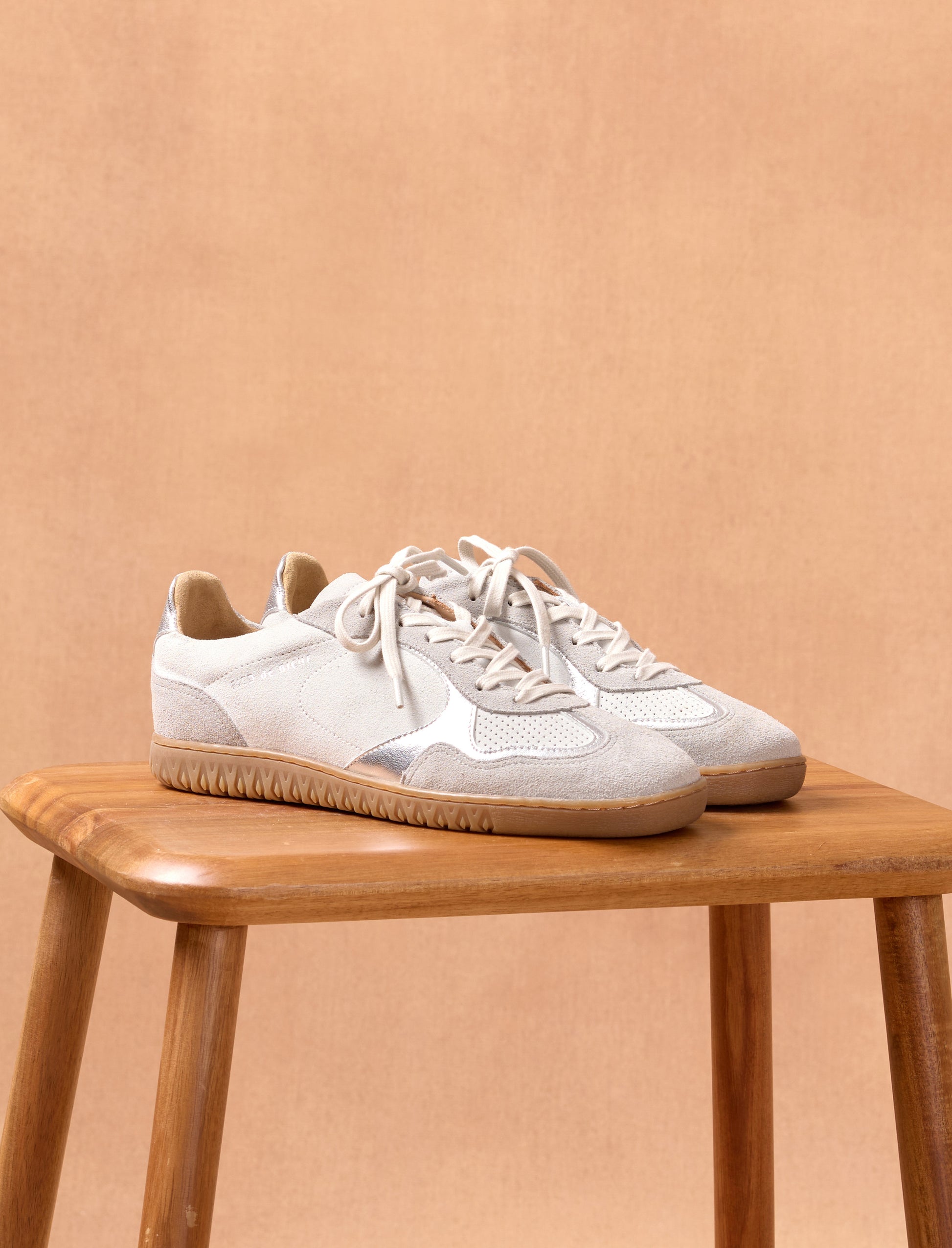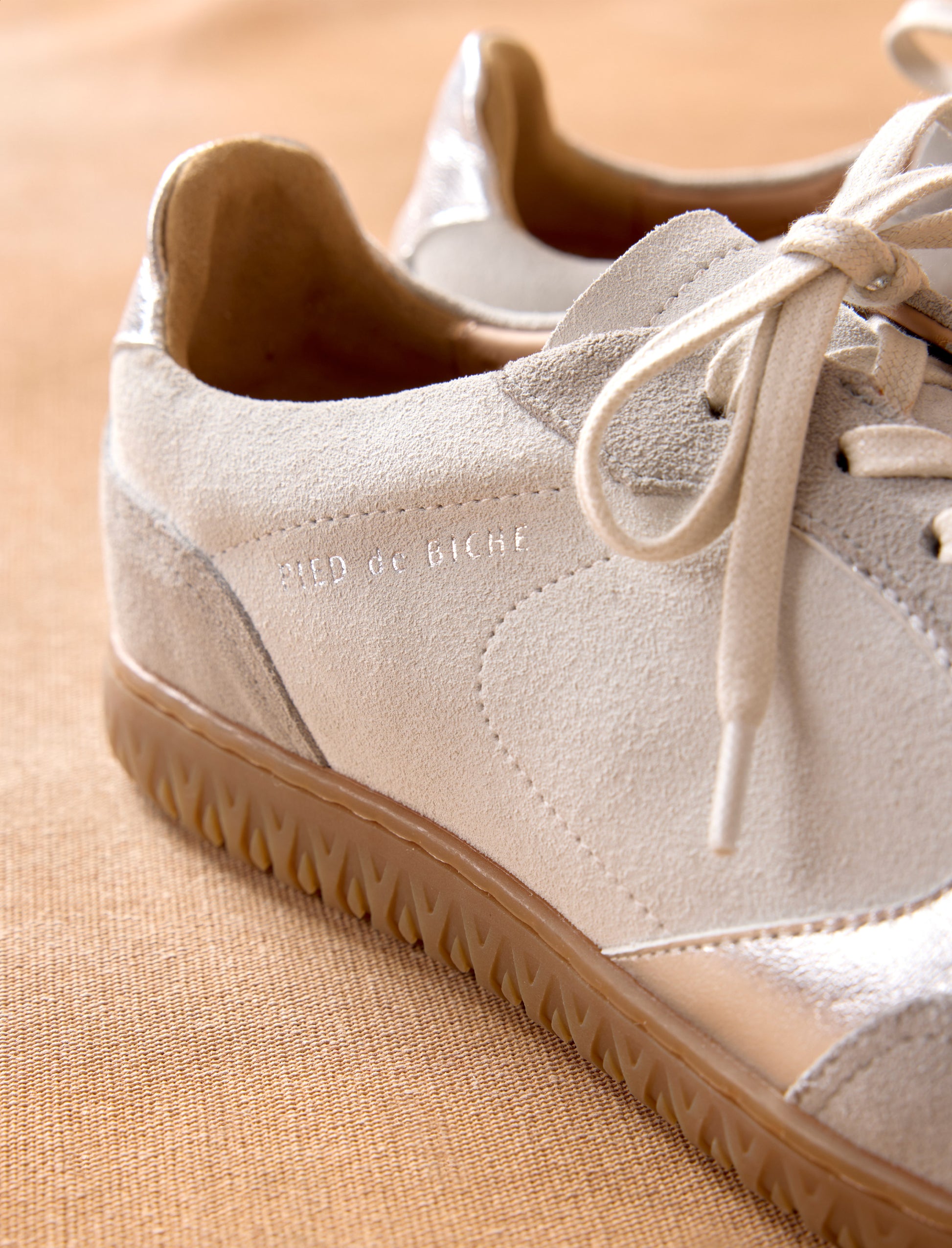 - Sneakers en cuir veau velours beige et ses empiècement en cuir chèvre lamé argent