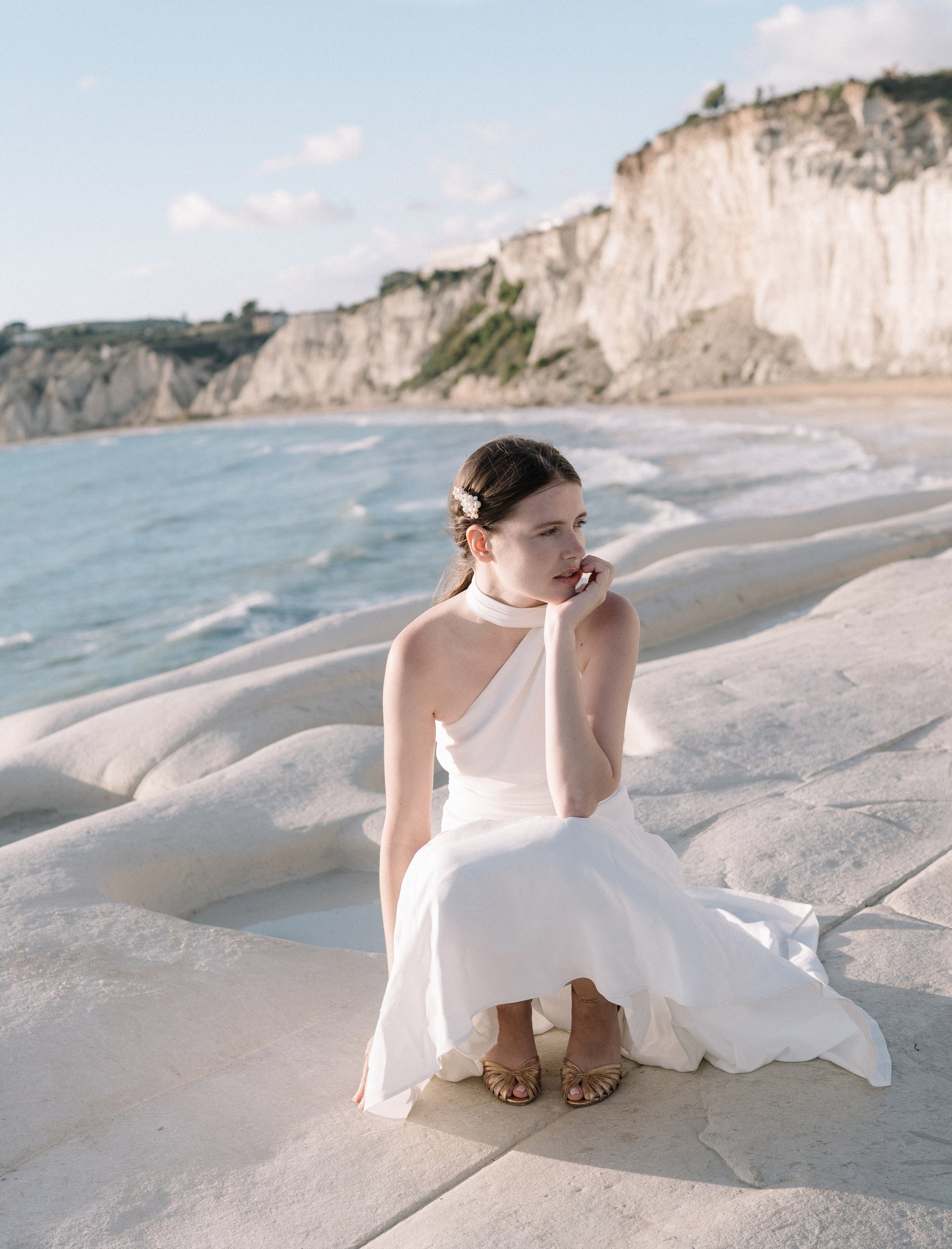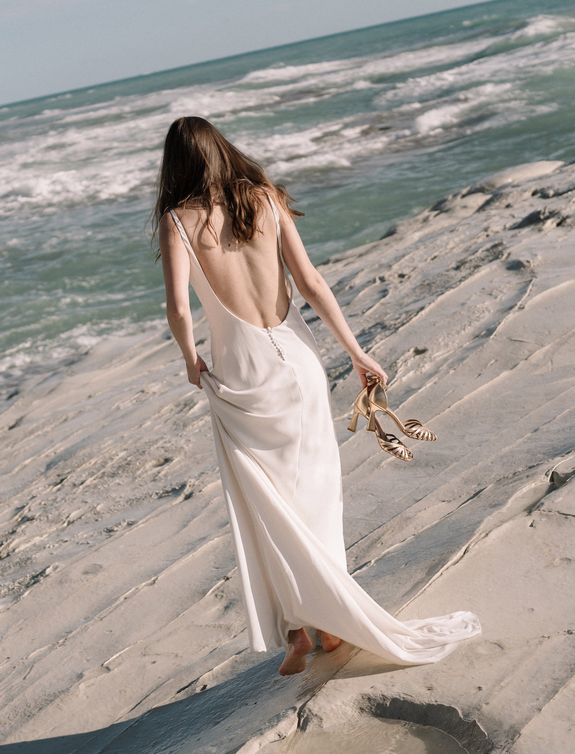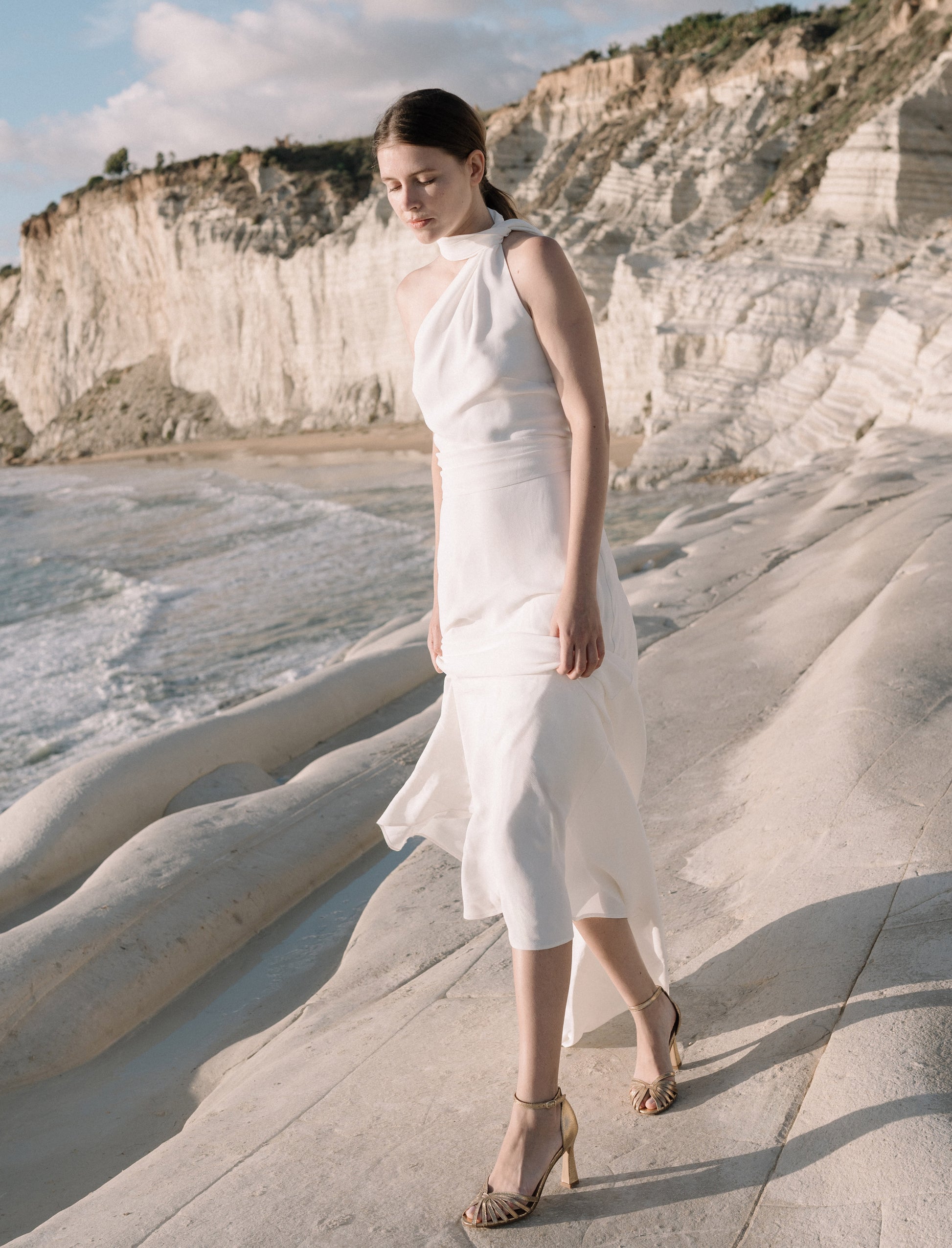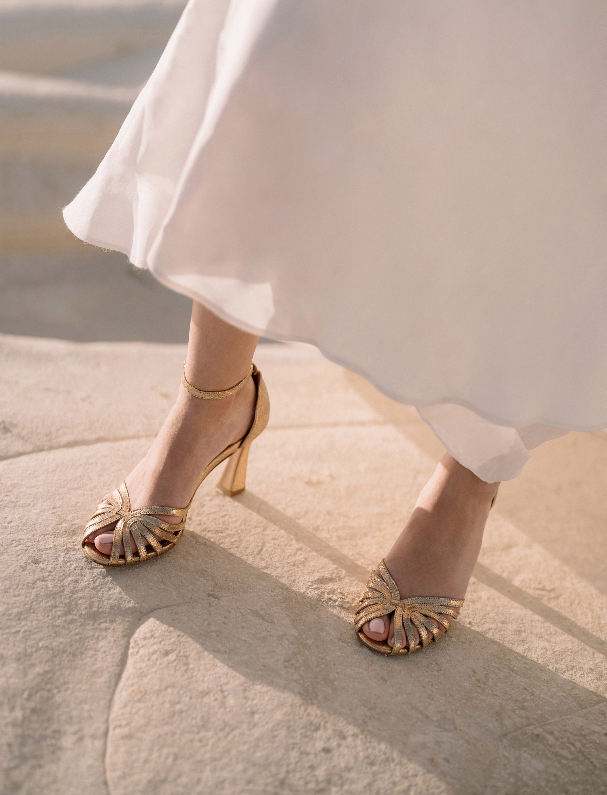 - Sandales à talons en cuir de chèvre lamé doré, avec des brides juxtaposés à l'avant et une boucle dorée torsadée
