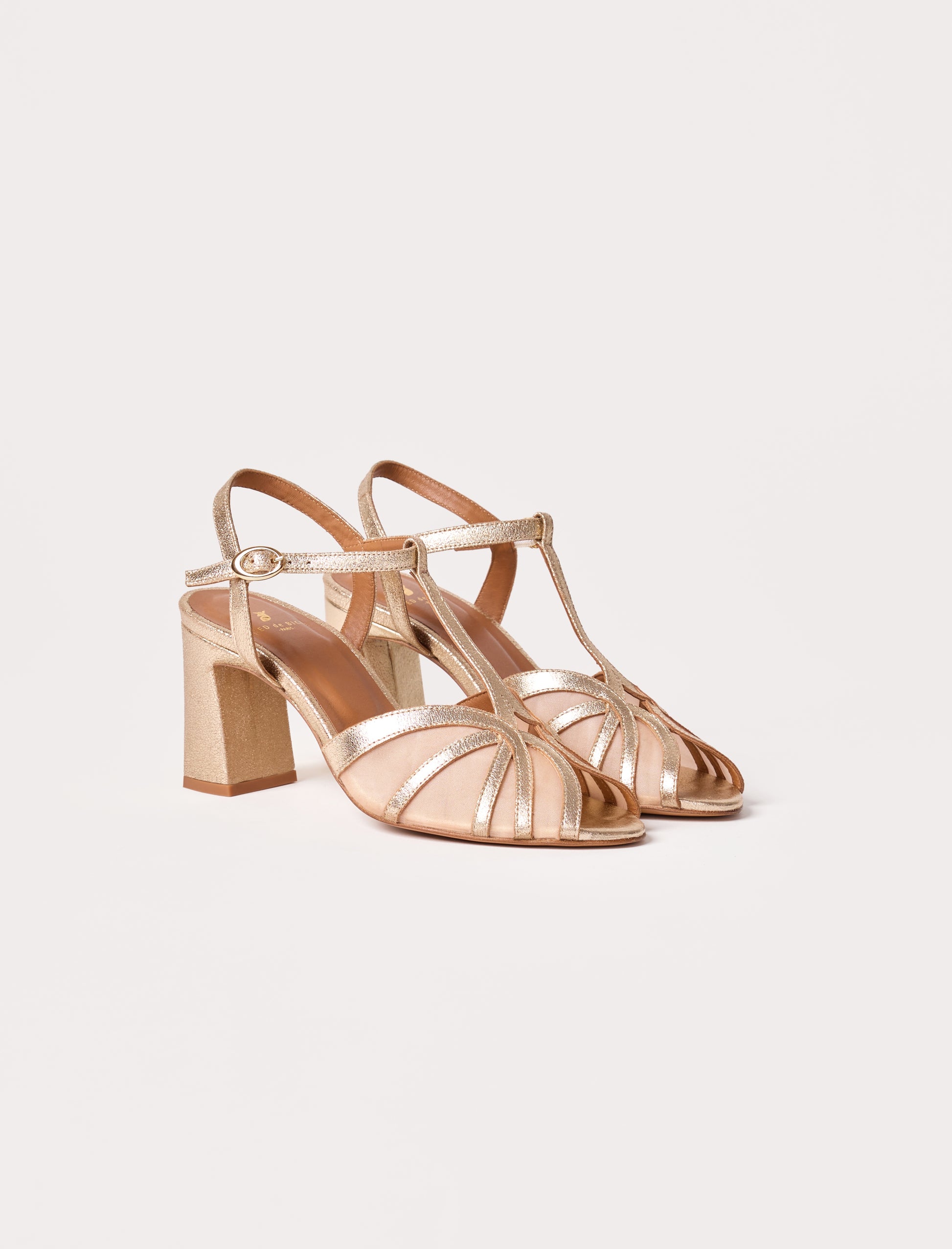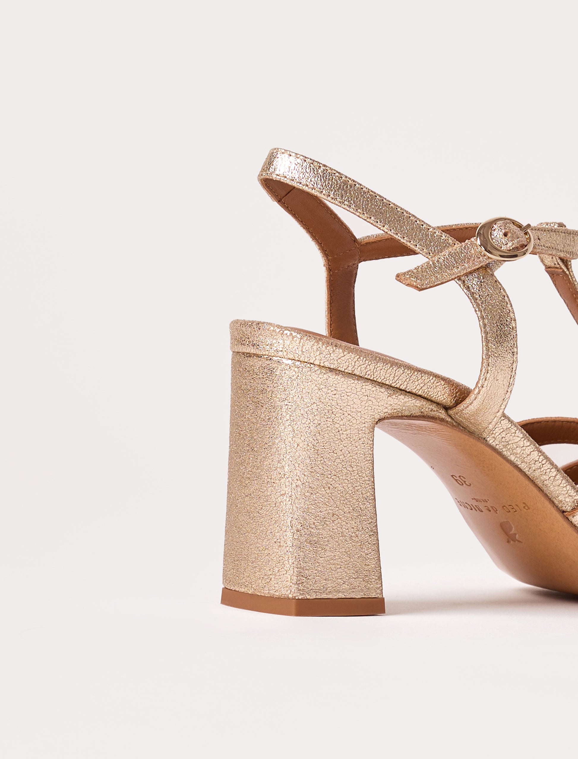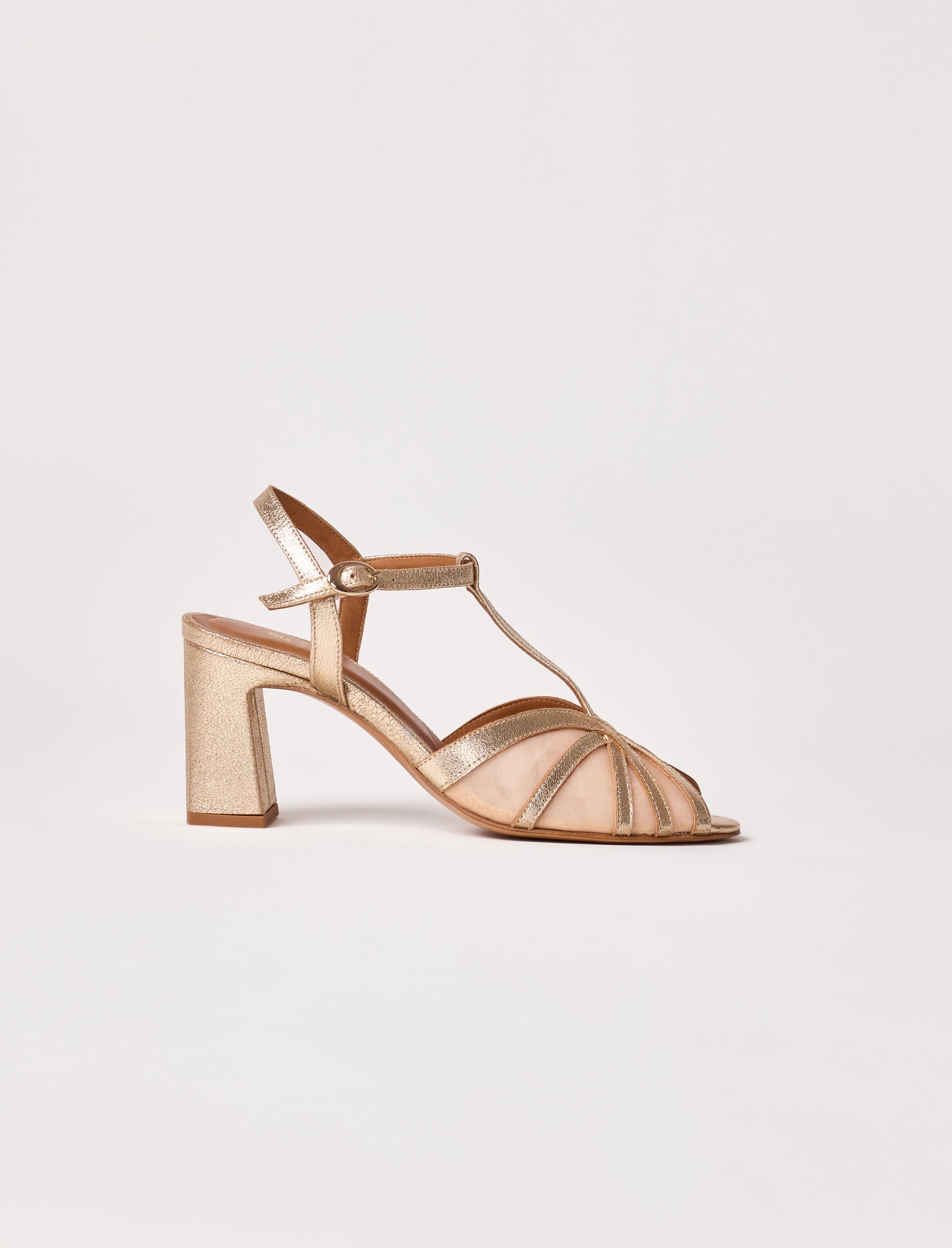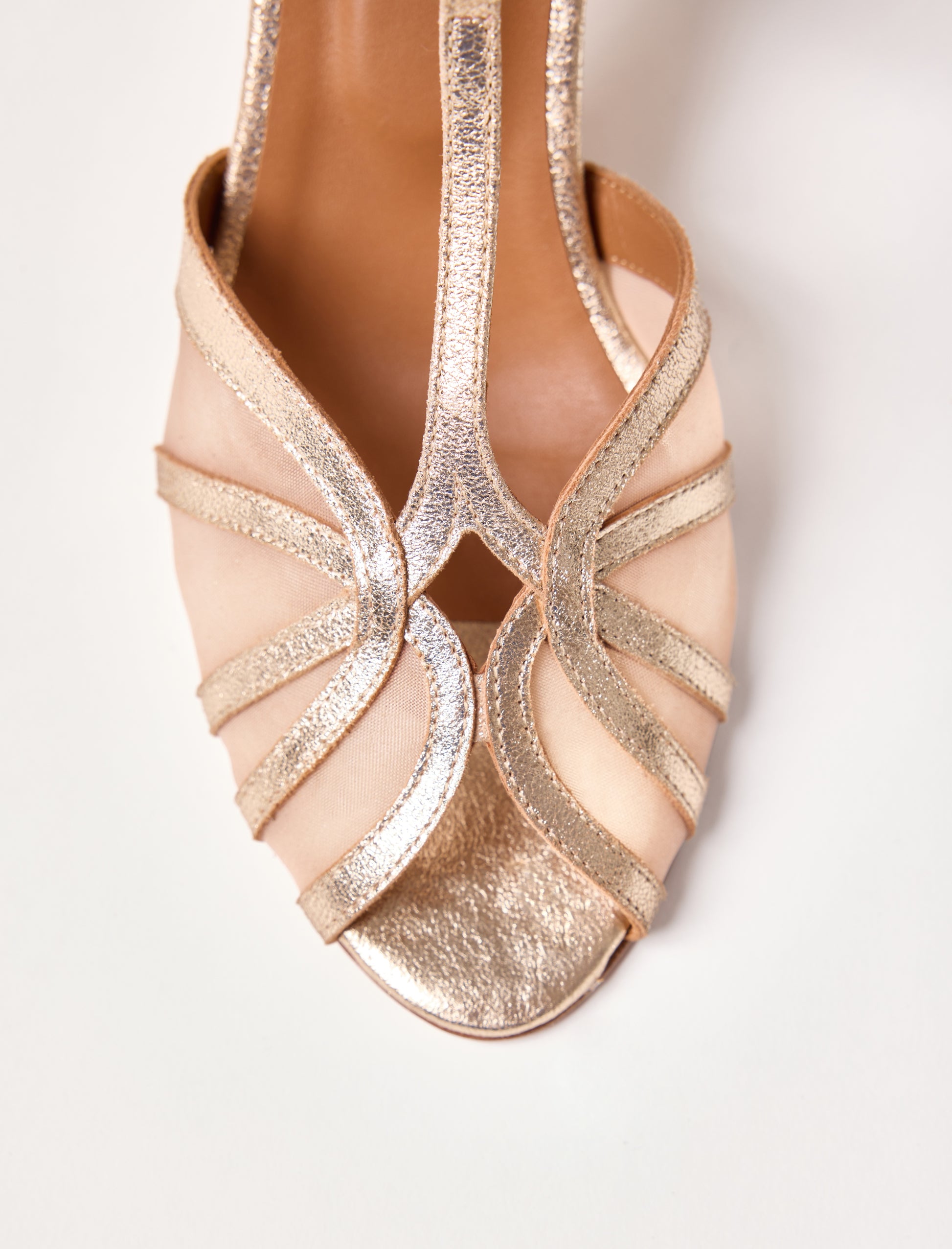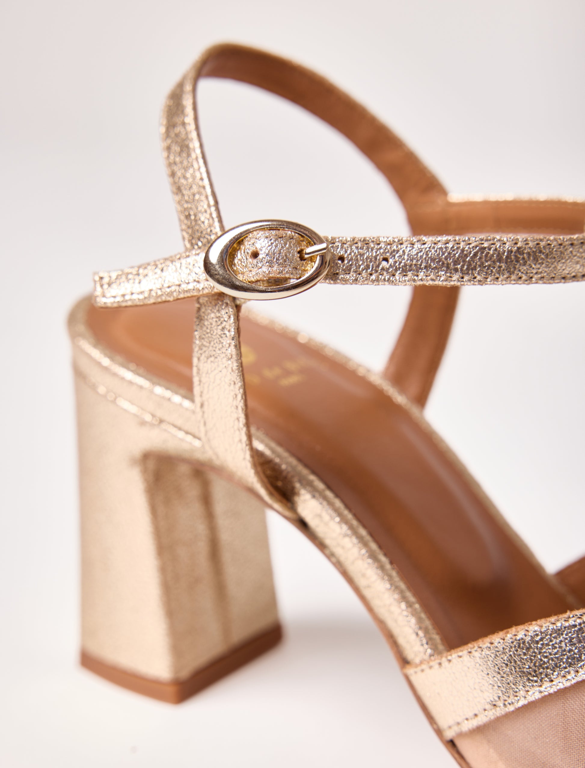 - Sandales à talons en cuir lamé de chèvre, rehaussées d’empiècements en crinoline sur l’avant, confectionnées en France
